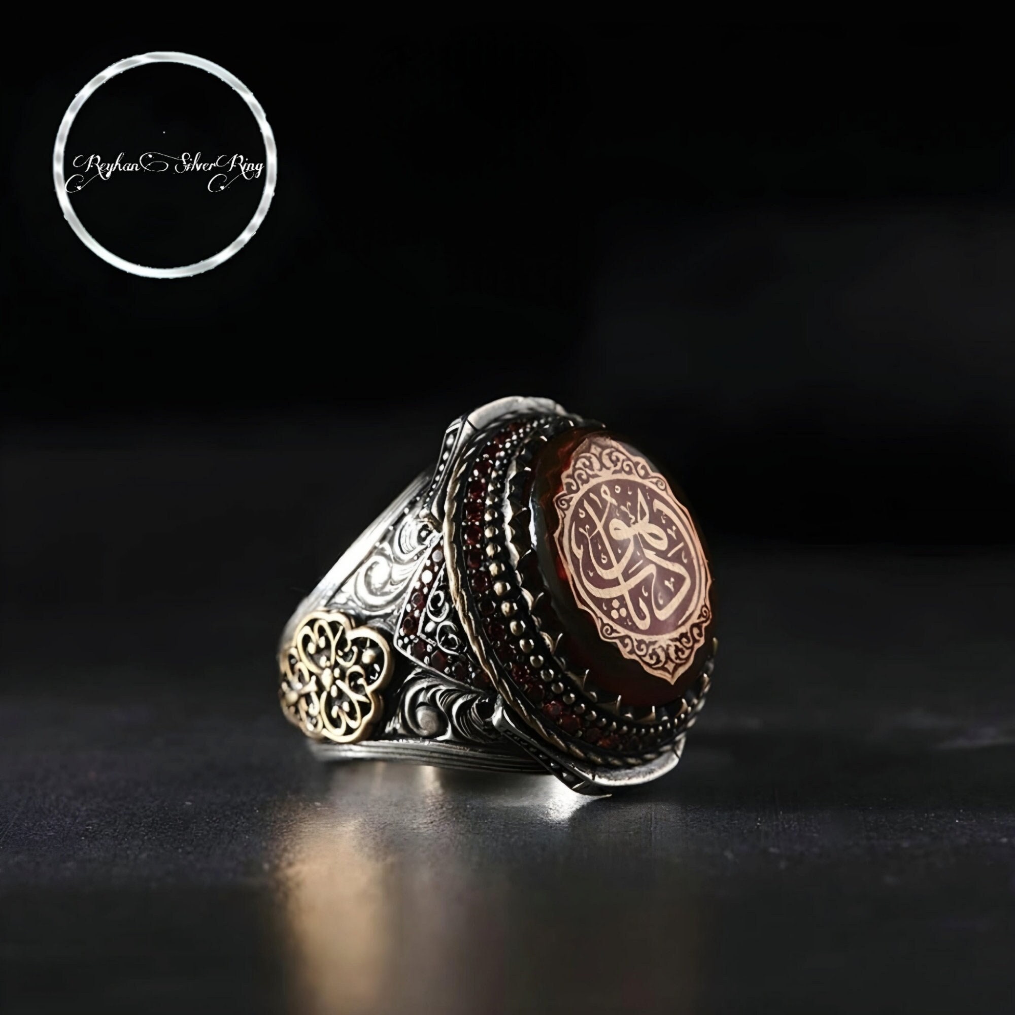 Peace Red Amber Stone Oval Silver Men's Ring, Carved Ring, Micro Stone Ring, Calligraphy Ring, Name Ring, Islamic Gift Men's Rings