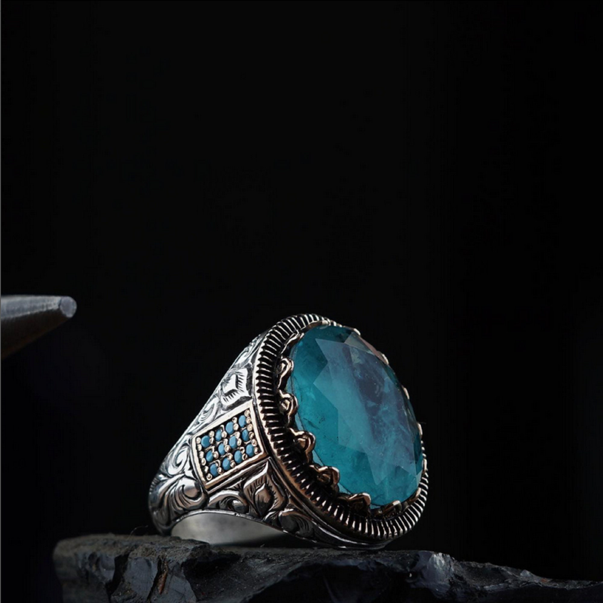 Handmade Paraiba Tourmaline Silver Men's Ring, Minimalist Ring, Hand Pen Embroidered Ring, Summer Gift Jewelry Ring