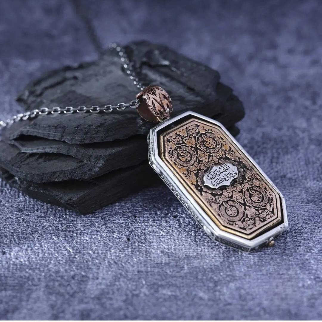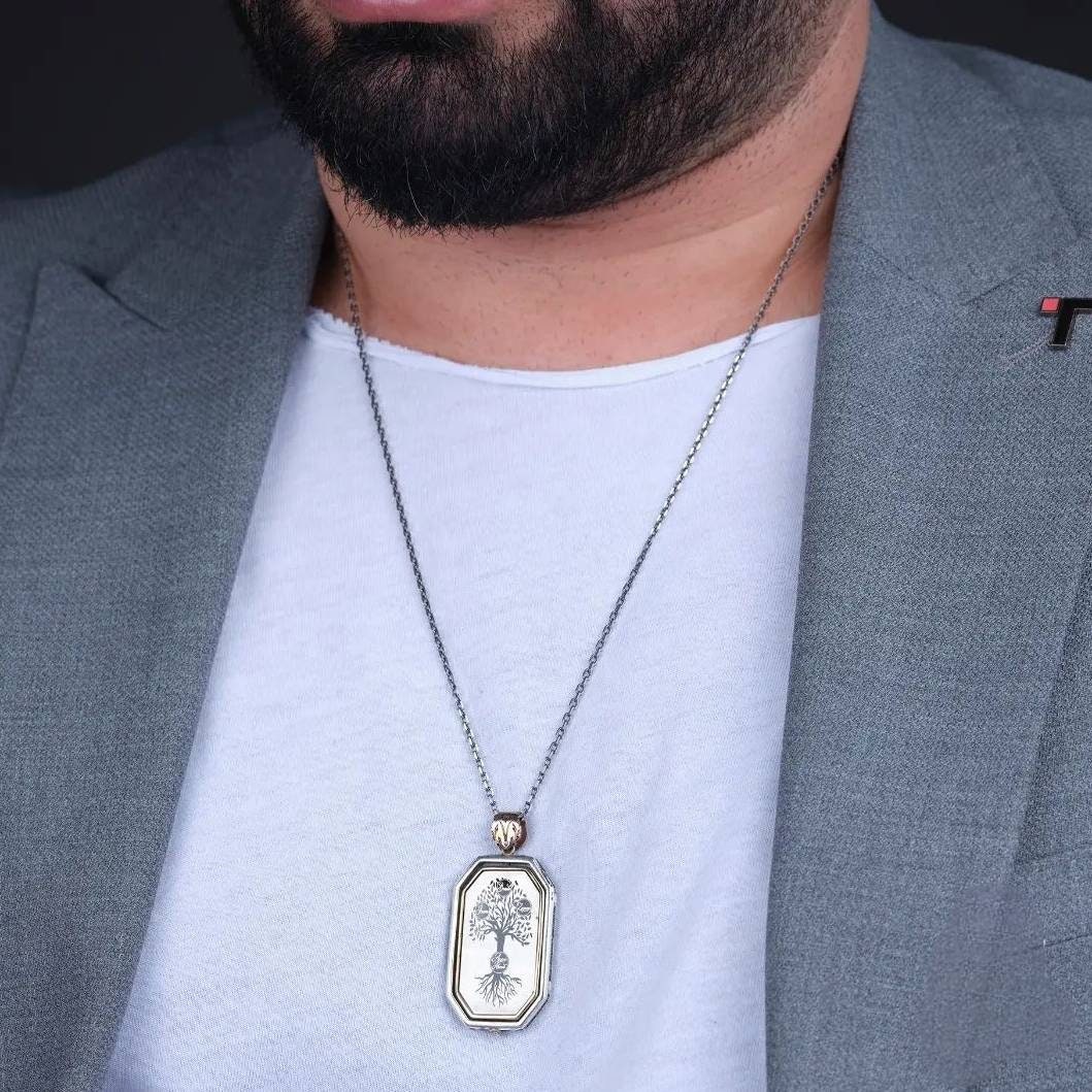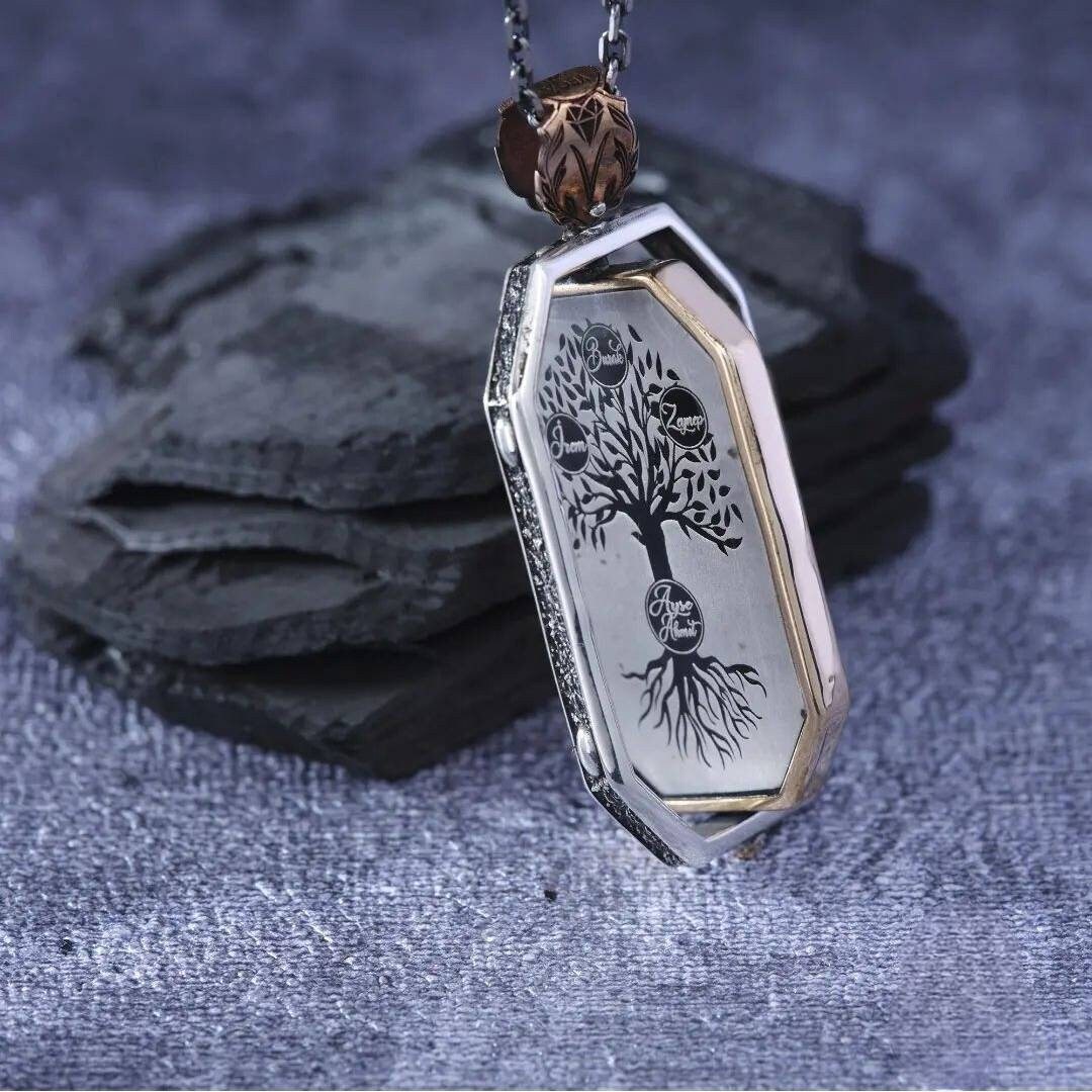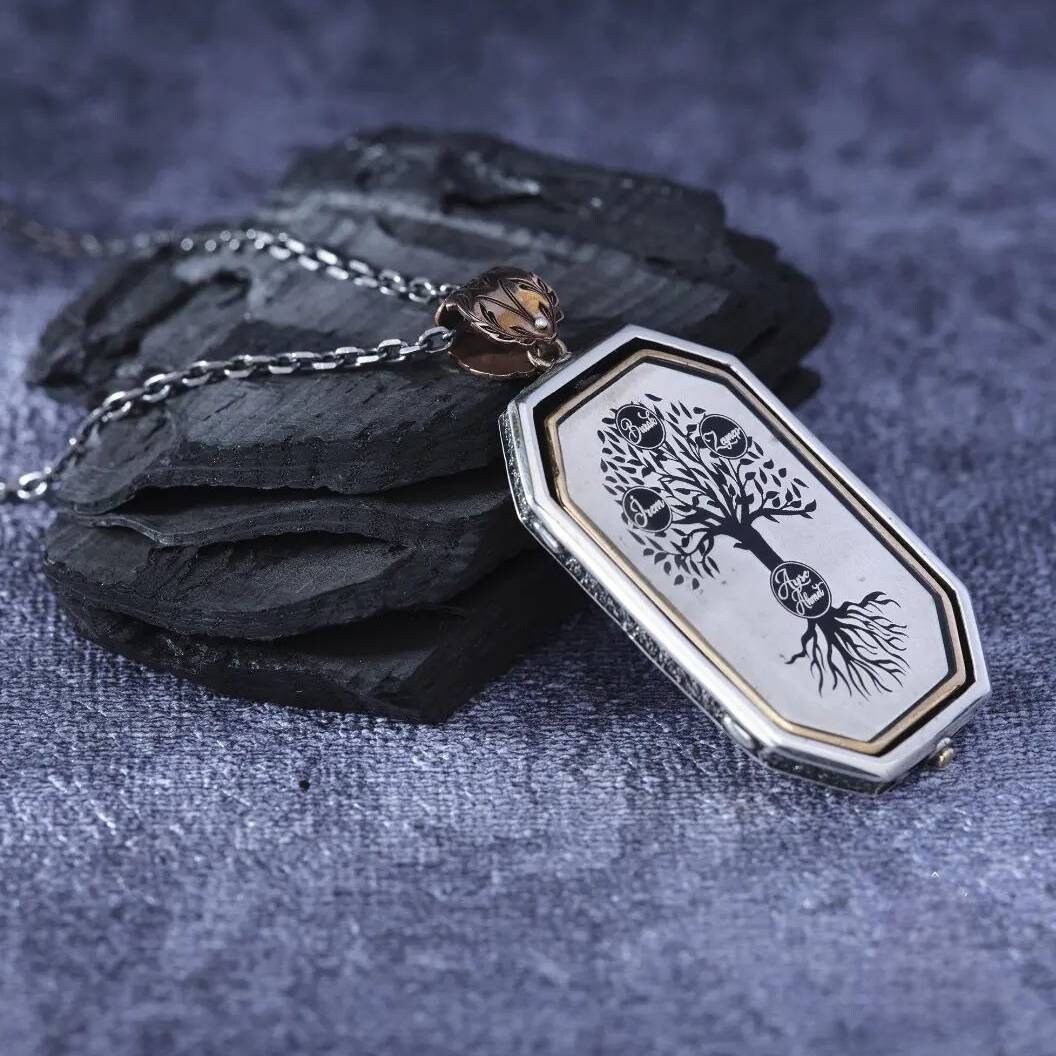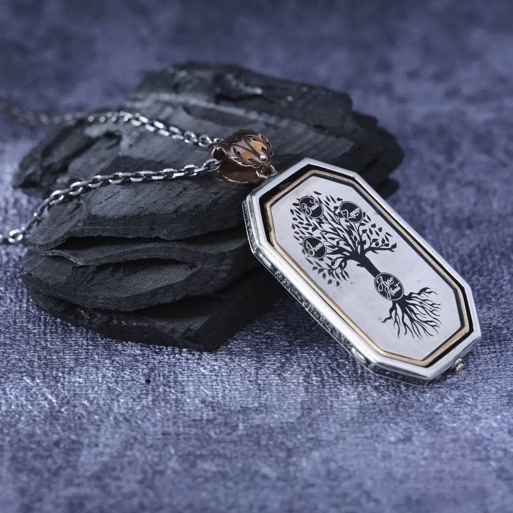 Our two-way revolving locket necklace model from Vega Jewelry is prepared with fine workmanship and "Family tree family names" are embroidered on one side.