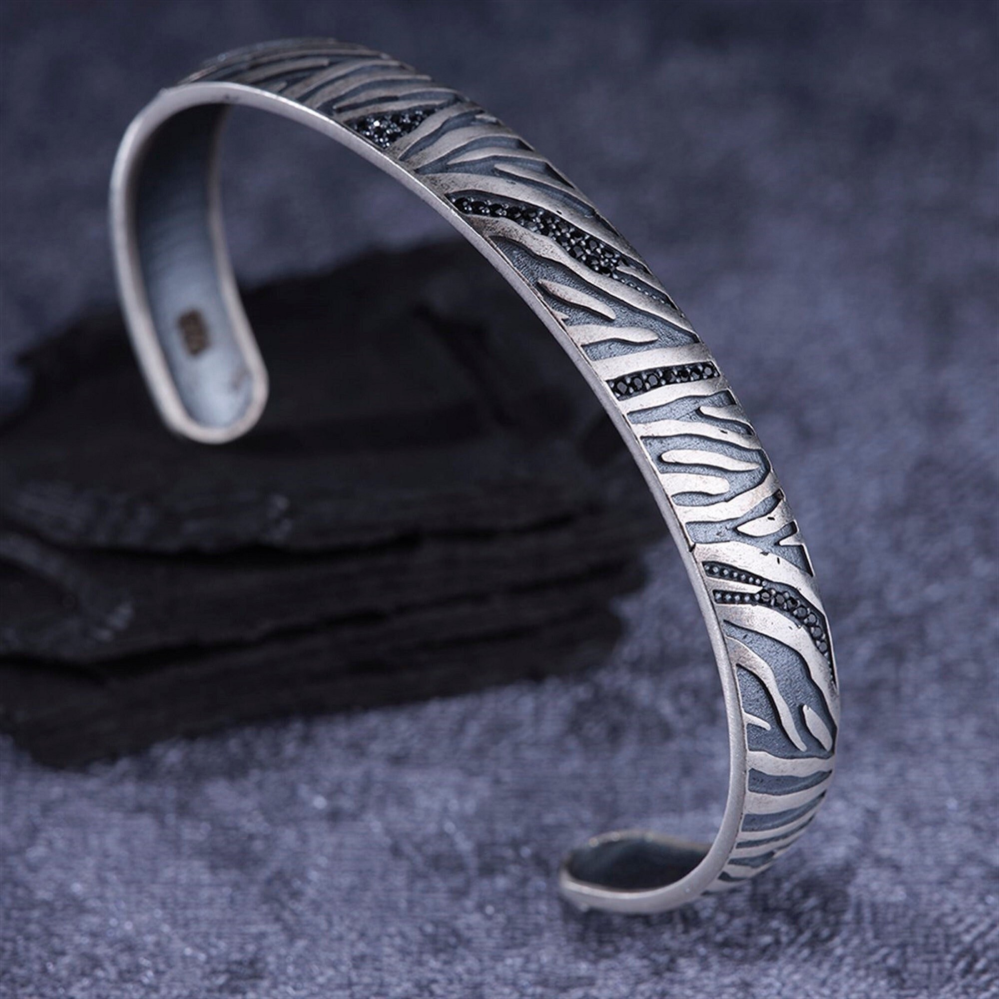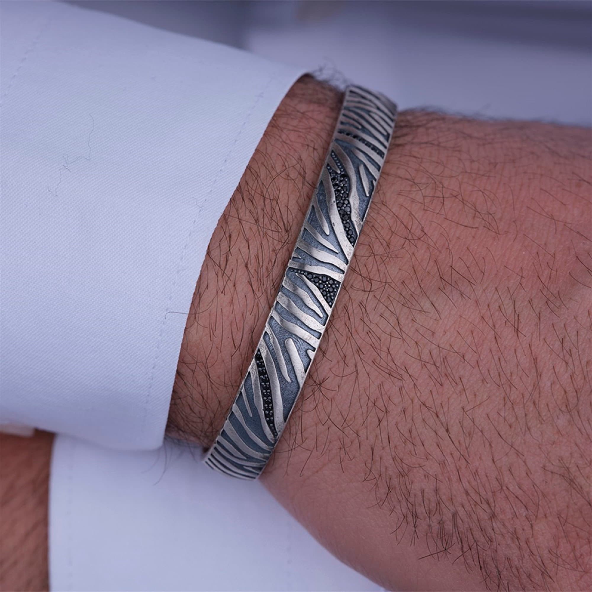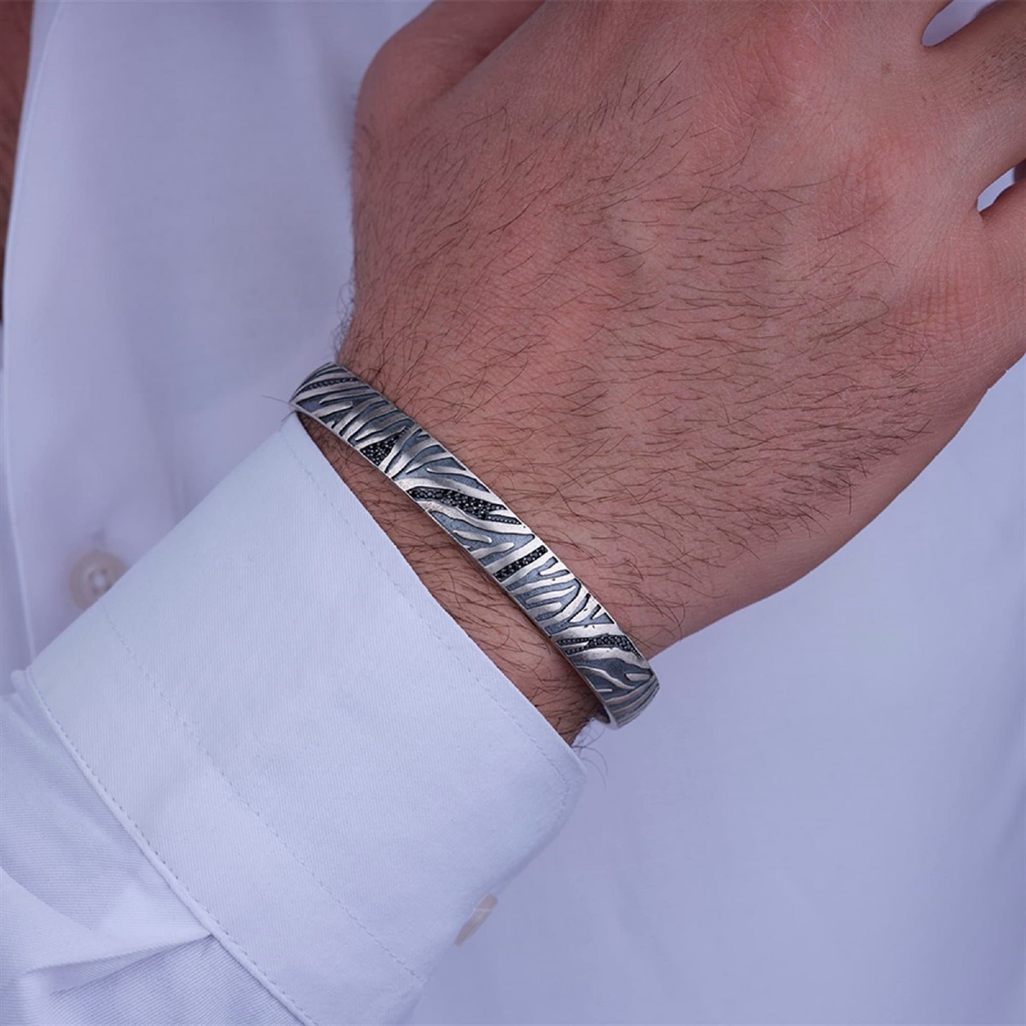 This elegant 925 sterling silver men’s bracelet is crafted with a unique pattern inspired by natural textures and detailed micro zircon stones. Designed as an adjustable open cuff, it combines timeless style, masculine energy, and handcrafted artistry—making it a perfect gesture to yourself or a meaningful gift to someone special.