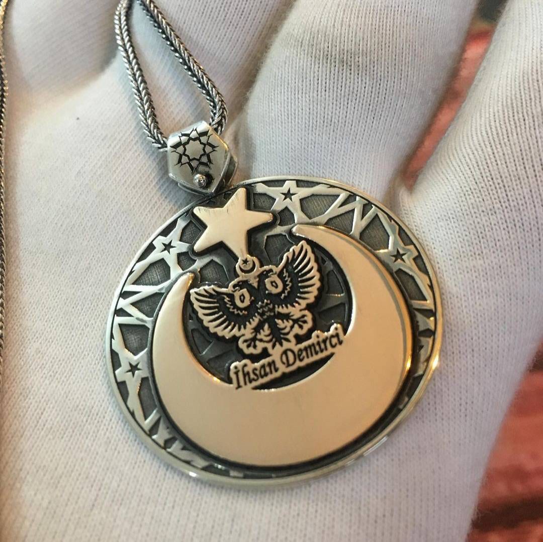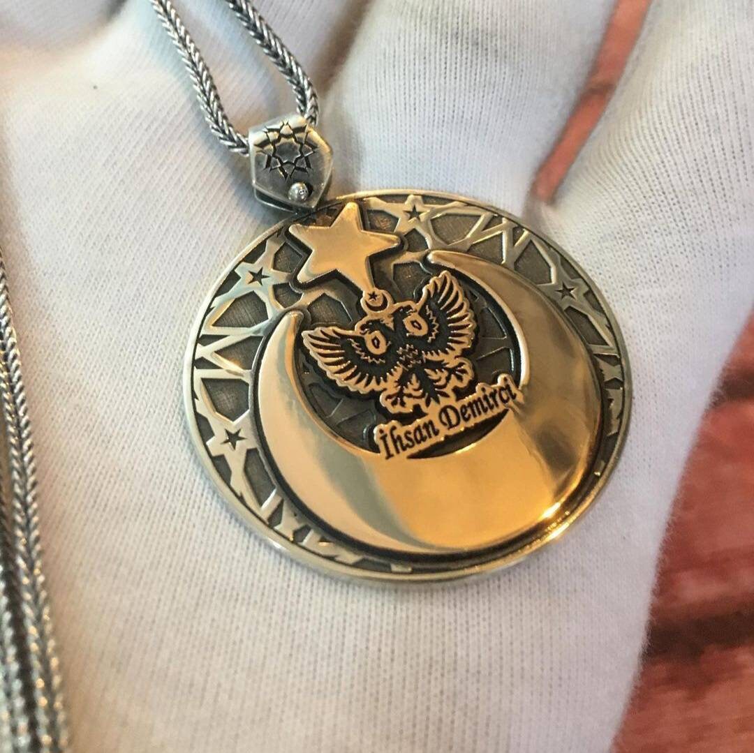 Personalized 925 sterling silver medallion. Double-headed eagle, crescent and star are engraved on our product. Personalized letter logo design is done.