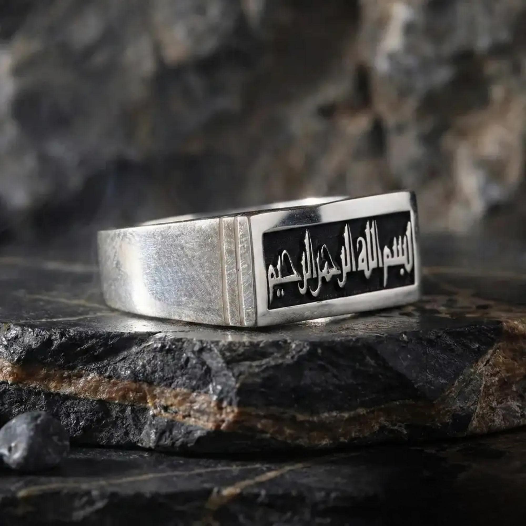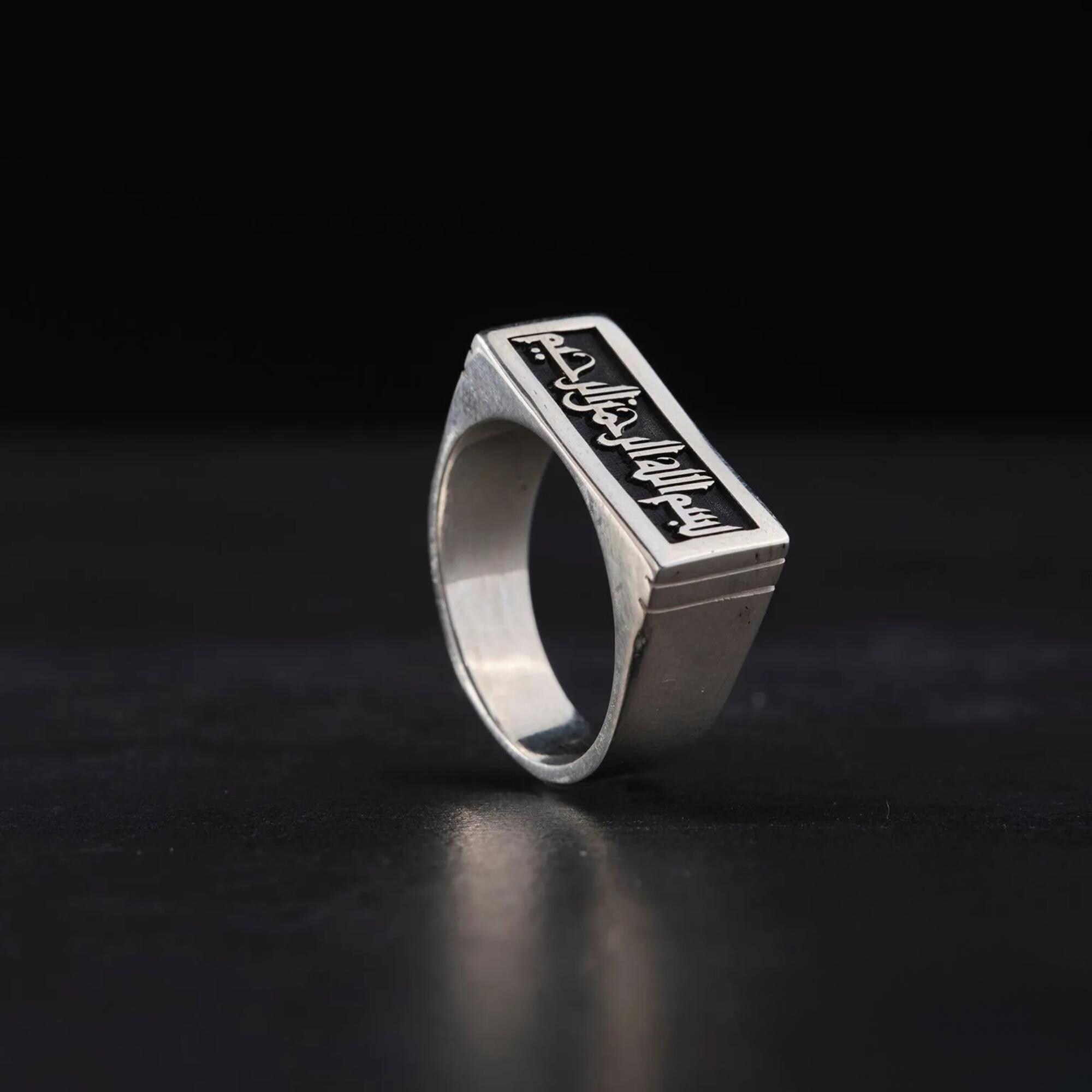 This handcrafted men's ring features the Bismillah (In the name of Allah) inscription, elegantly rendered in silver serif font on a dark black background, framed within a bold rectangular design. The contrast between the blackened surface and the polished silver lettering creates a striking and timeless look; designed for men who carry their faith with honor and strength.