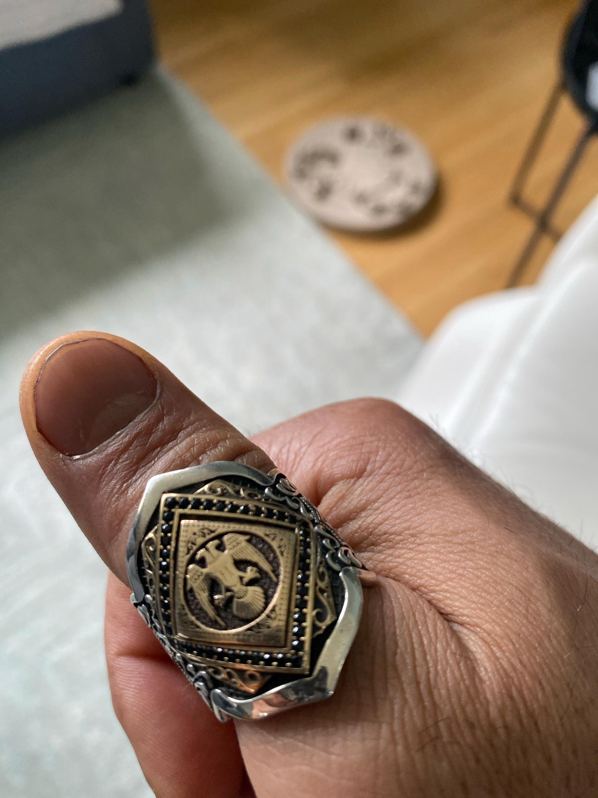 Thumb Double Headed Eagle Zihgir Black Zircon Stone Silver Men's Ring, Oghuz Khan Seal Men's Ring, Designable Archer Ring, Gift For Men