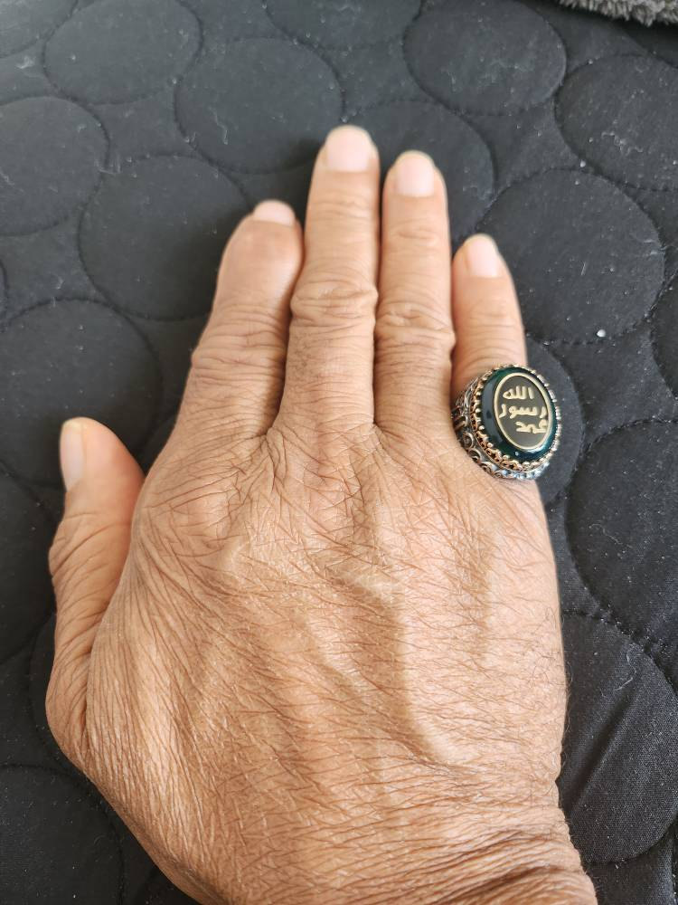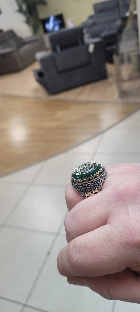 Arabic Inscription Green Amber Stone Men's Sterling Silver Ring