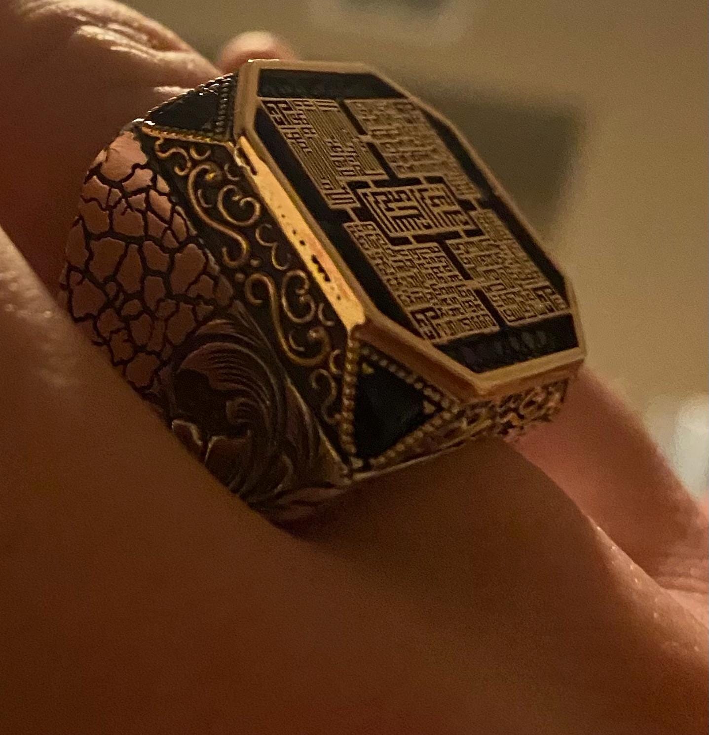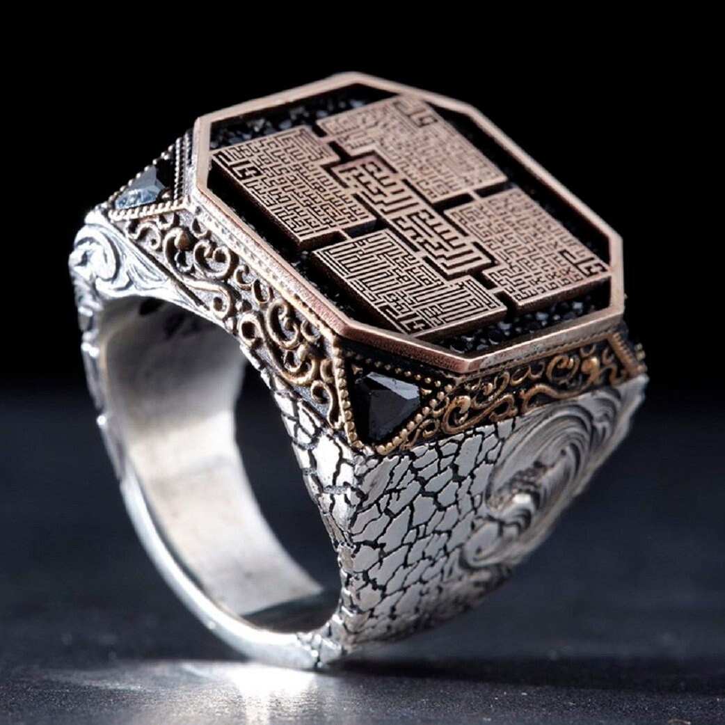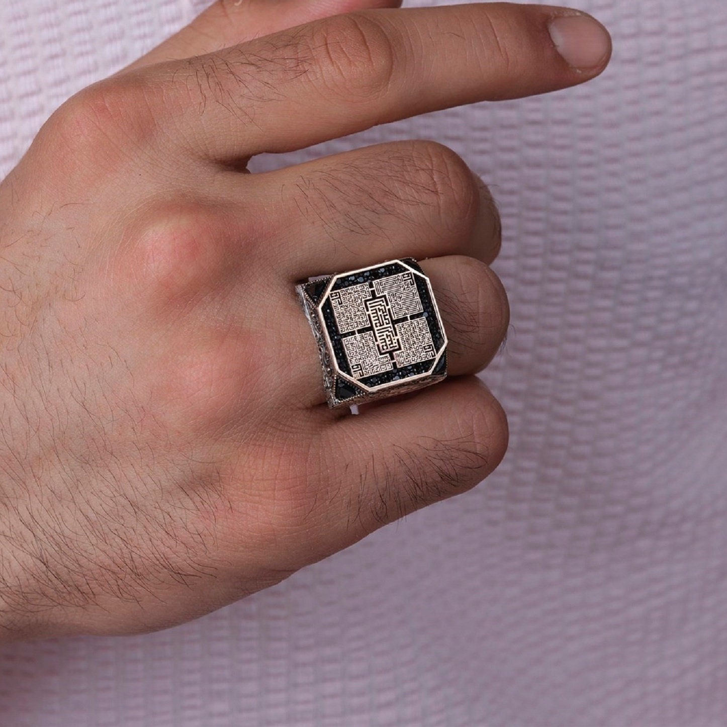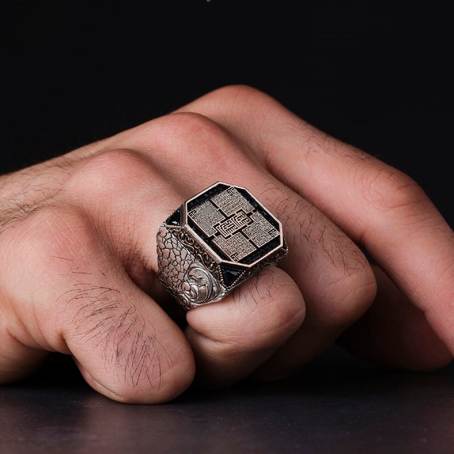 Introducing our exquisite NAS FELAK İHLAS KAFİRUN Silver Men's Ring with Kufi Calligraphy Written. Crafted with utmost precision, this ring is made from premium quality 925 sterling silver.