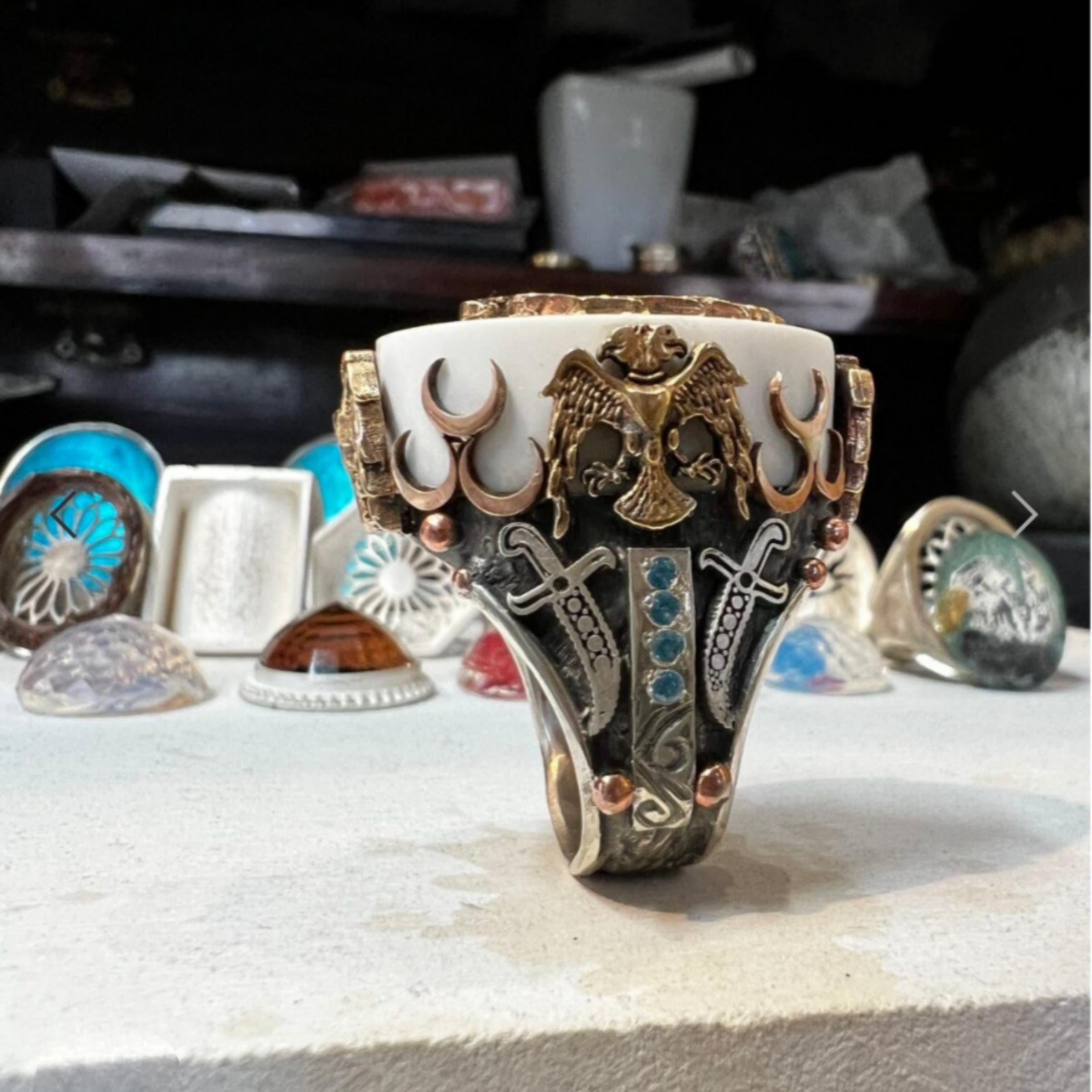 The three crescents on the sides of the ring symbolize the power, unity, and revival of Turkish-Islamic culture, while the finely crafted dagger motif is a symbol of courage, honor, and determination. Each detail is individually carved with masterful skill, making it completely collectible and unique.