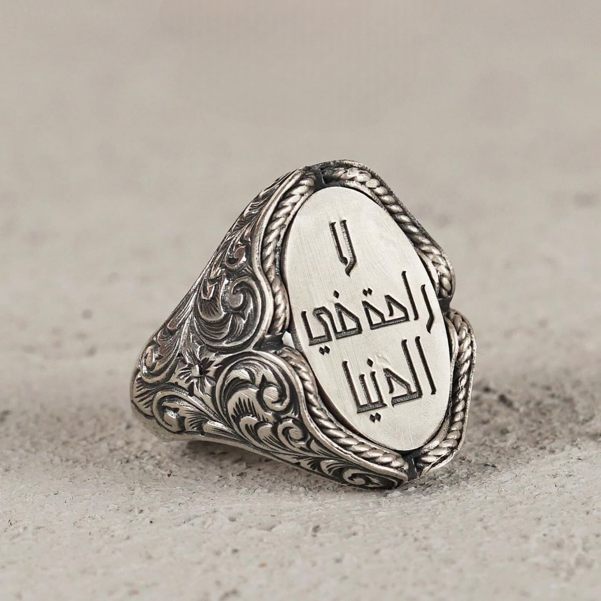The unique men's gift silver ring with Arabic engraving and patterned writing is a type of ring that is adjusted to suit every finger size, crafted by master hands.