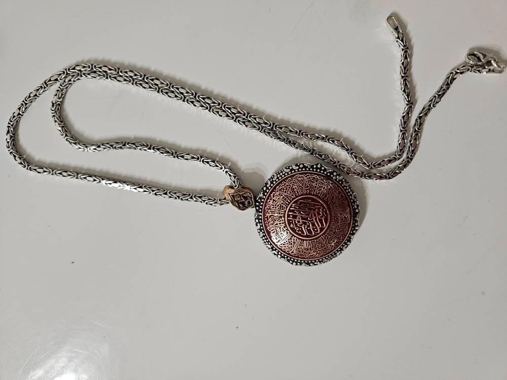 Silver Medallion Necklace with Domed Red Amber Stone Verse Al Kursi Surah Engraved