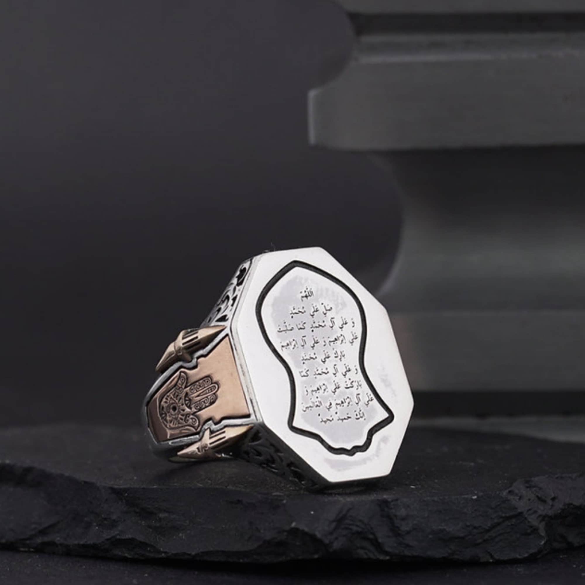 Arabic Salavat prayers are engraved on the 925 carat octagonal design silver ring.