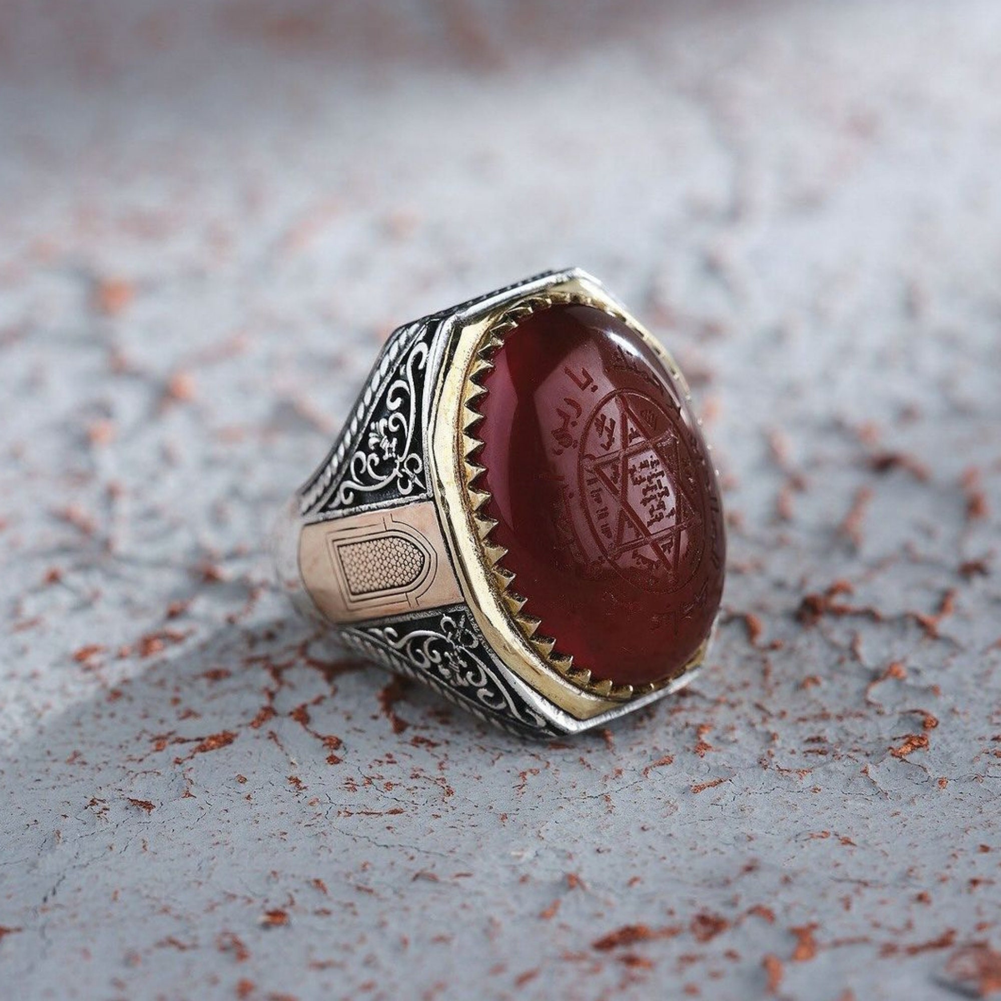 Materials: Crafted from high-quality sterling silver, featuring intricate palace gate and flower motifs on the sides, and adorned with a stunning red agate stone etched with Solomon's seal.