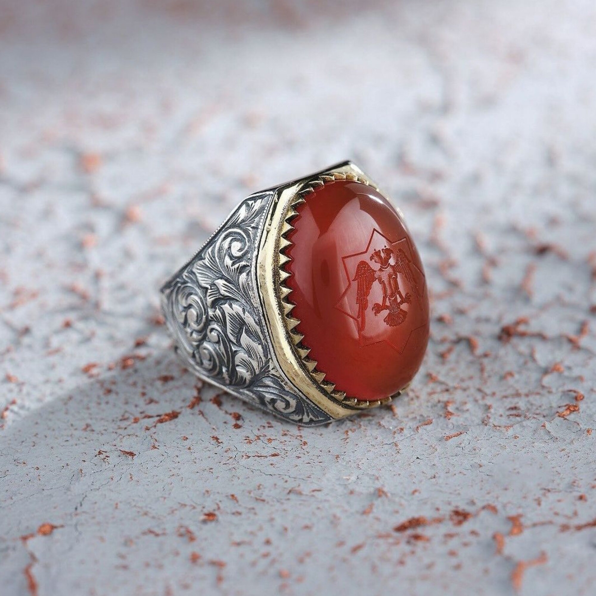 925 sterling silver men's ring with a double-headed eagle engraved on a refreshing agate stone, personalization can be done on the stone, it is shaped by handmade carving, the red stone can be changed to different colors upon request,