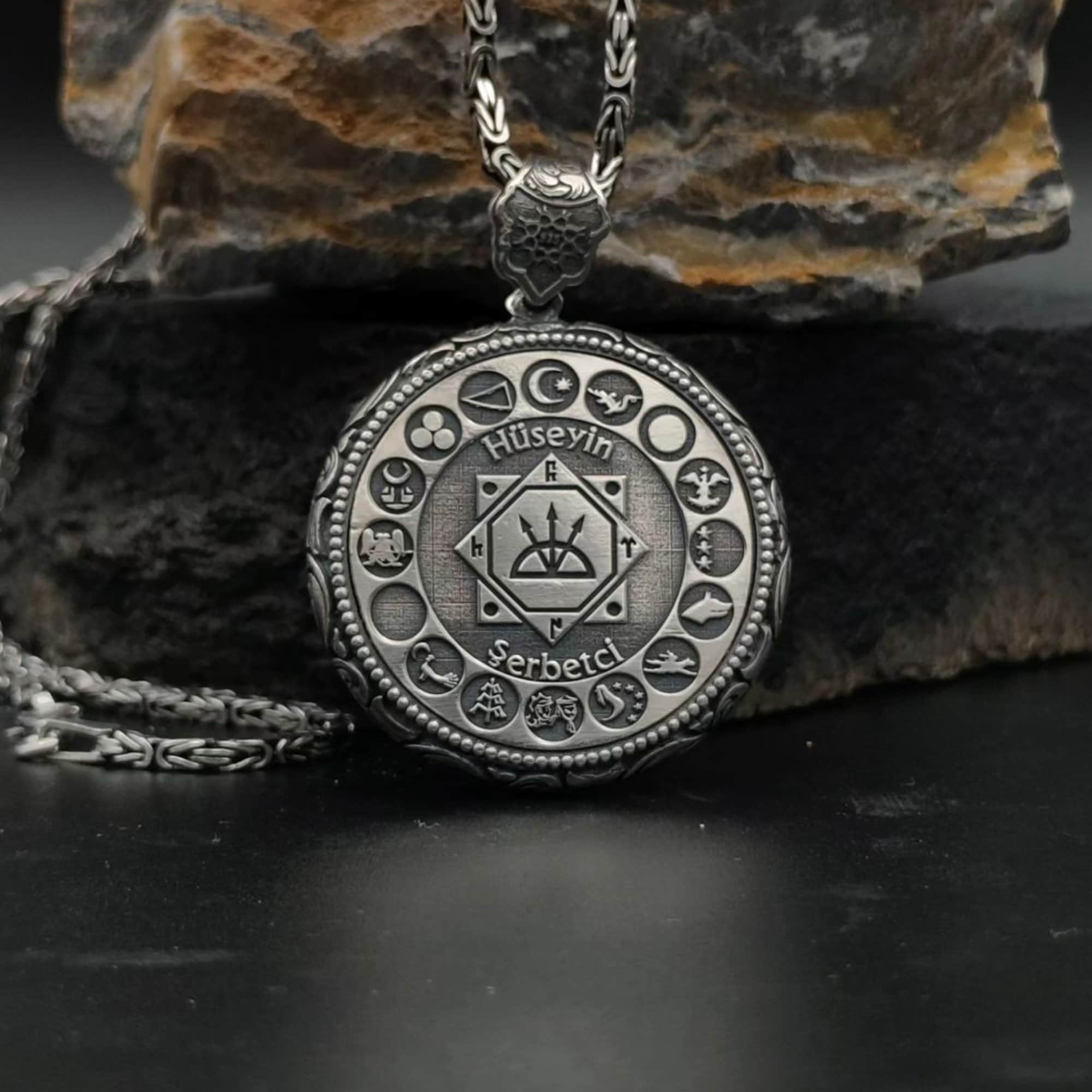 Your product is made of original 925 sterling silver and the front part is engraved with a wolf bör symbol in relief. The top of the bör is engraved with Turkish script in Göktürk. On the back of the medallion, the Oguz Kagan seal in the centre and the symbols of 16 Turkish states around it are engraved. Personalised name and surname can be specially designed. Personalised letter logo name design is made.