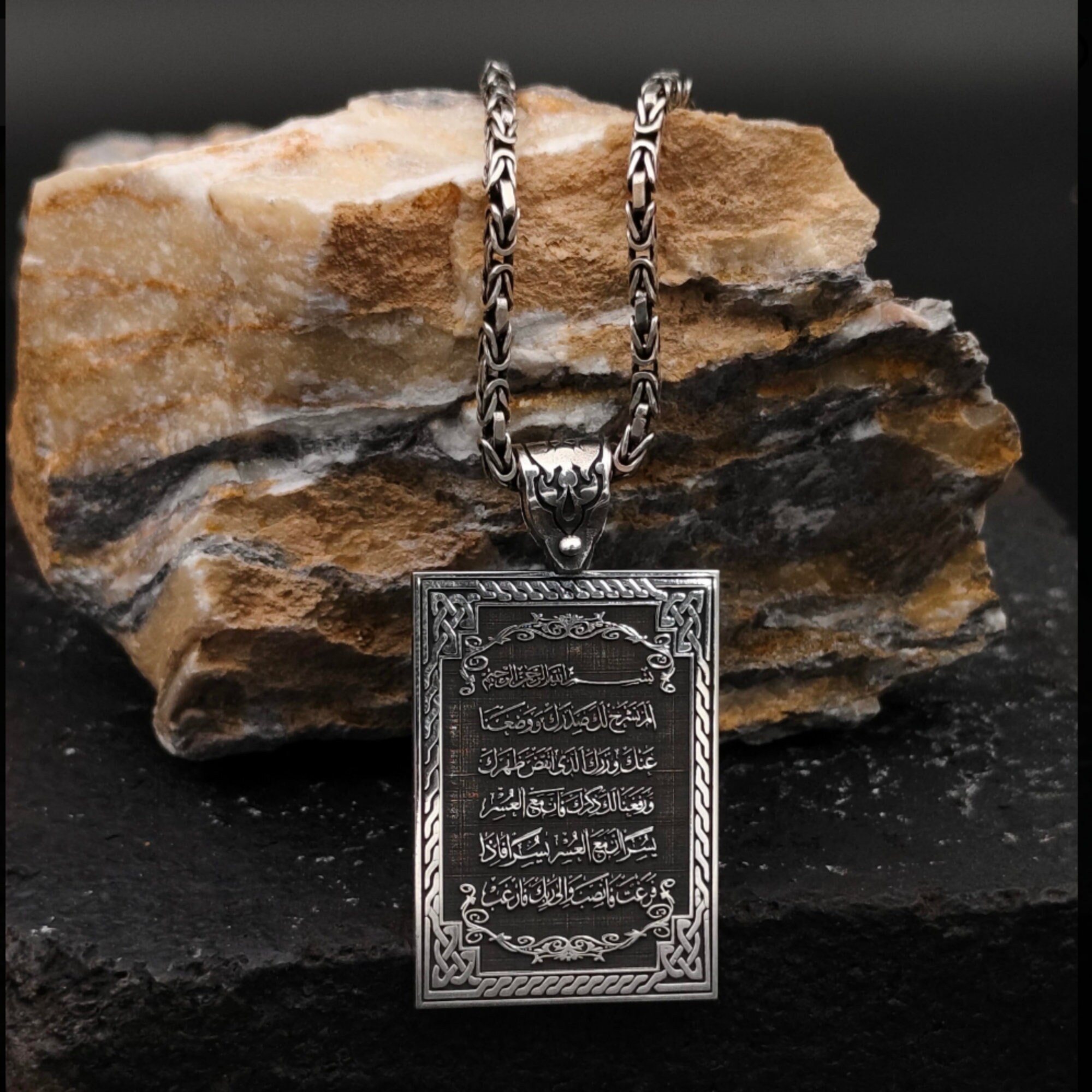 The double-headed eagle symbol on the front side of our silver necklace and the symbol of relaxation and happiness on the back side.