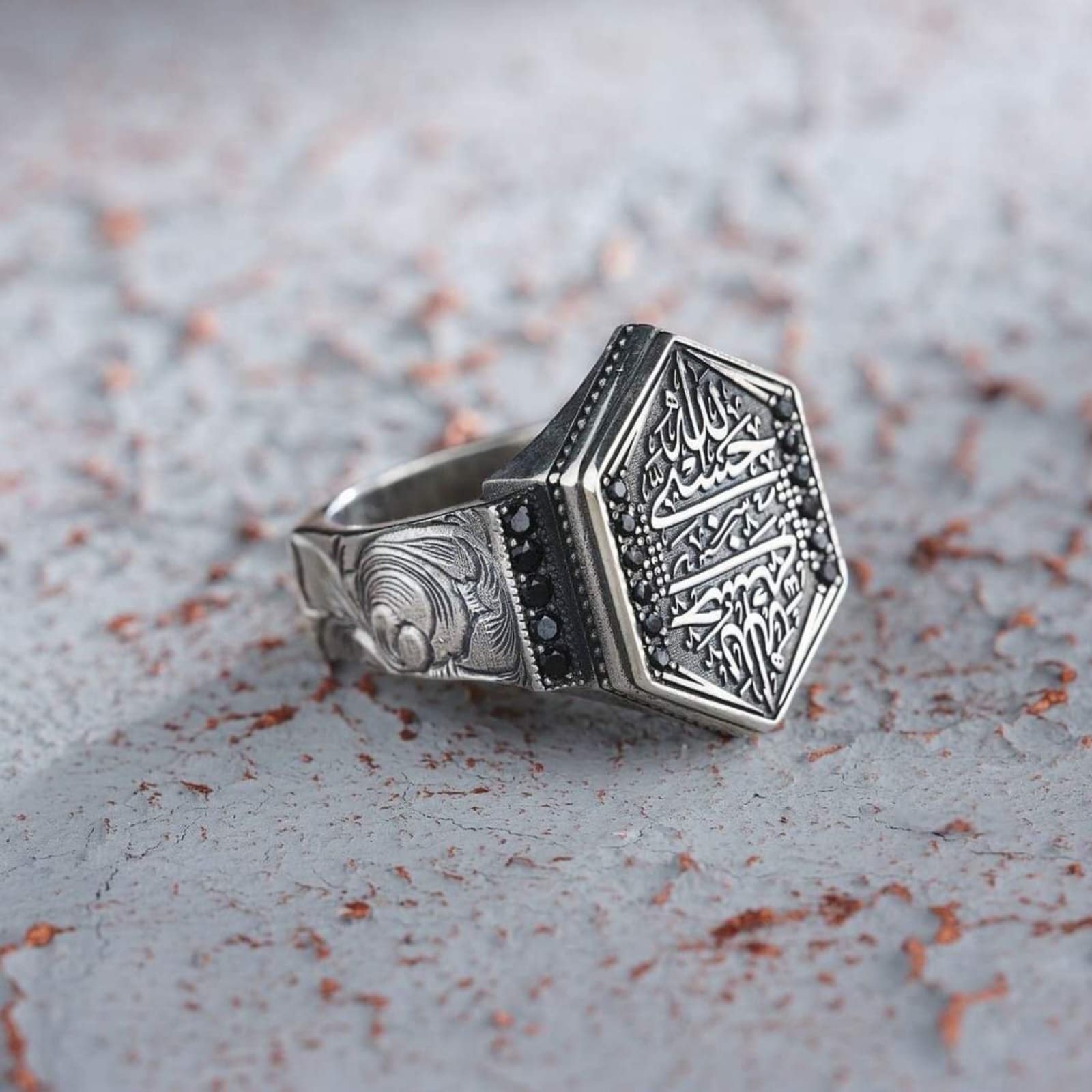 Wrap your faith around your finger with this beautiful silver ring featuring the phrase "hasbinallah", which means "Allah is sufficient for me" in Arabic Islamic letters.