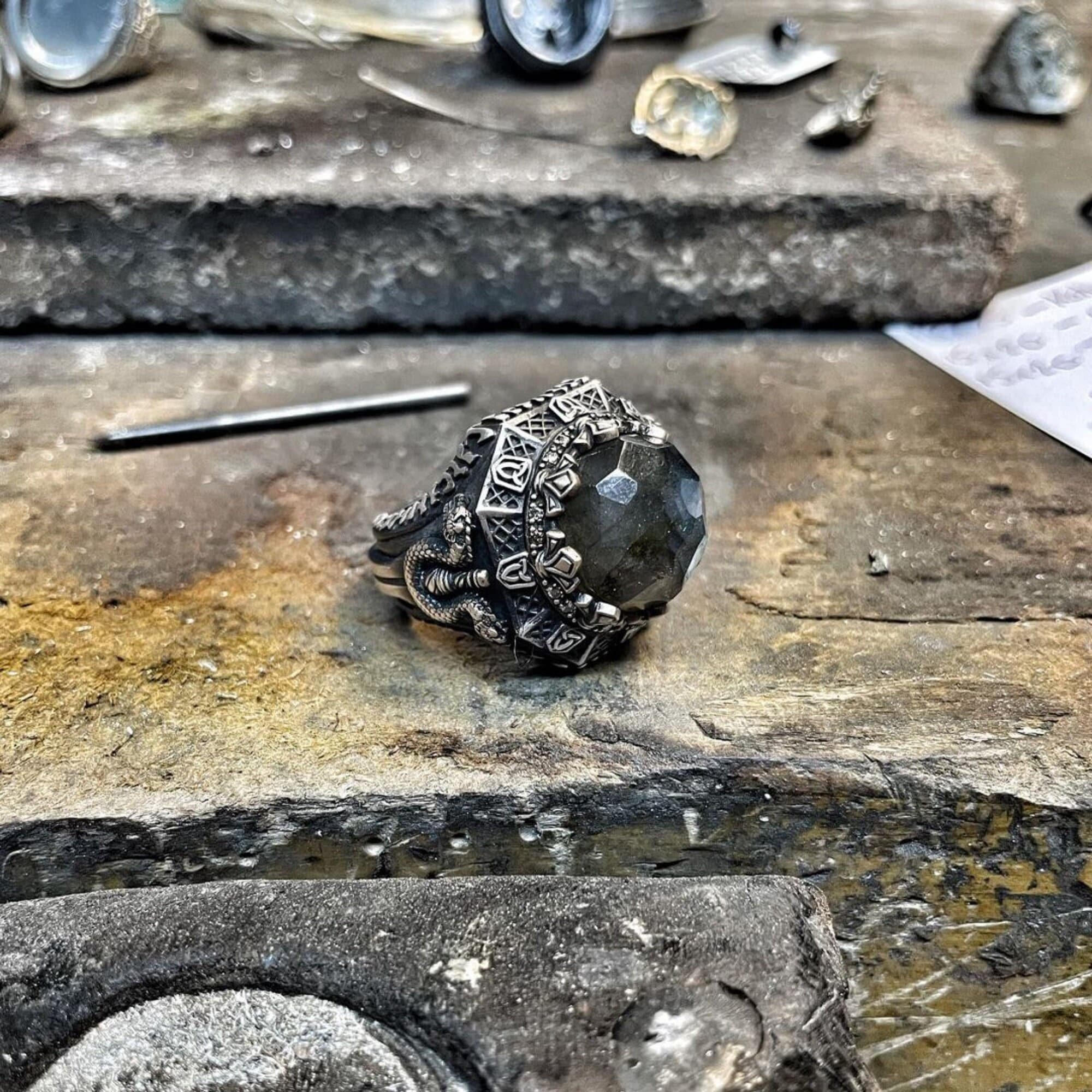 The captivating labradorite stone reflects light with subtle flashes, giving the ring a mystical and sophisticated look. Each piece is individually handcrafted, ensuring that your ring is truly one of a kind.