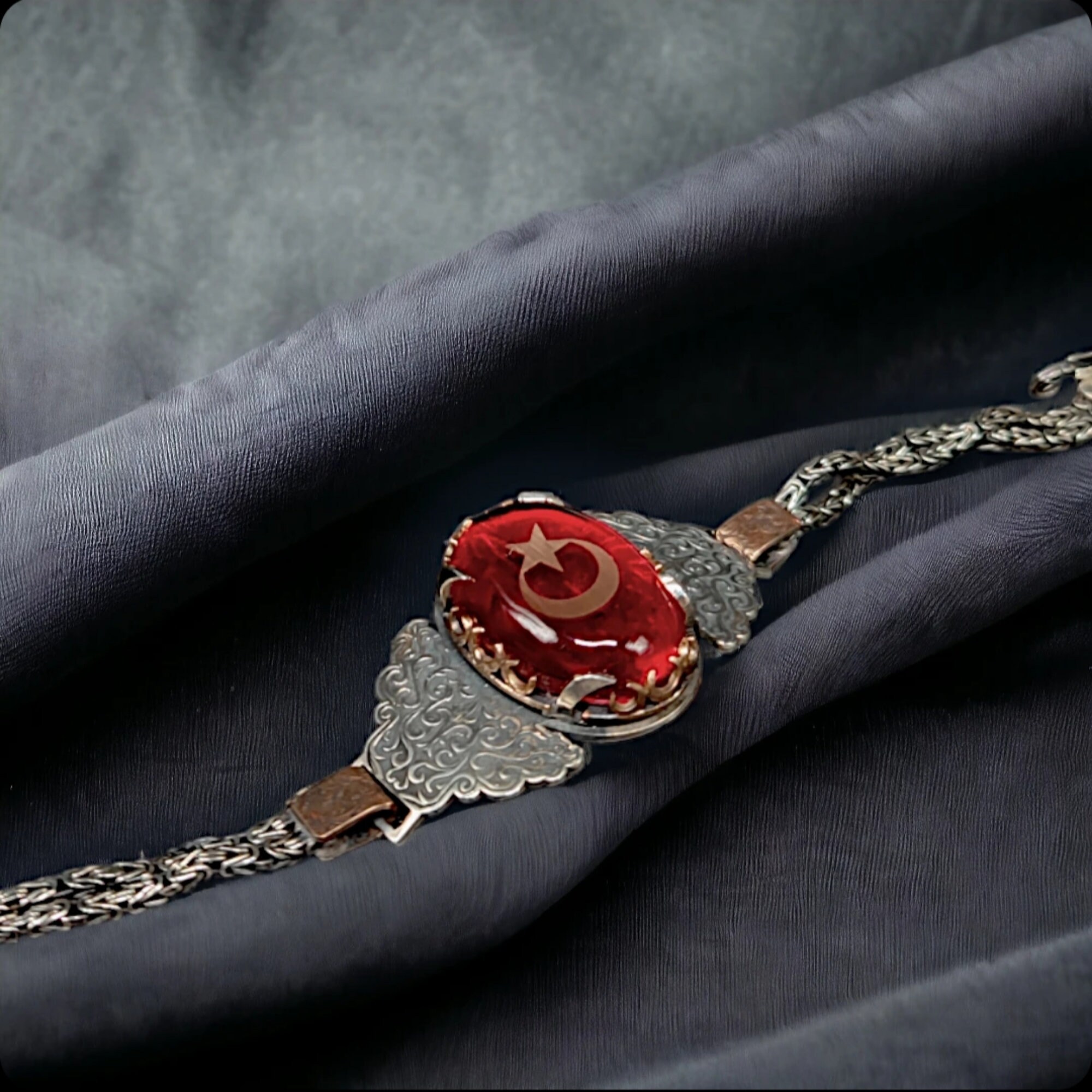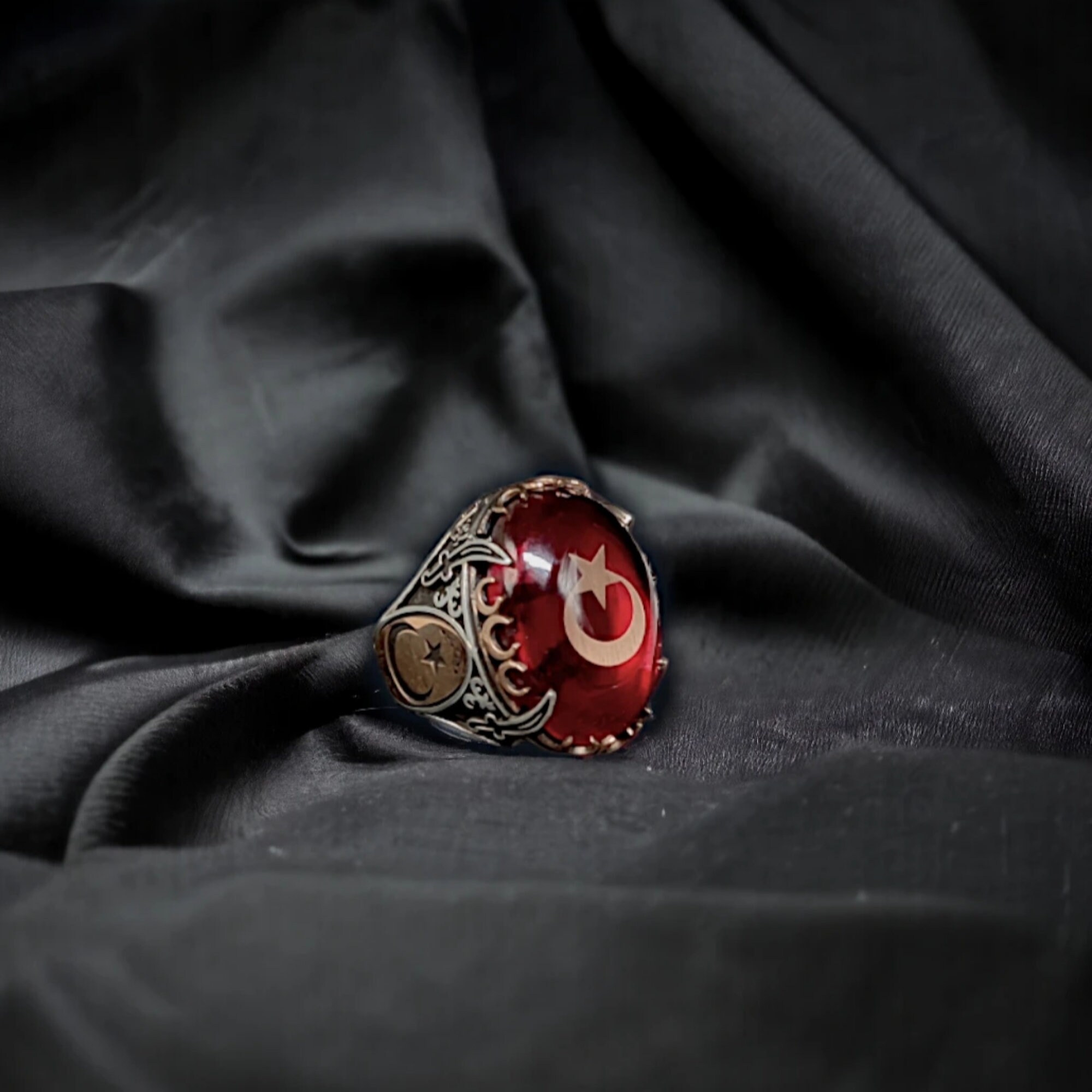 The named Moon and Star motif engraved in red fire amber adds a unique touch to the bracelet and ring.