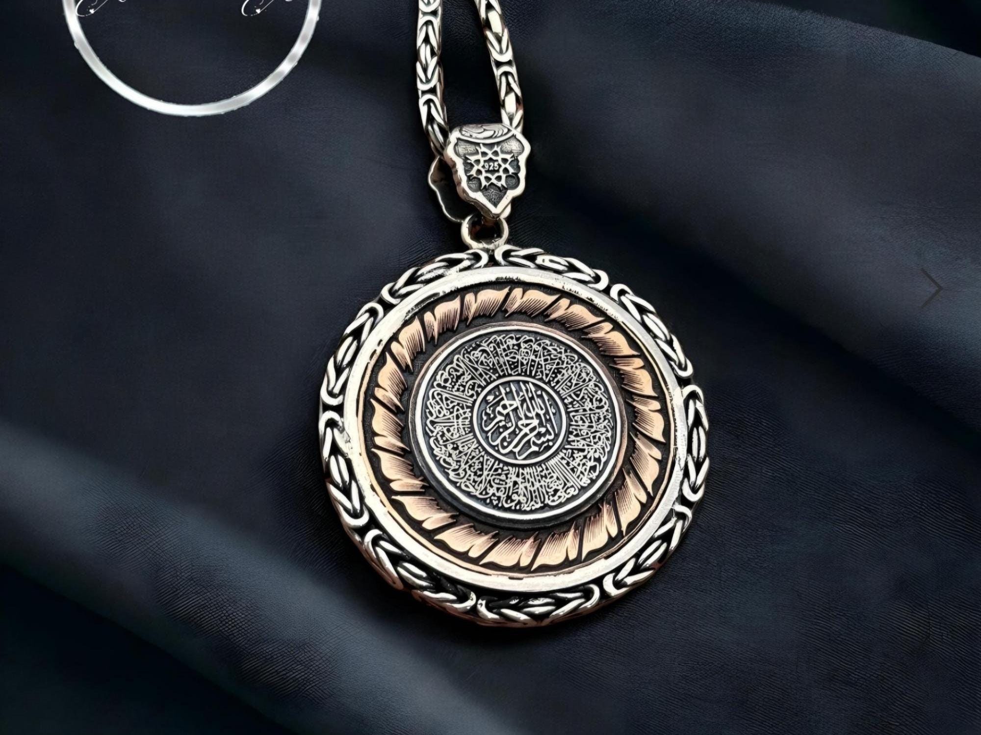 Ayetel Kürsi Engraved King Medallion Necklace is made of 925 sterling silver and weighs 44 grams with chain and 27 grams without chain.