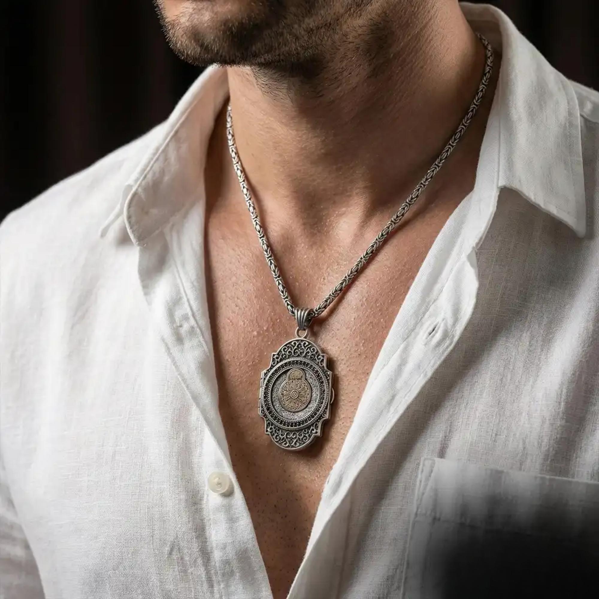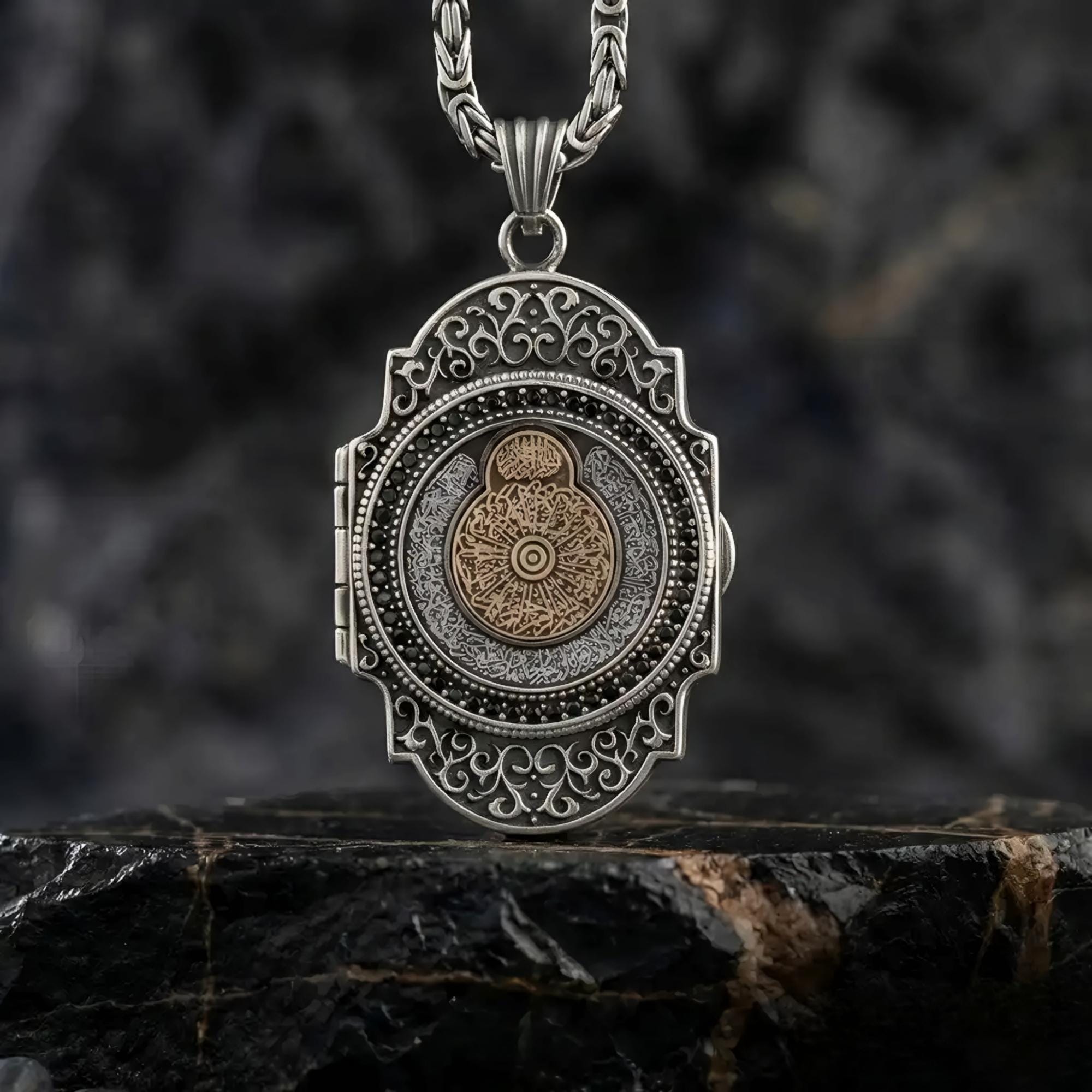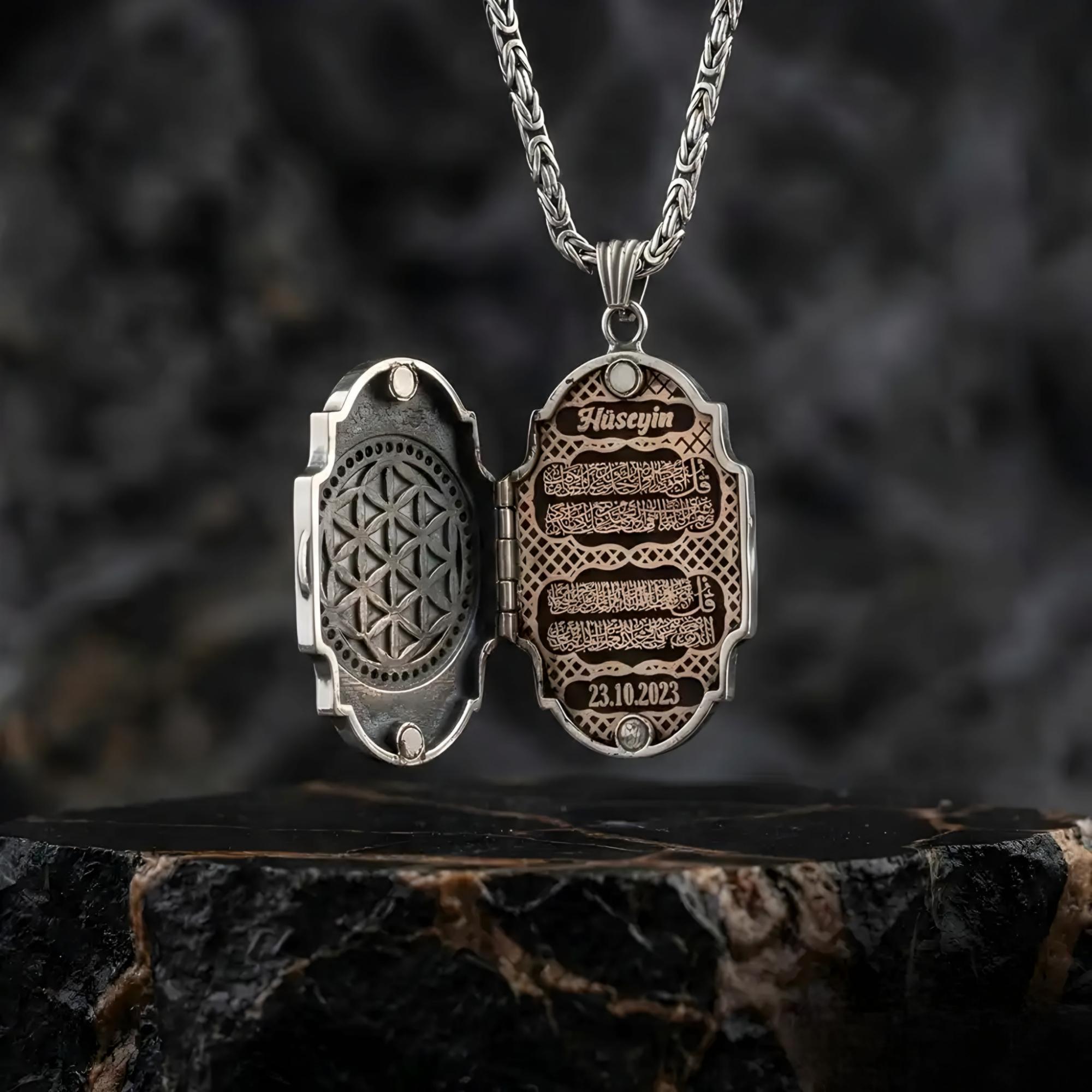 This unique 925 sterling silver Islamic pendant features intricate engravings for spiritual protection and personalization.