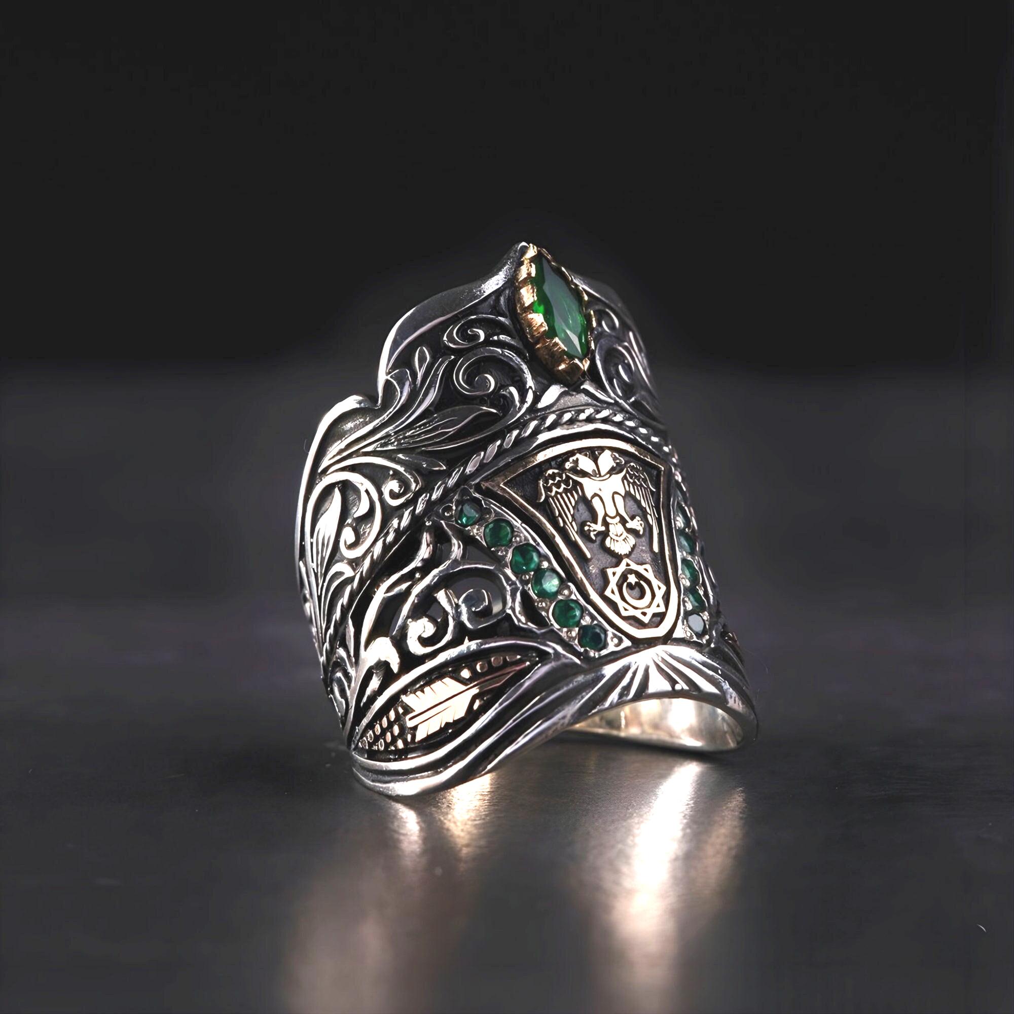 This adjustable 925 sterling silver zıhgir thumb ring blends ancient warrior heritage with modern craftsmanship. At its center stands the powerful double-headed eagle, a timeless symbol of Seljuk authority, strength, vision, and protection. More than a motif — it represents leadership, courage, and unbreakable spirit.