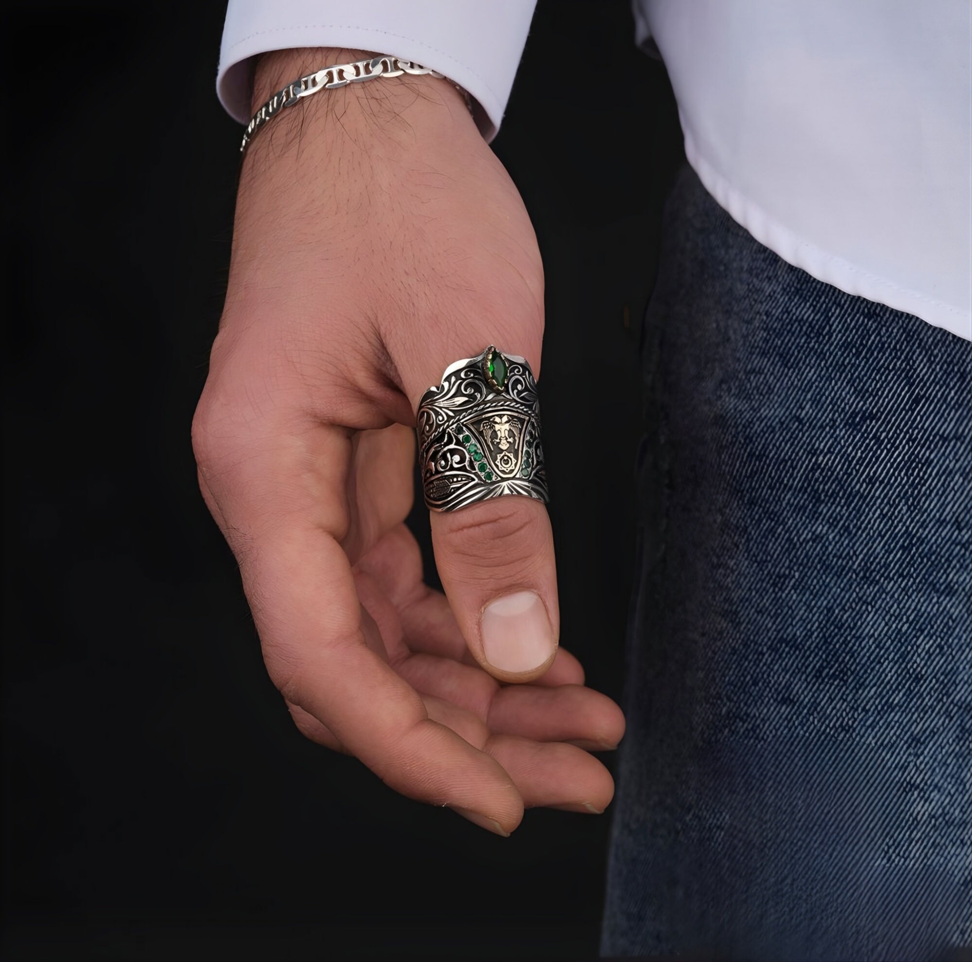 Adorned with green zircon stones on each side, the ring carries a noble brilliance. Green symbolizes balance, prosperity, and inner peace — making this piece perfect for anyone who wants to combine strength with elegance.