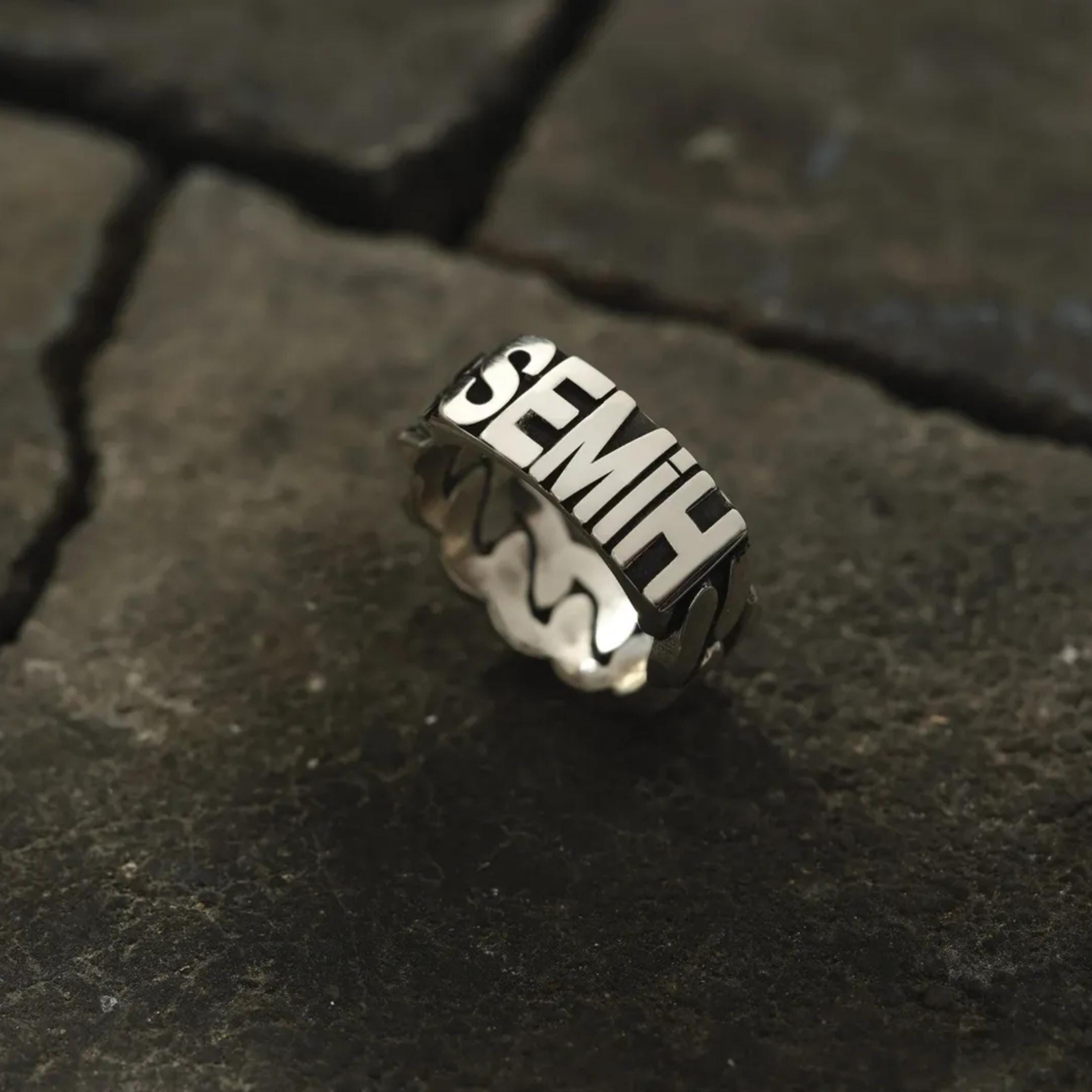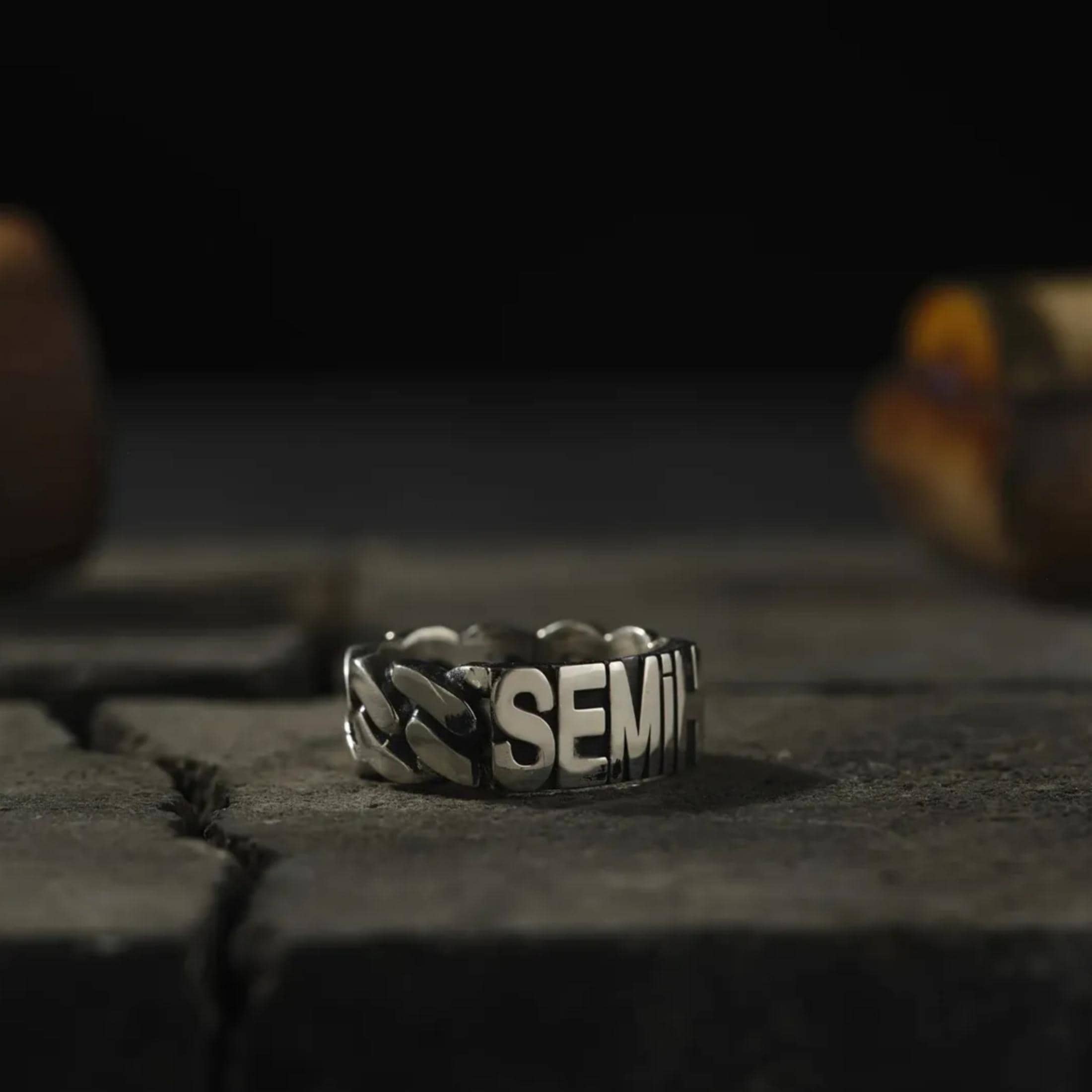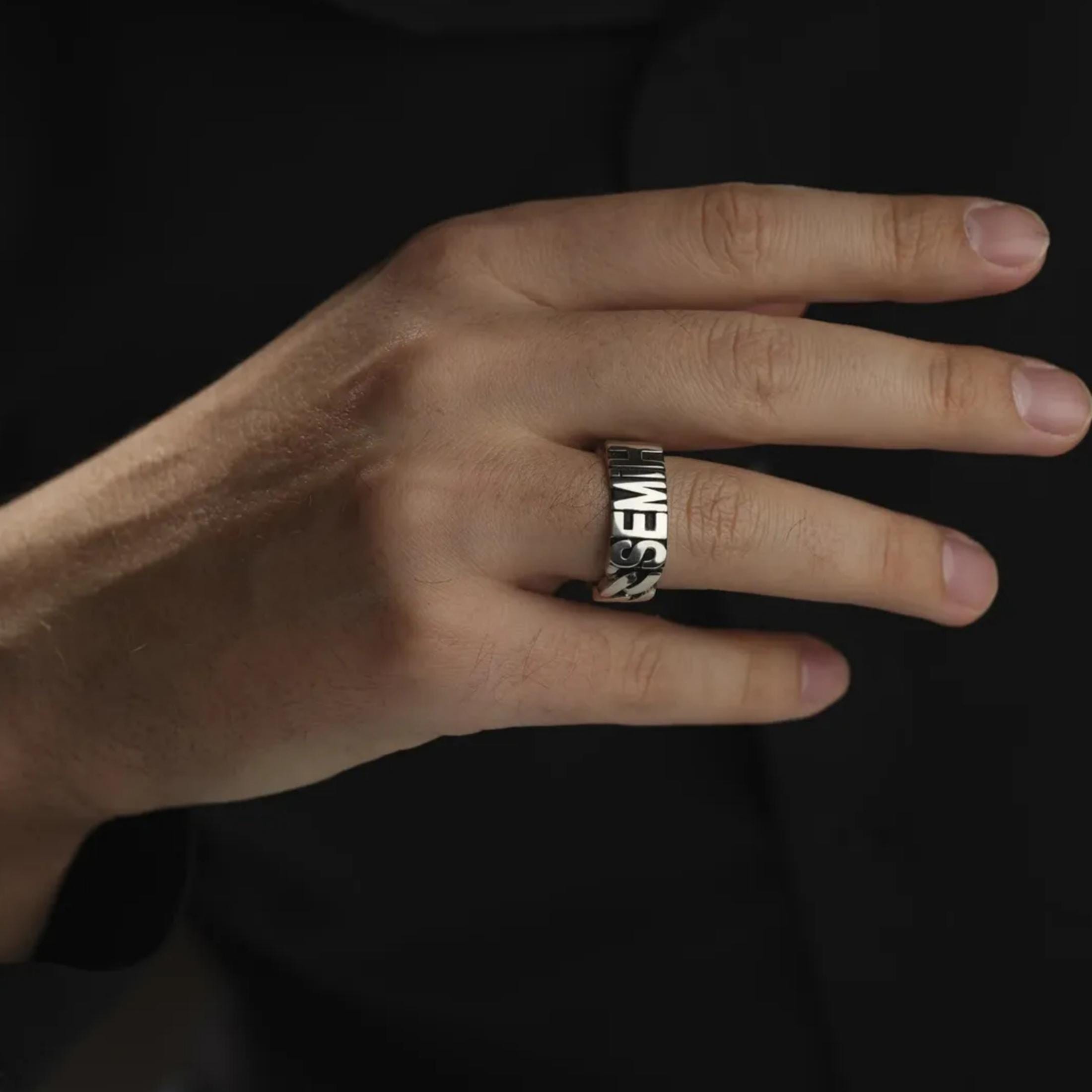 This unique men's ring is crafted from 925 sterling silver with a stylish chain design. It features a custom name engraved letter by letter on the top, making it a perfect personalized gift. You can request any name to be added to the design.