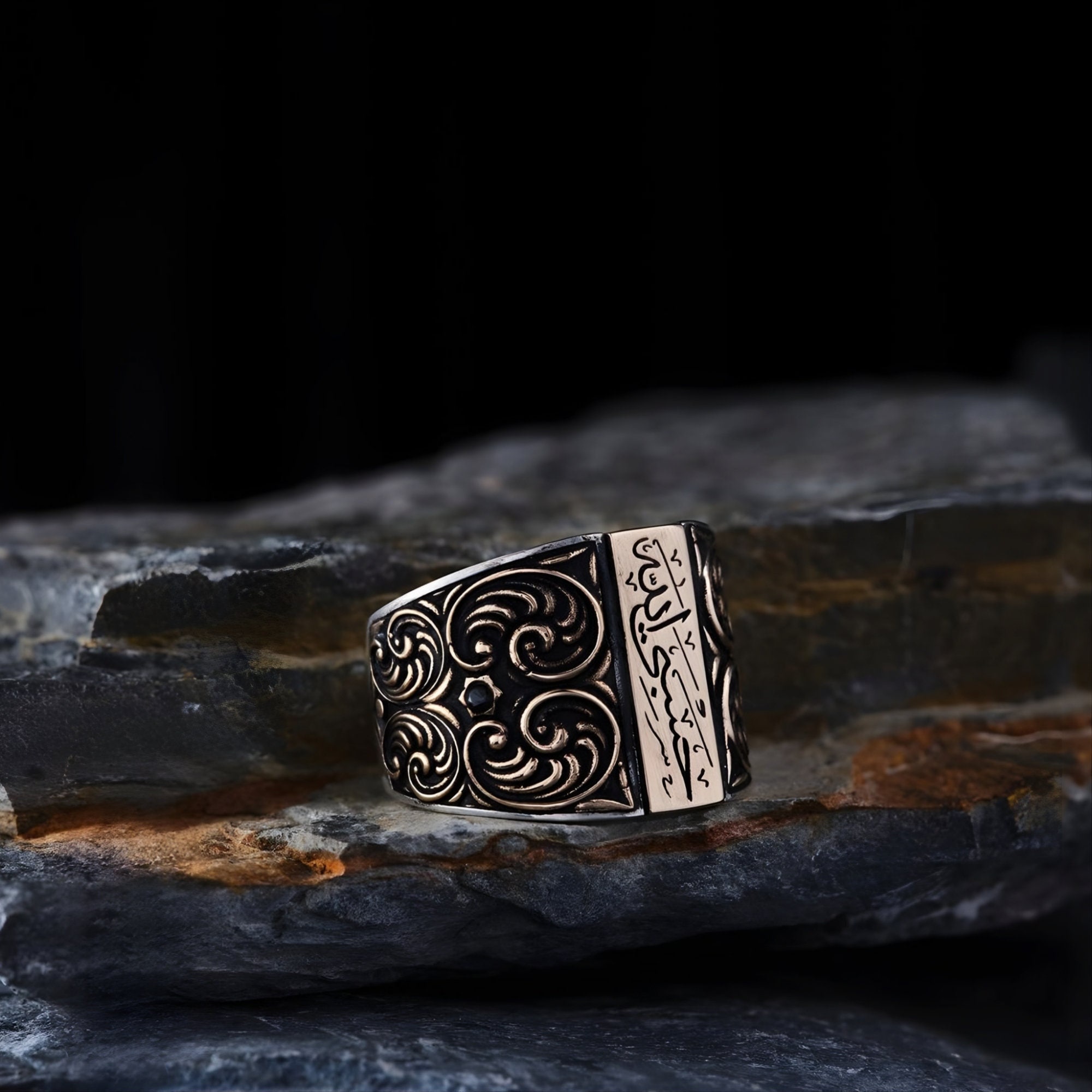 Every curve, every engraved line reflects careful artisan work — a blend of Islamic tradition and modern masculine design. The adjustable structure ensures a comfortable fit, making it suitable for daily wear while maintaining its bold and meaningful presence.