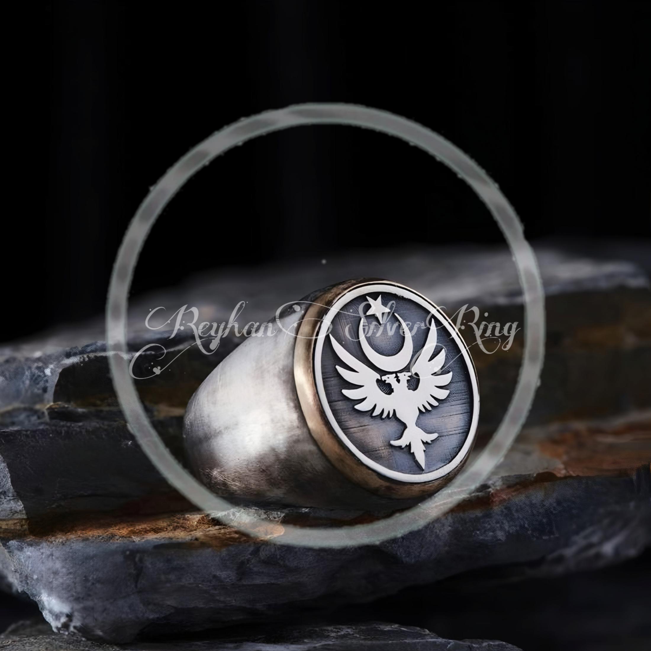 This unique handmade 925 sterling silver ring features the double-headed eagle and the crescent star, symbols of strength, power, and heritage. Crafted with fine craftsmanship, the ring has an aged (oxidized) finish, enhancing its historical and antique look. A true masterpiece, perfect for those who appreciate deep symbolism and traditional artistry.
