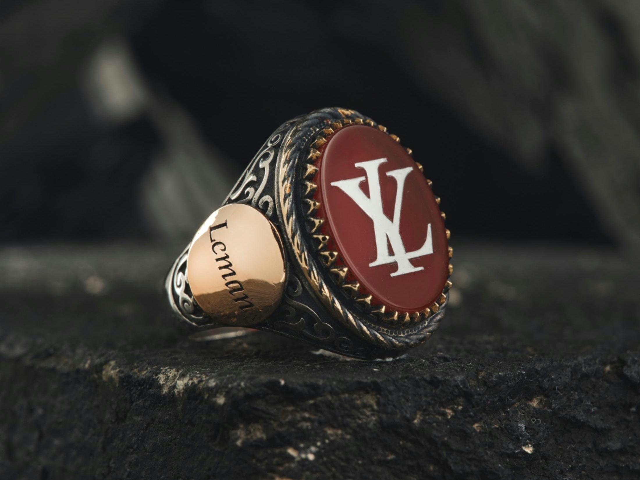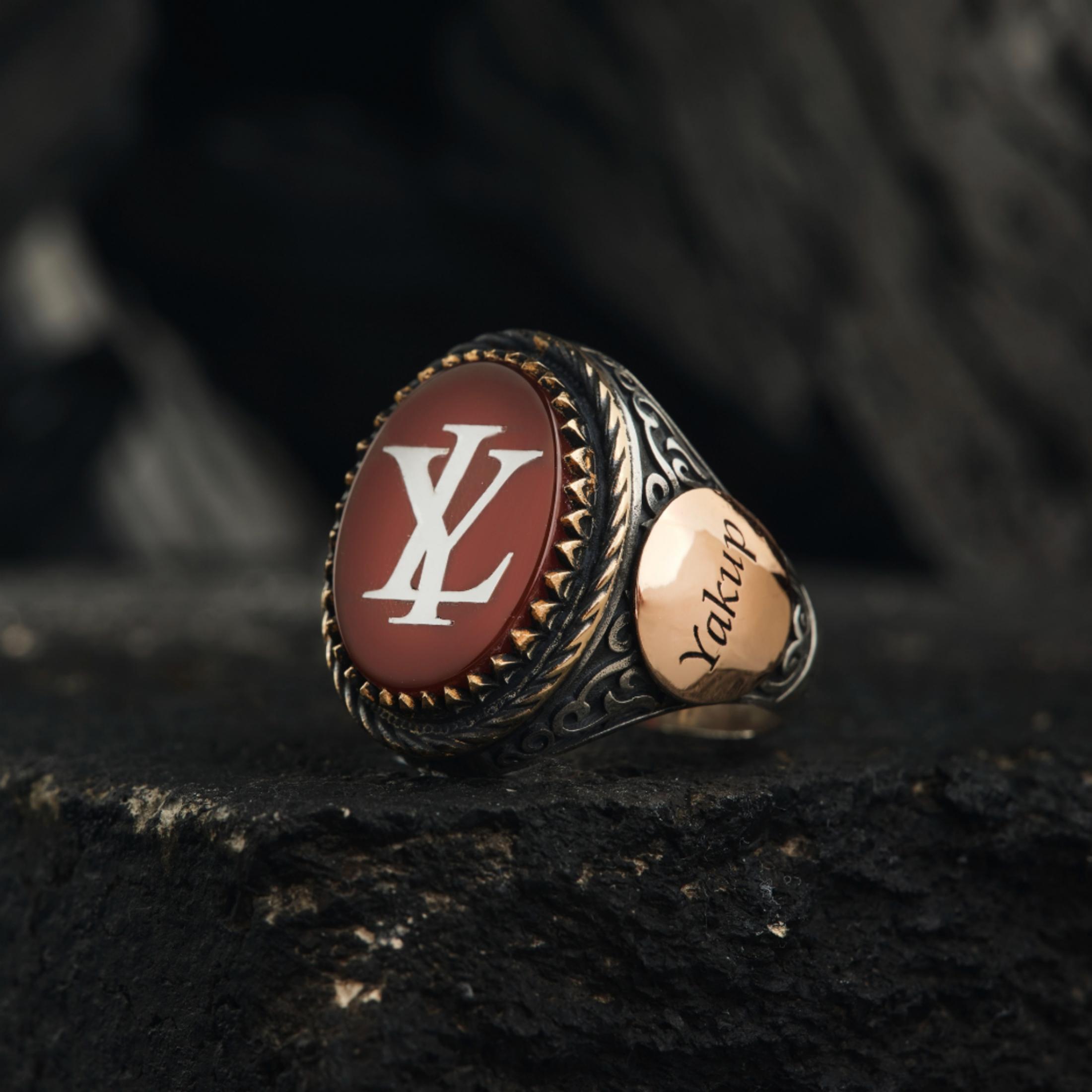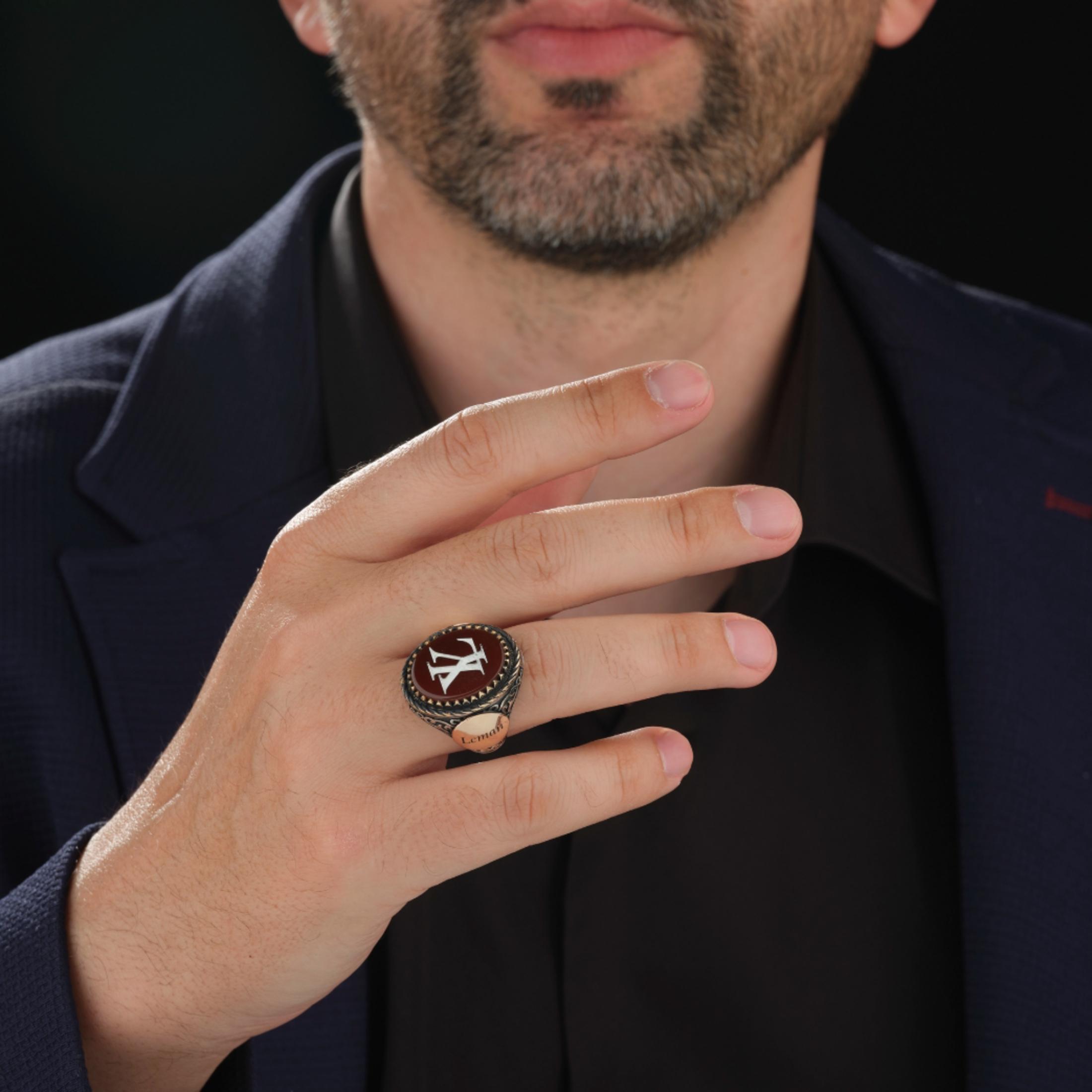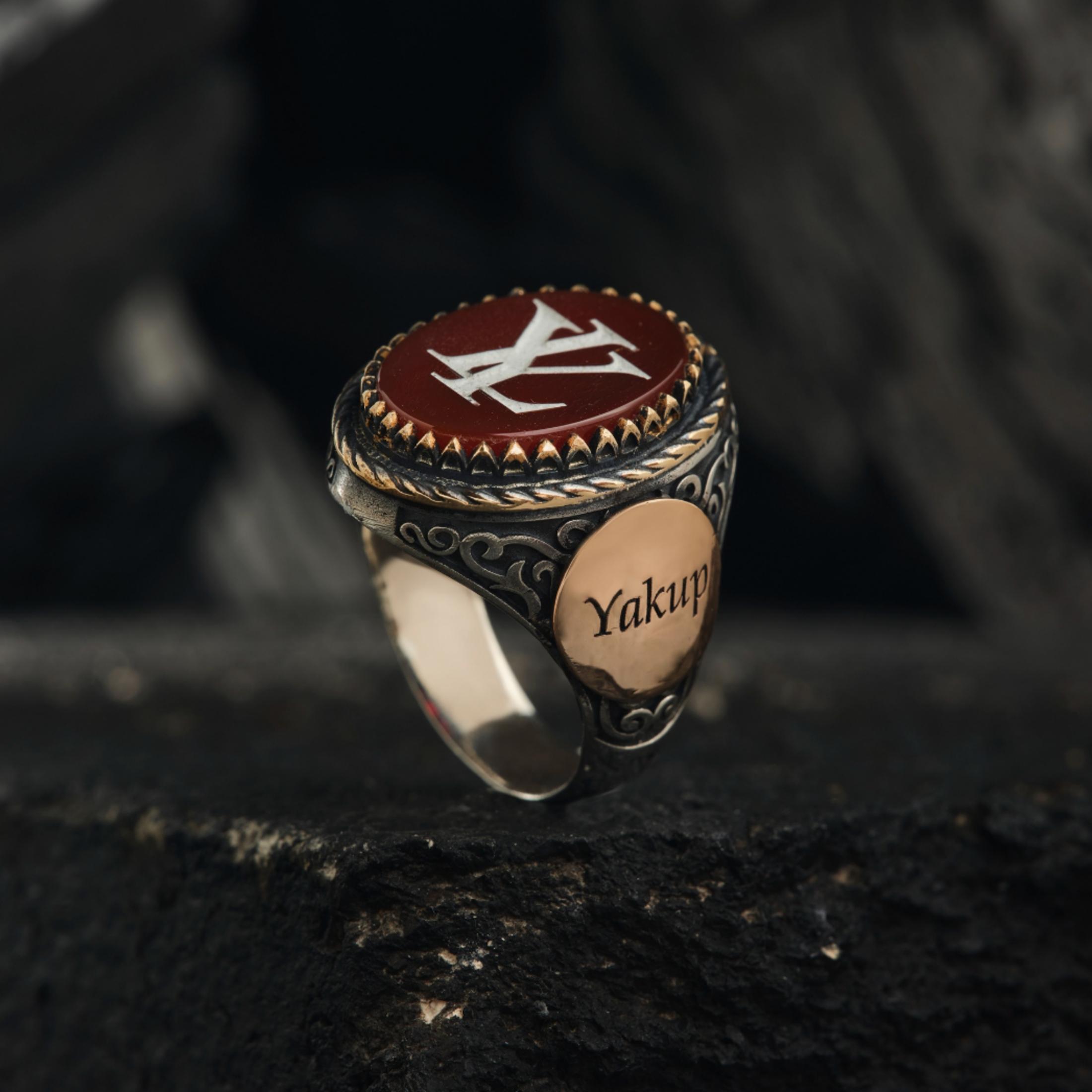 This exquisite handmade ring is designed with natural Brown Agate Stone, known as the "stone of healing and balance." The oval agate stone at the top of the ring is meticulously customized with your or your loved one's initials or name combination (custom calligraphy or script available upon request). The under-casing features finely detailed filigree engravings, adding a touch of antique nobility to the ring.