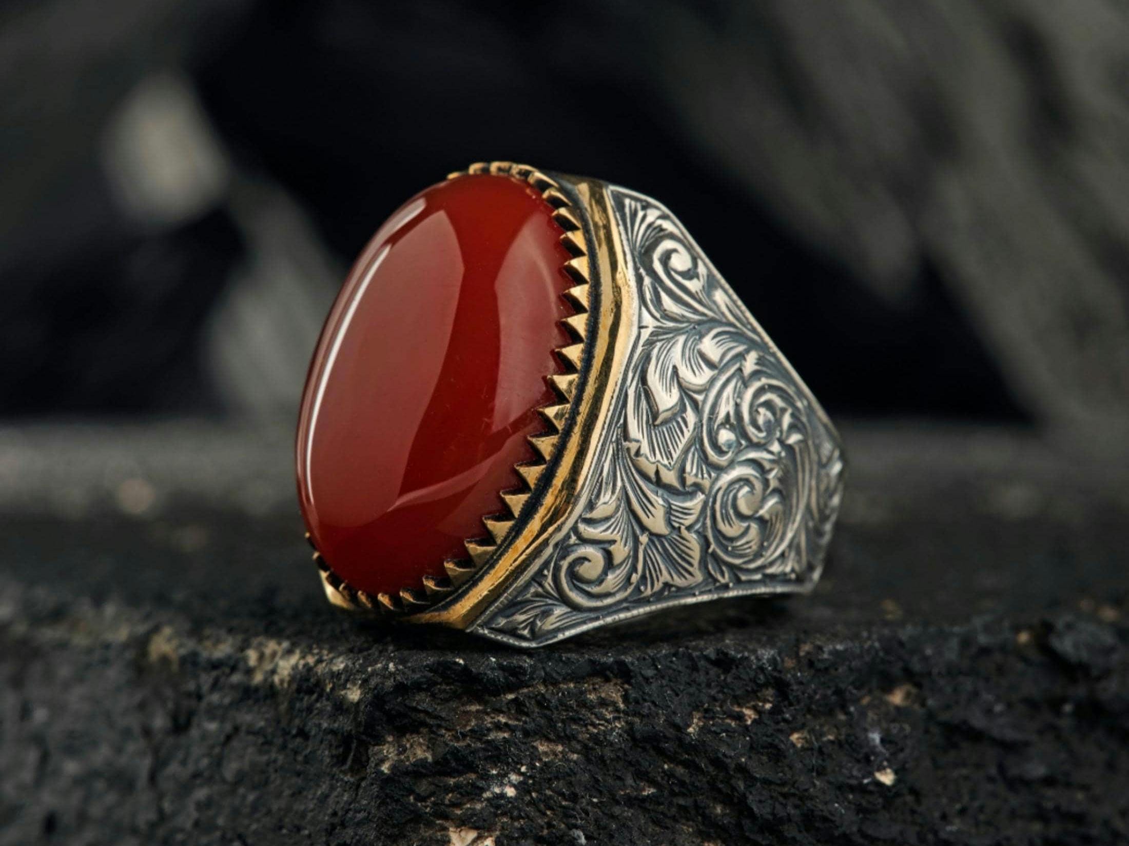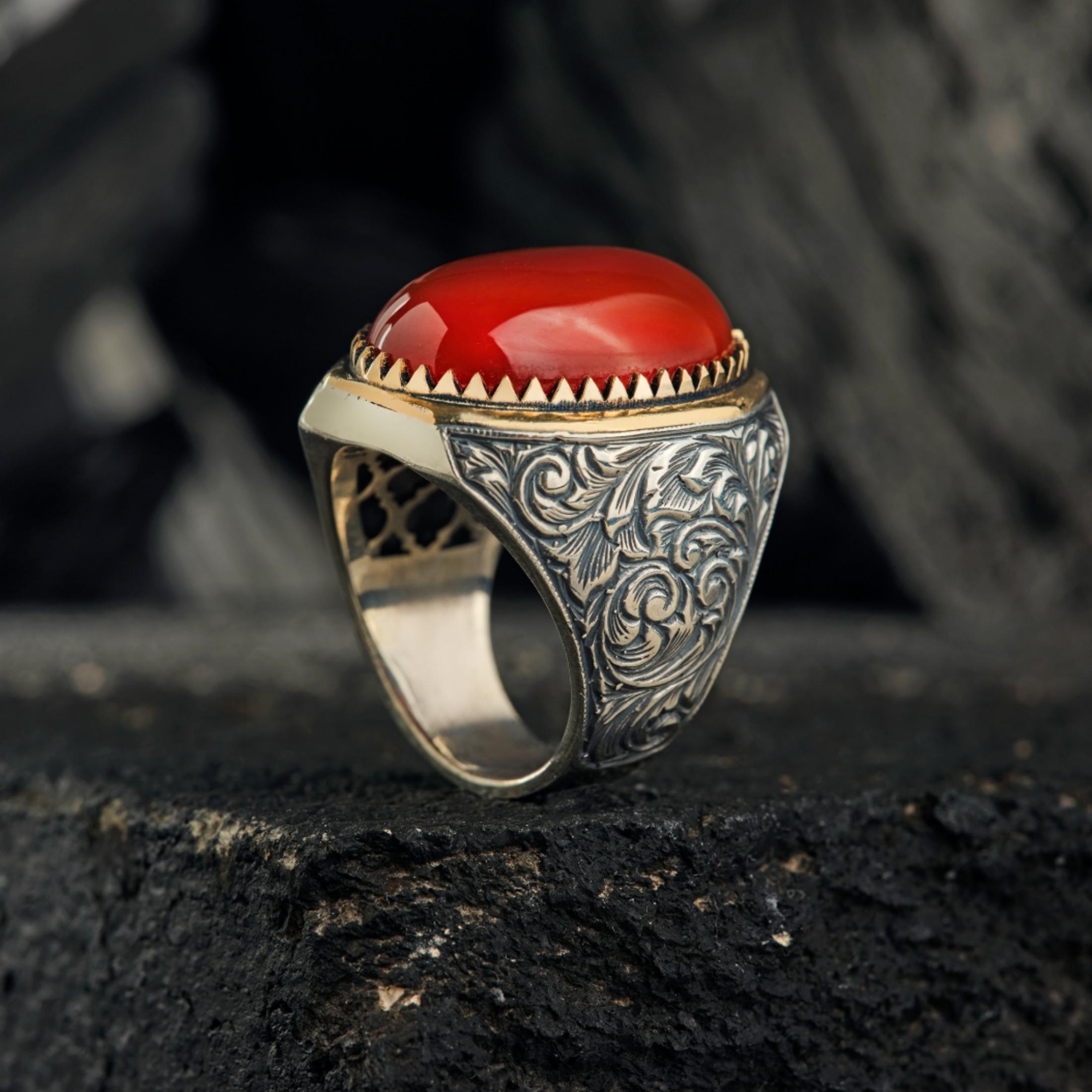 The sides of the ring are decorated with fine engraved patterns, showcasing detailed craftsmanship.