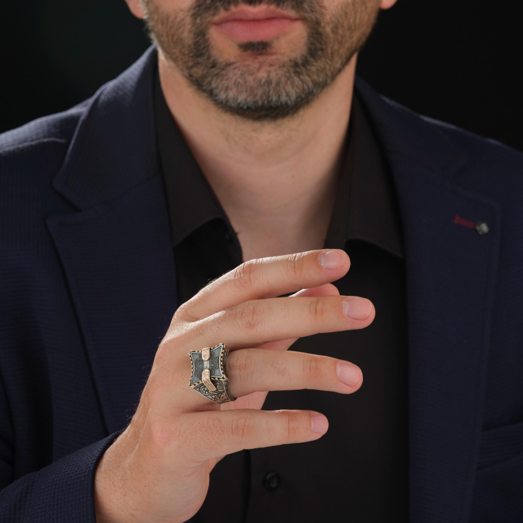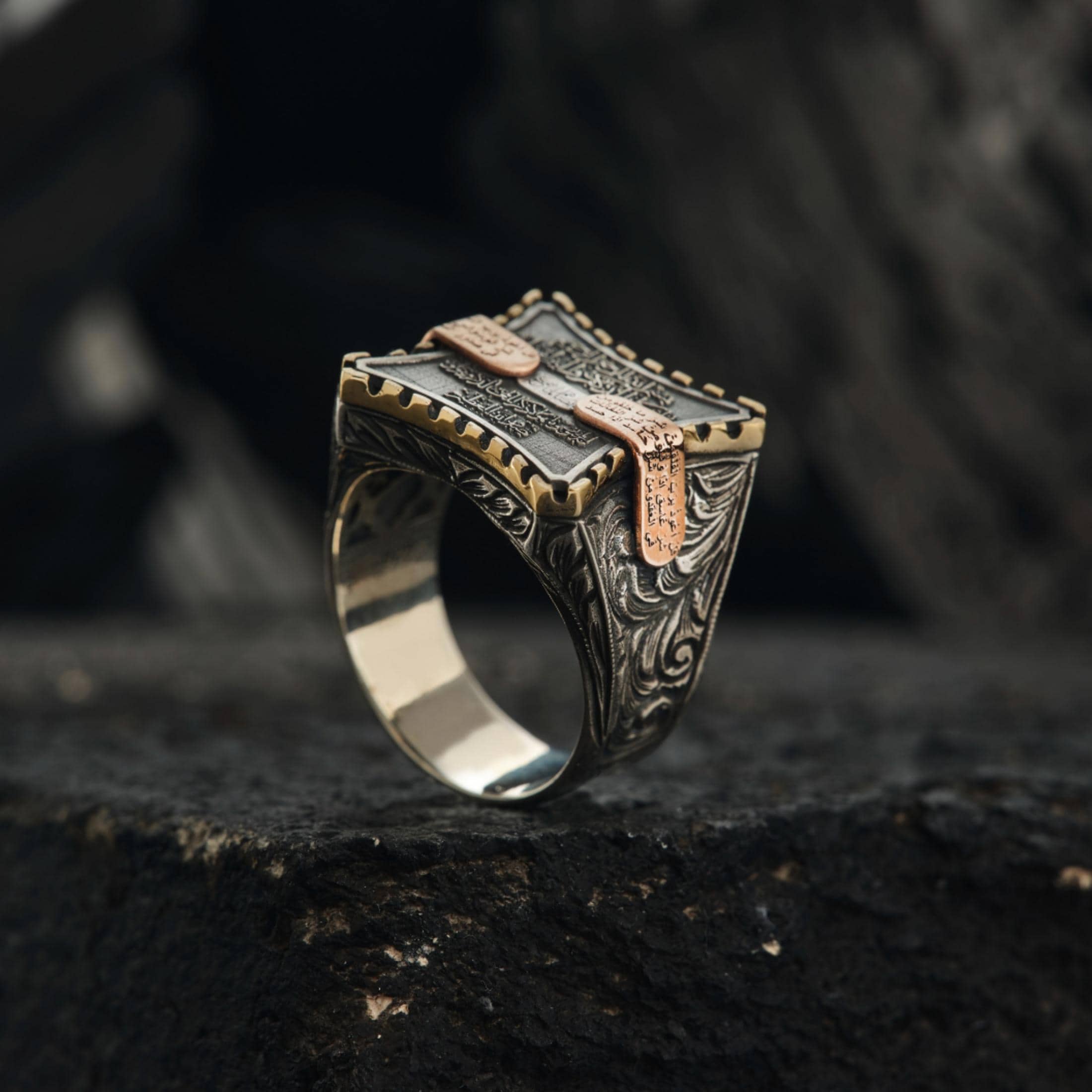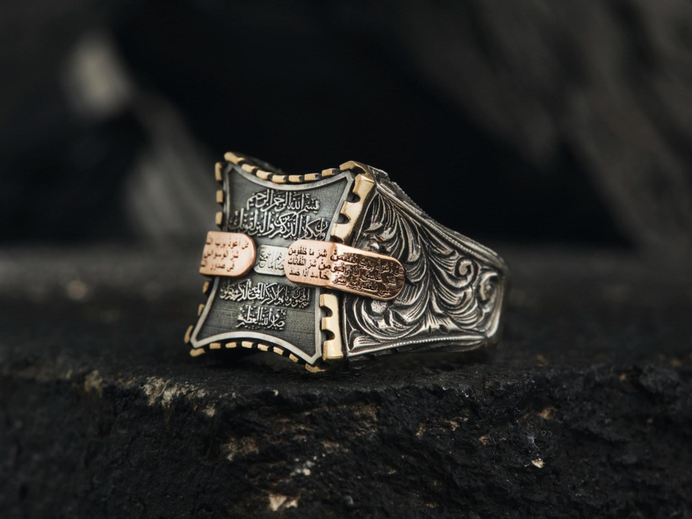 Surah Kalem 51-52 verse is engraved in the middle part of the castle ring model, and Surahs Nas and Felak are engraved on the sides. This special design with engraving detail adds meaning and elegance to your style. Personalized name or logo can be added.