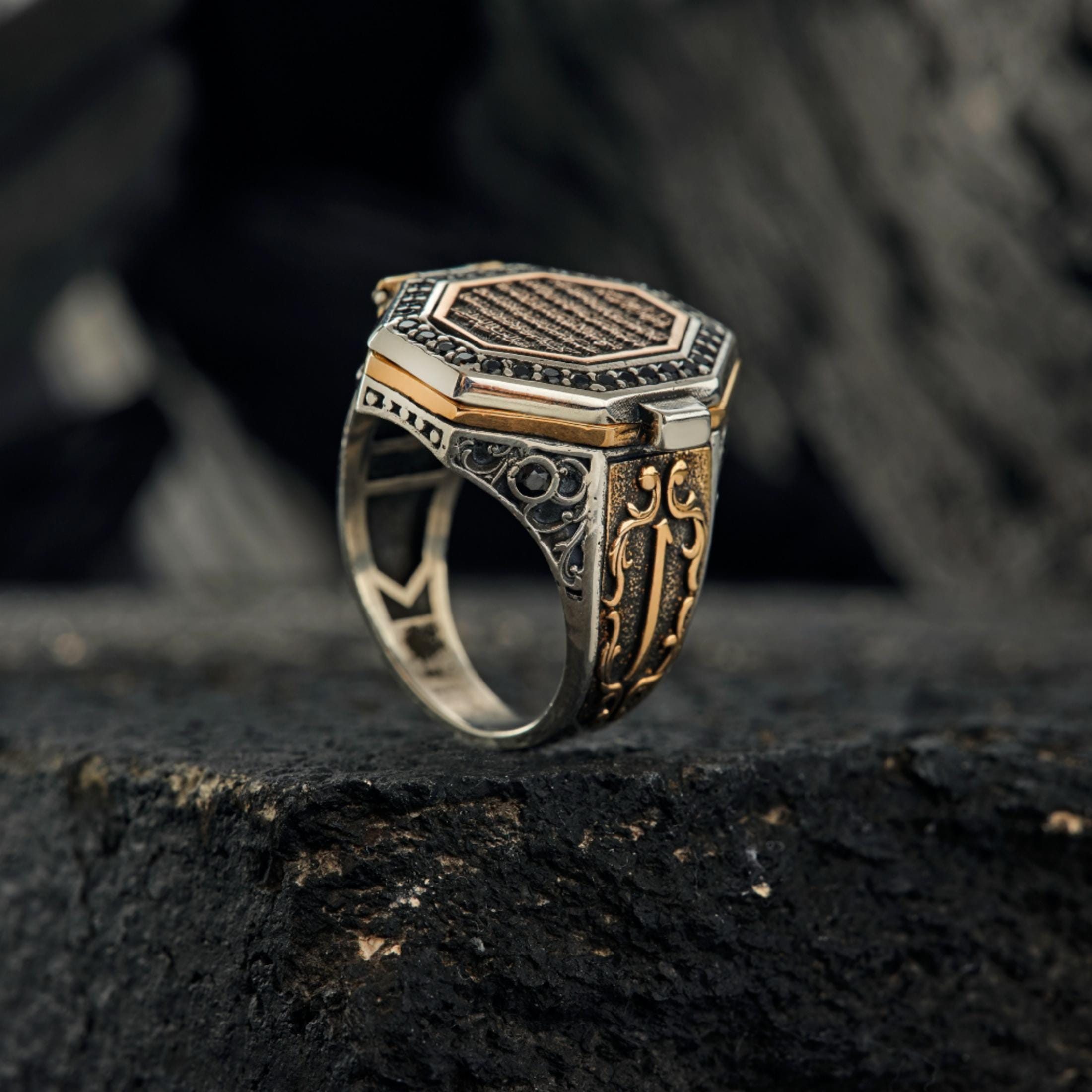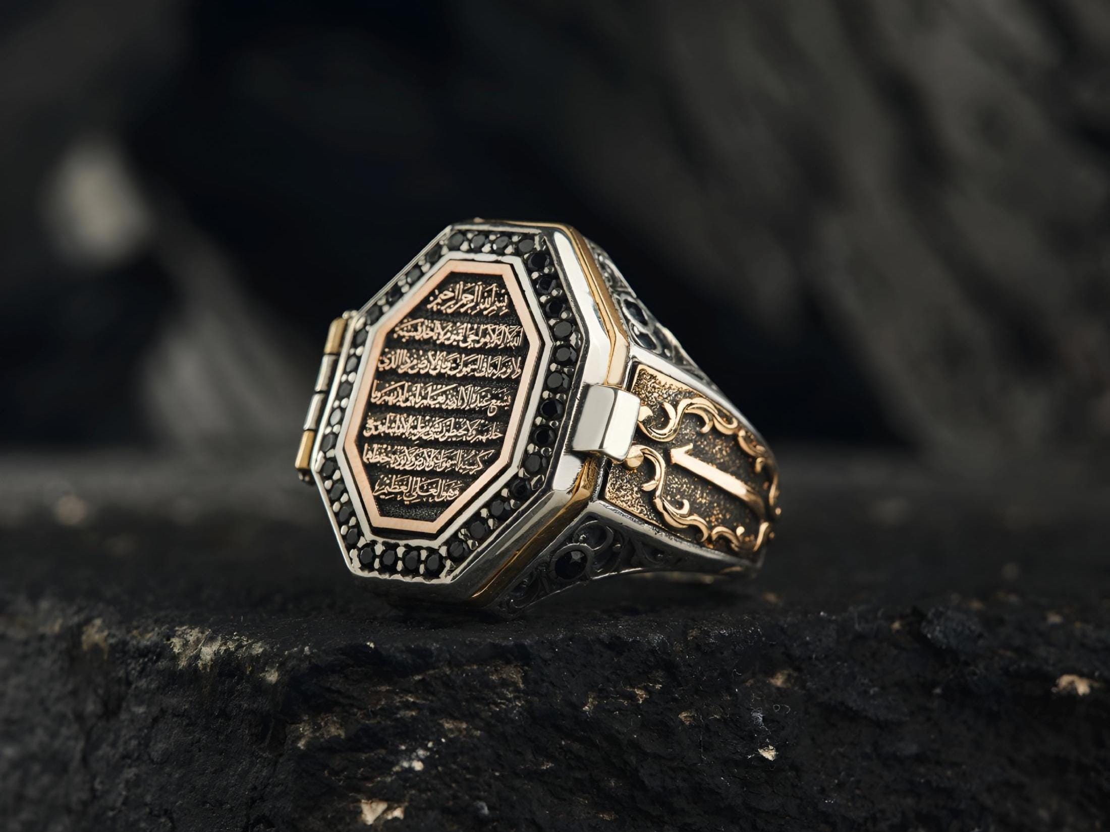This specially designed Capped Ayat-el Kürsi Ring carries the strongest form of faith and symbolism.