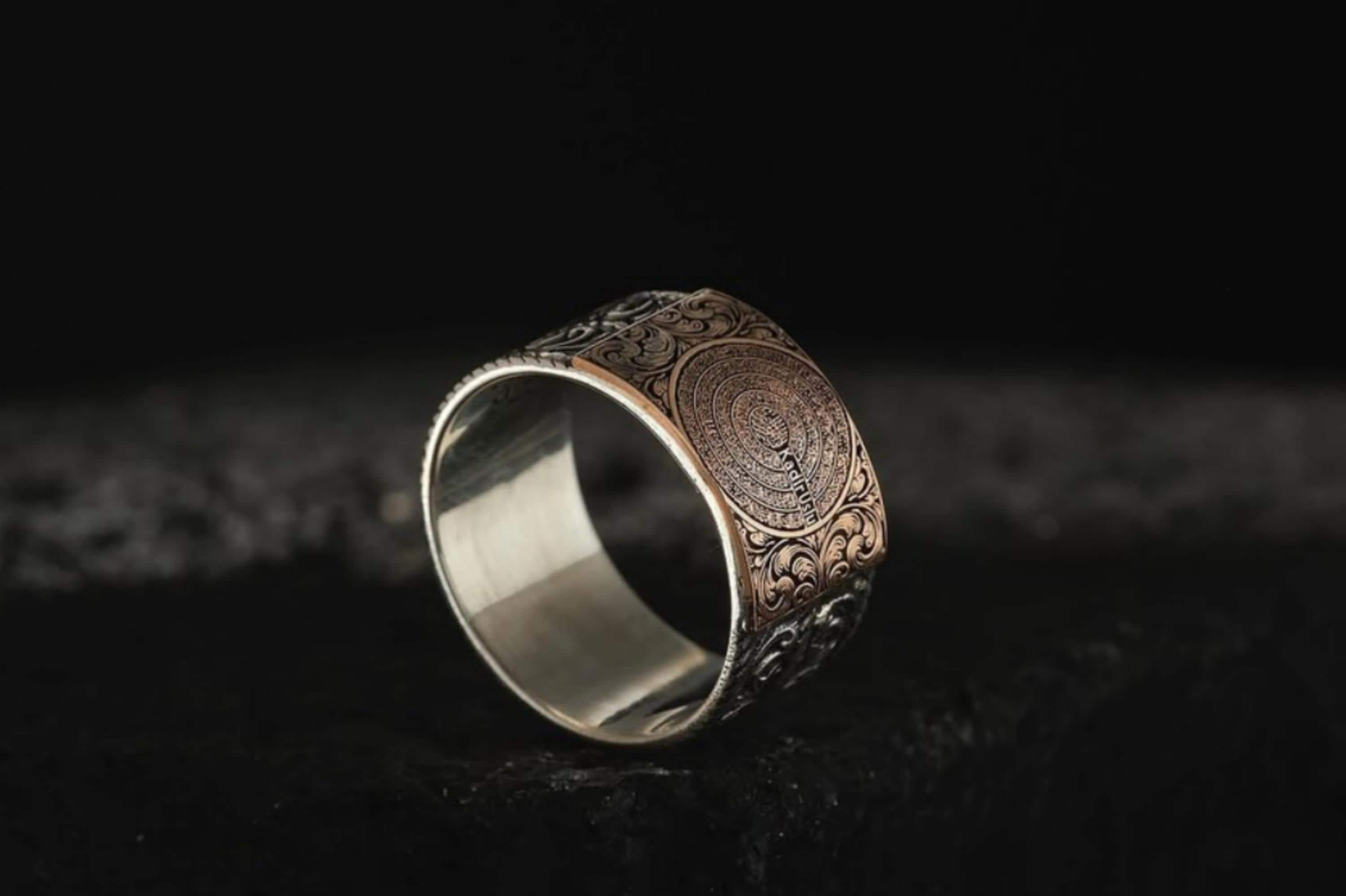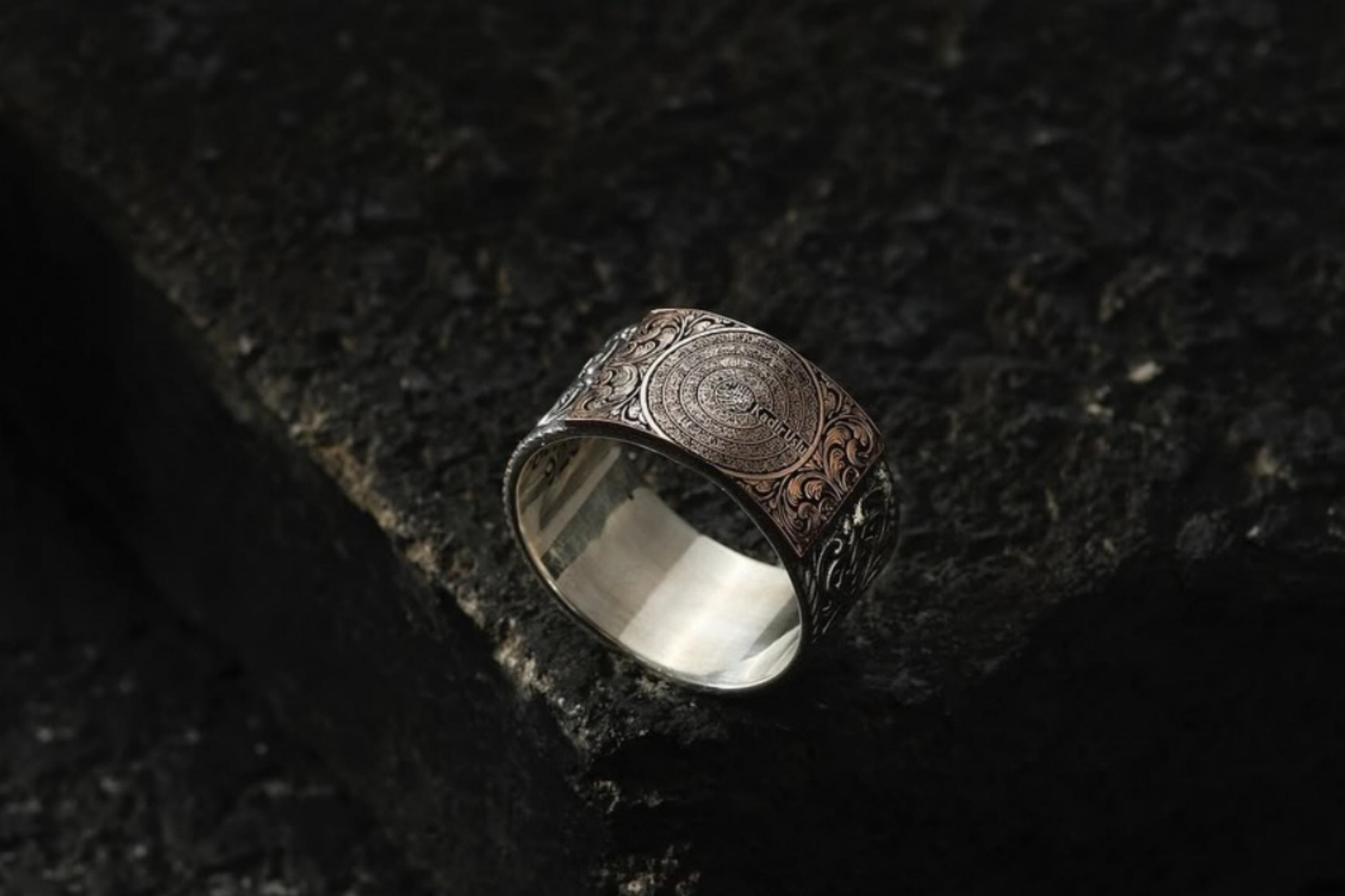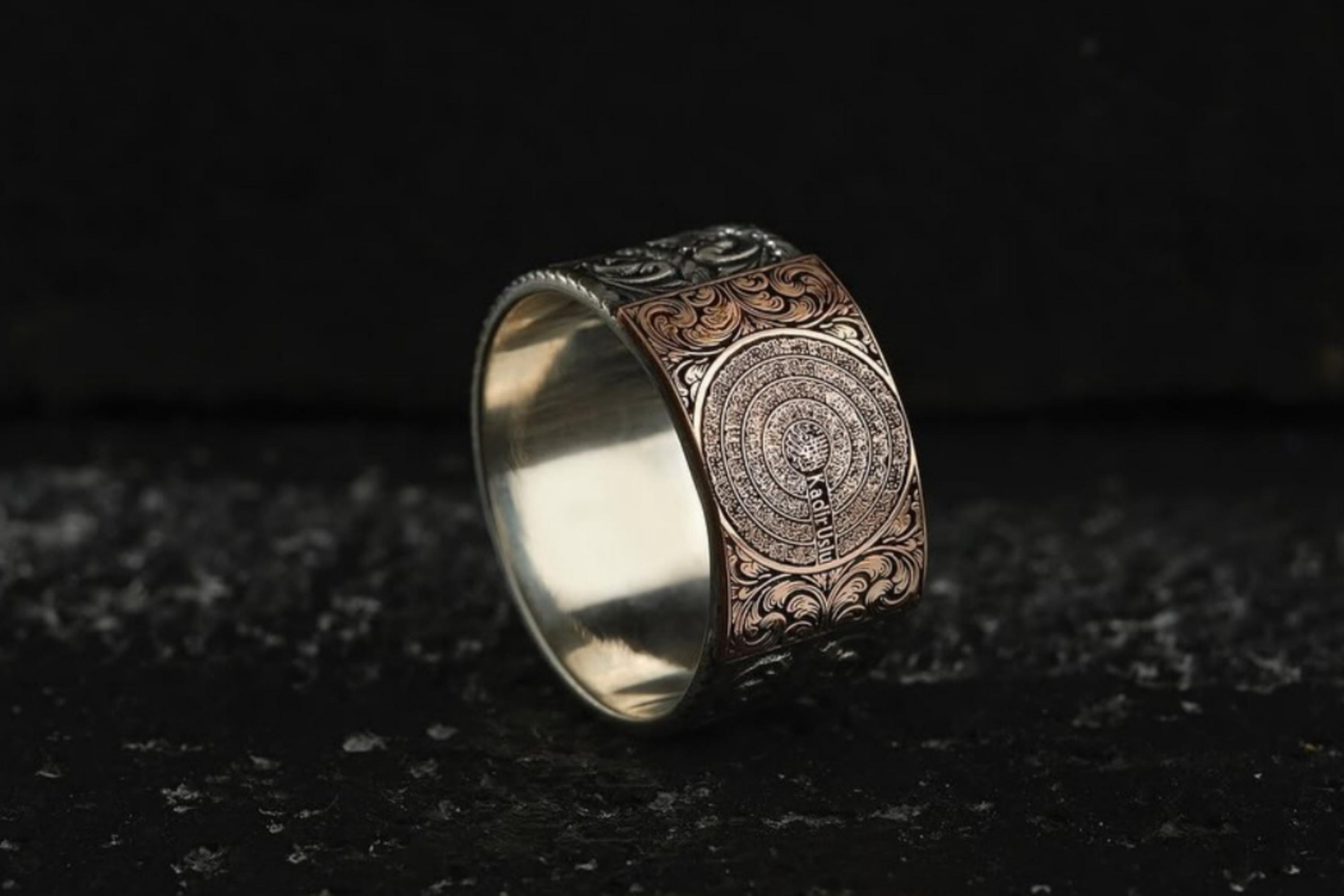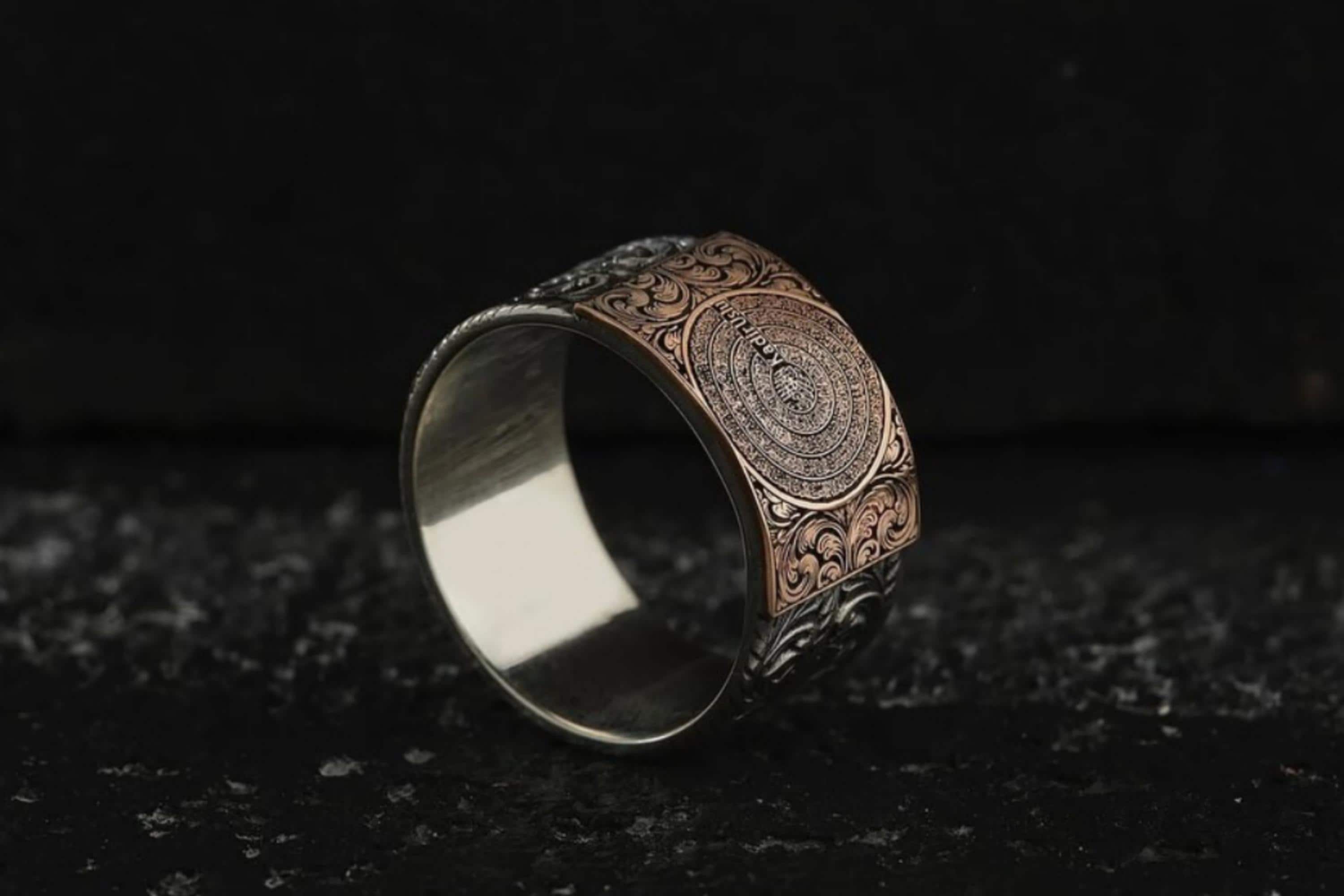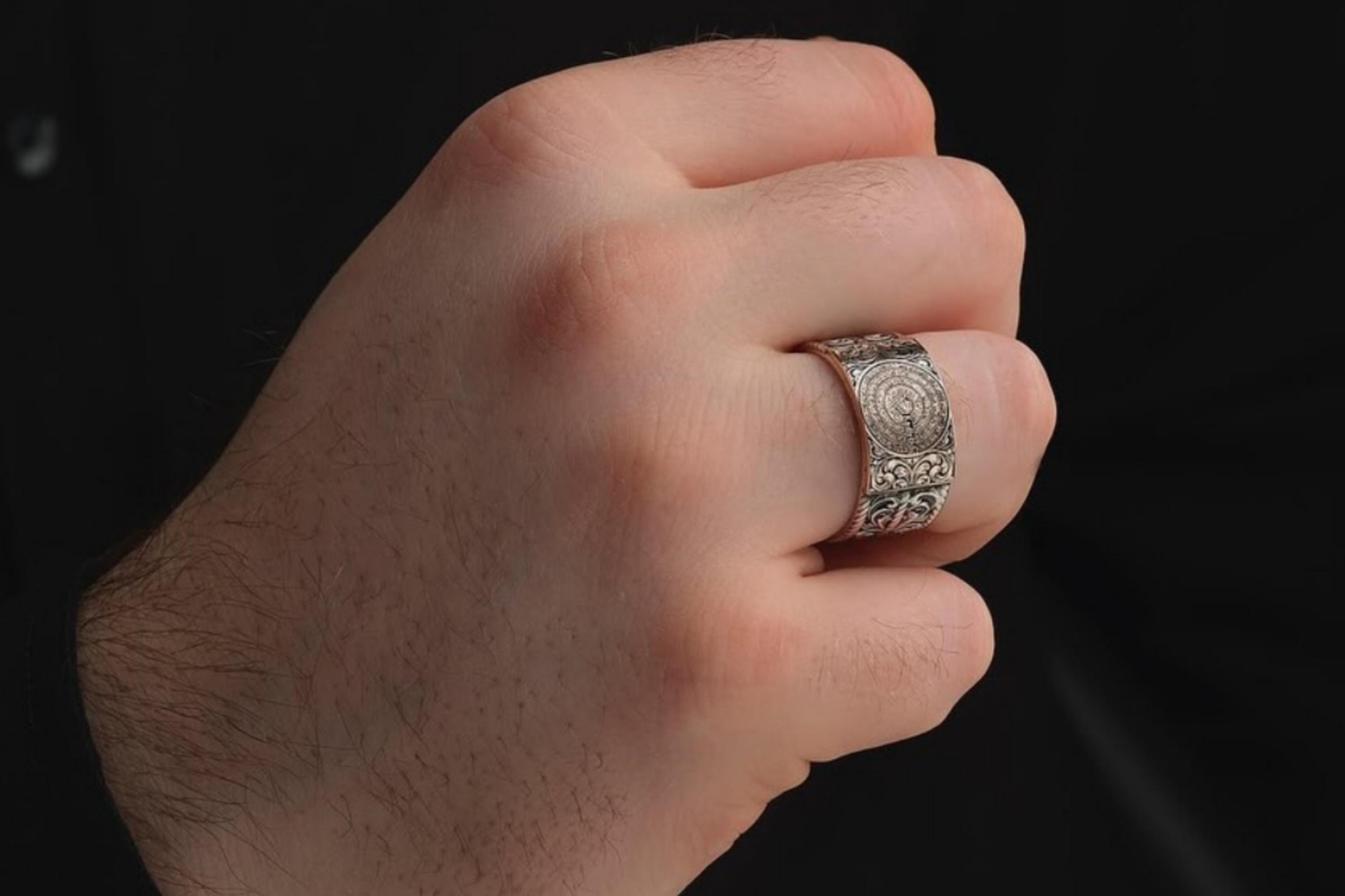 This elegant 925 sterling silver ring blends faith and artistry. Featuring engraved Surahs Al-Falaq, An-Naas, Al-Ikhlas, and Al-Kafirun, it carries deep spiritual protection. The personalized name at the center adds a unique, meaningful touch. Surrounded by twisted patterns and fine engravings, this handcrafted ring symbolizes strength, devotion, and timeless beauty — a perfect gift for those who value spirituality and elegance.