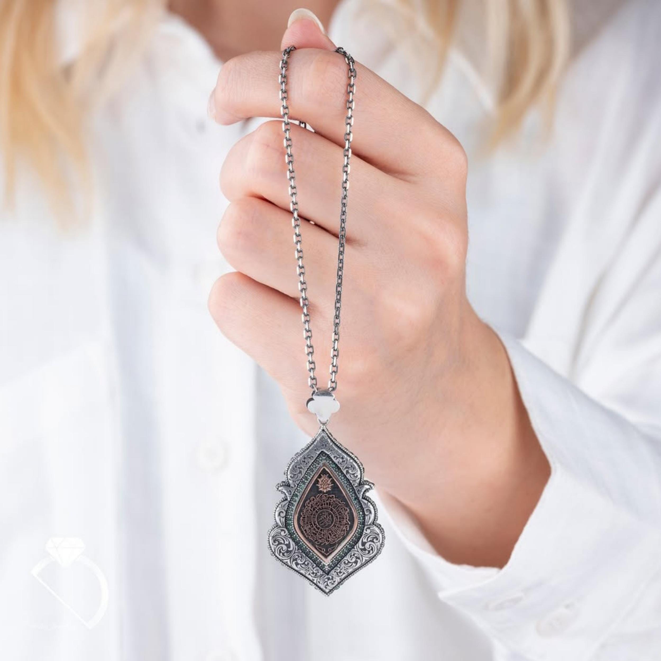 This elegant Islamic silver necklace for women features beautiful Seljuk motifs and a delicate circle of green micro zircon stones. The pendant is engraved with the Inshirah Surah (Al-Sharh) from the Holy Quran, symbolizing peace, relief, and faith.