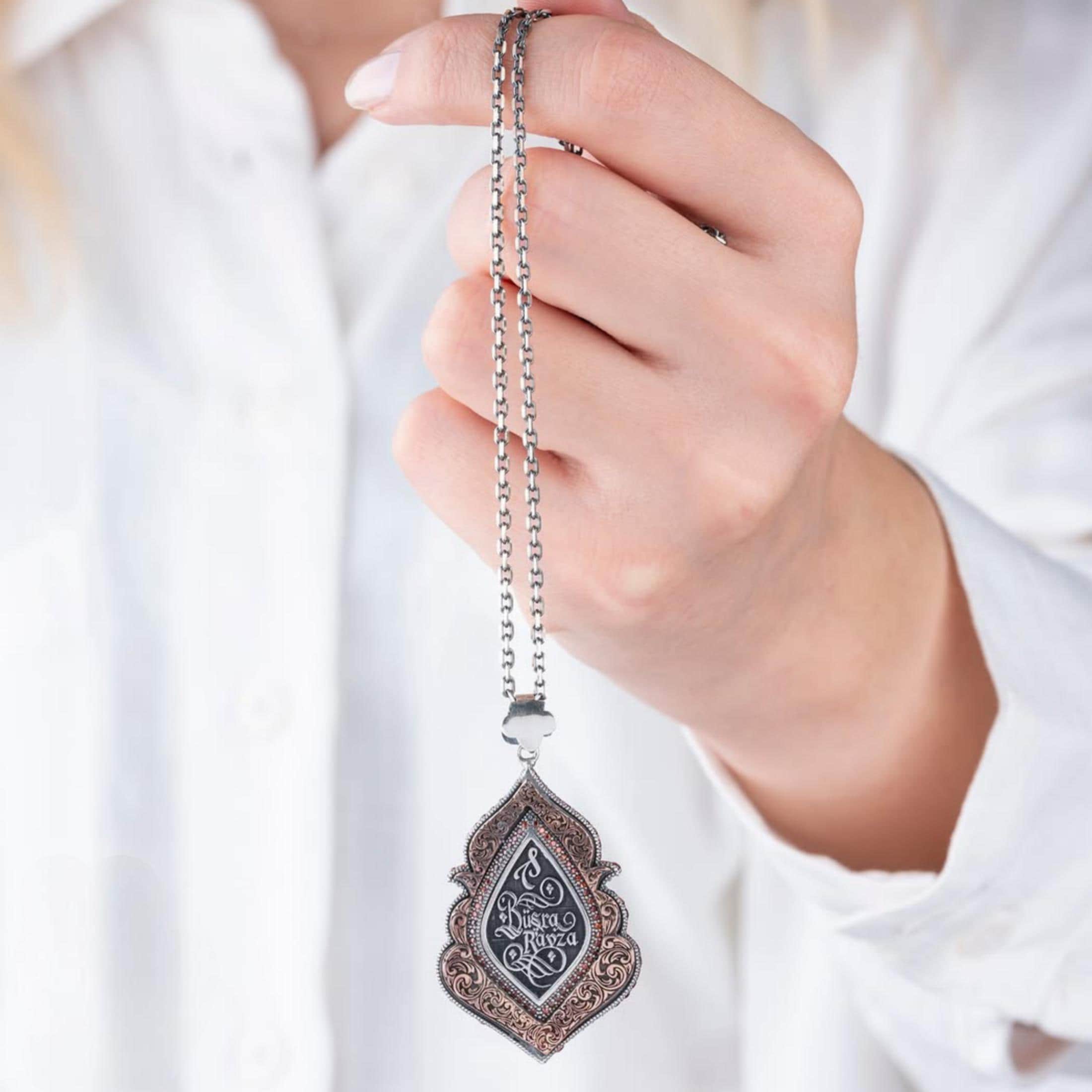 Elevate her style with this exquisite handmade sterling silver necklace, adorned with authentic Seljuk-inspired decorative motifs and accented by red micro zircon stones for a subtle sparkle. The pendant showcases a customized name in elegant calligraphy (Hat art), making it a deeply personal and meaningful piece.