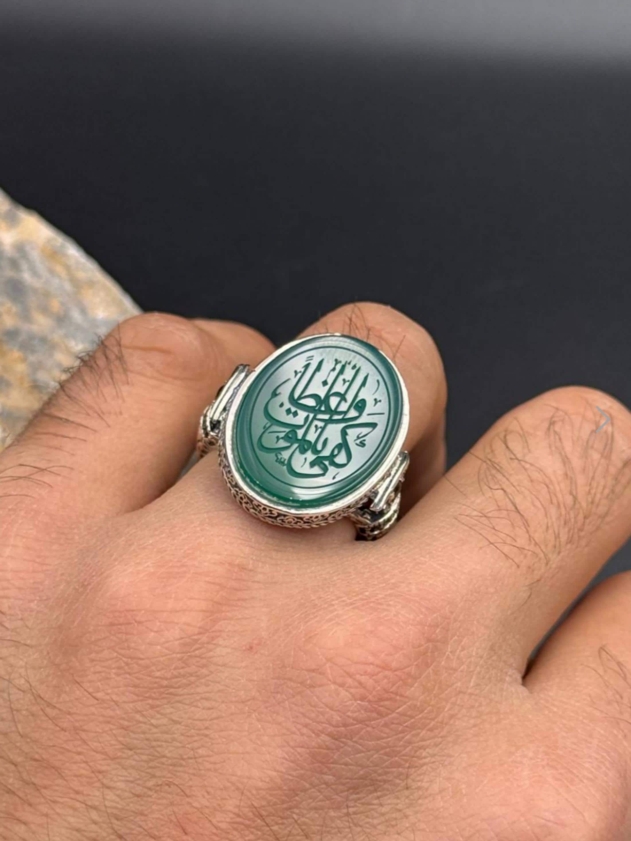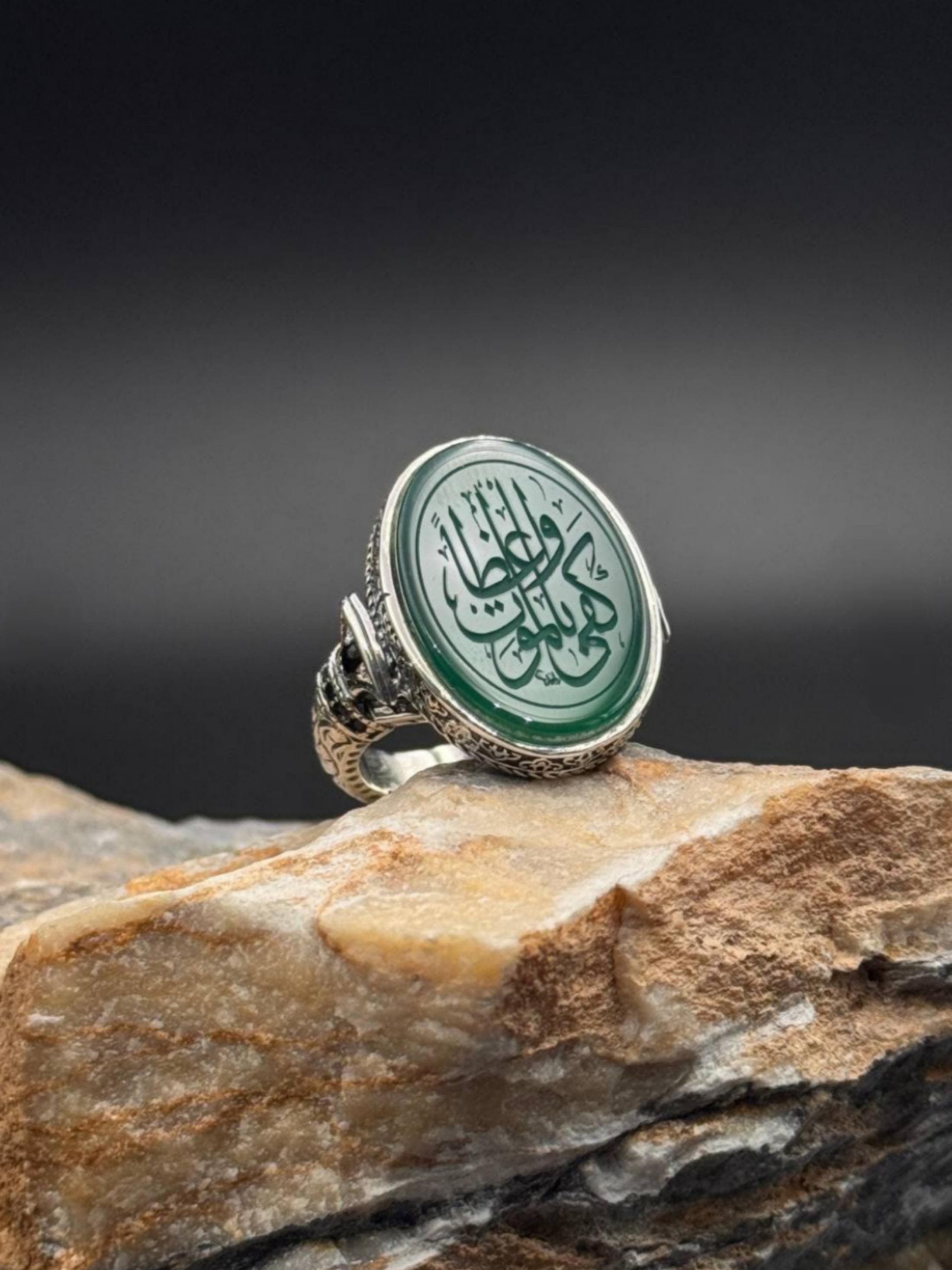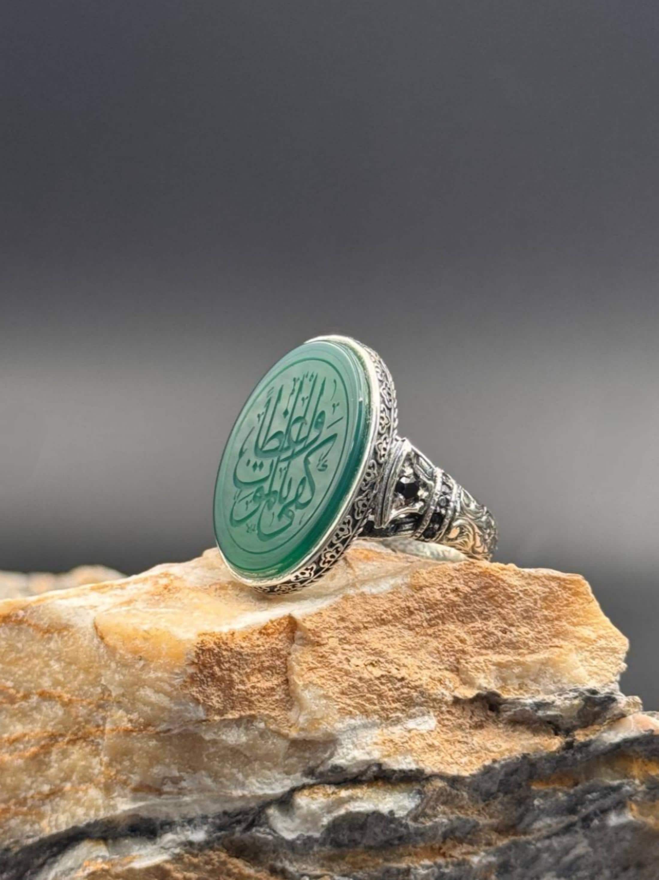 This specially designed ring is handcrafted from 925 sterling silver and features a natural green agate stone at its center. The inscription "Kefâ Bil-Mevt Vaizan" (Death is Enough as a Counselor) is delicately engraved in Arabic calligraphy on the stone. This phrase, found on the ring of Hz. Ömer, is a profound reminder that calls people to always seek truth, patience, and piety.