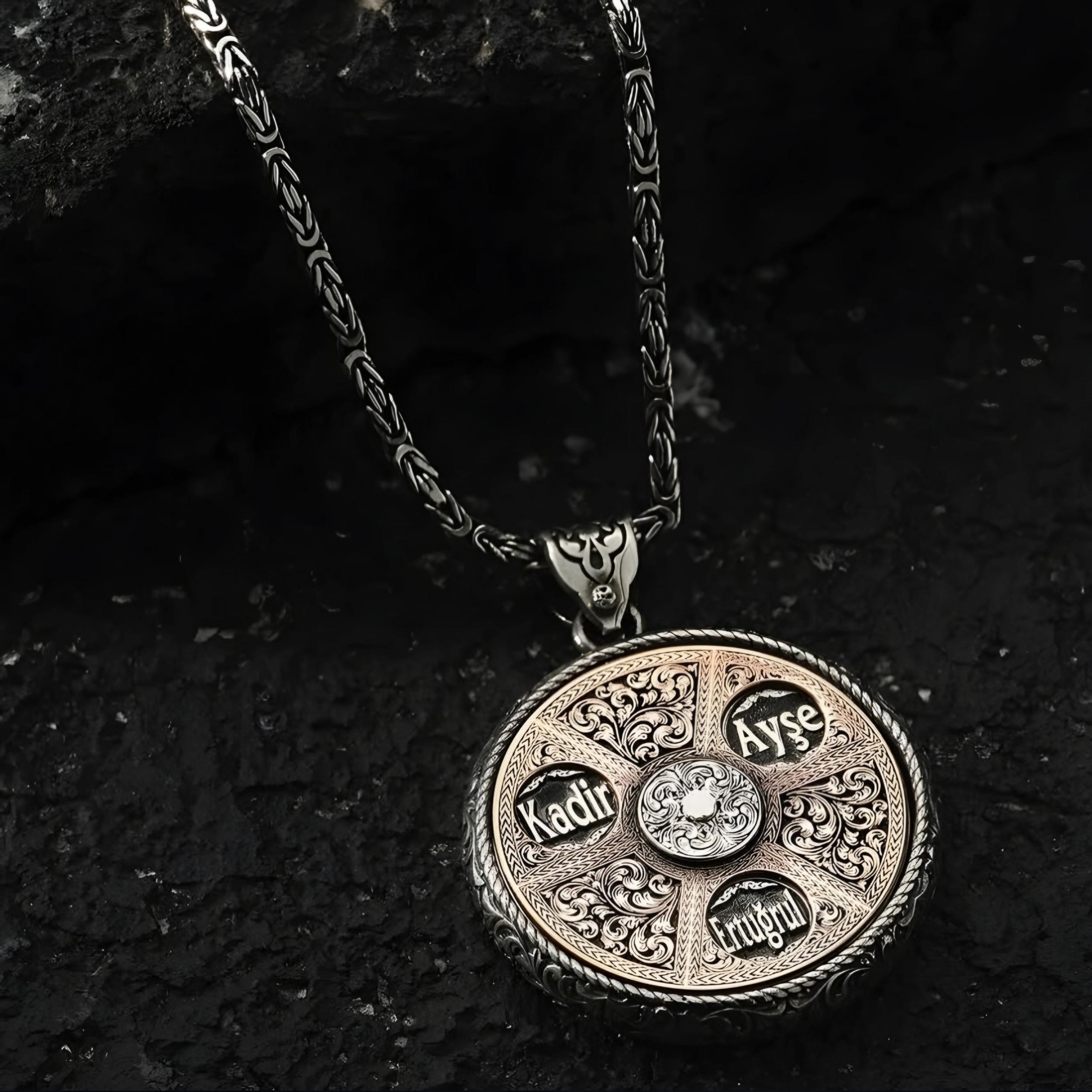 The front of the necklace features exquisitely engraved, unique sacred inscriptions. The interior has space for 3 personalized names.