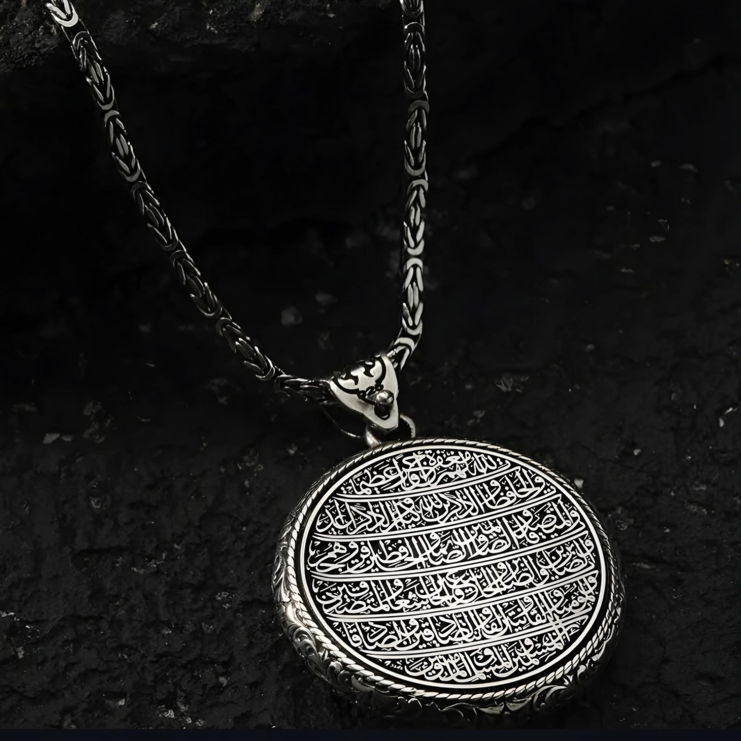 Front Details: Ayat al-Kursi (Throne Verse), Surah Inshrah, and Surah Fatiha are meticulously engraved.