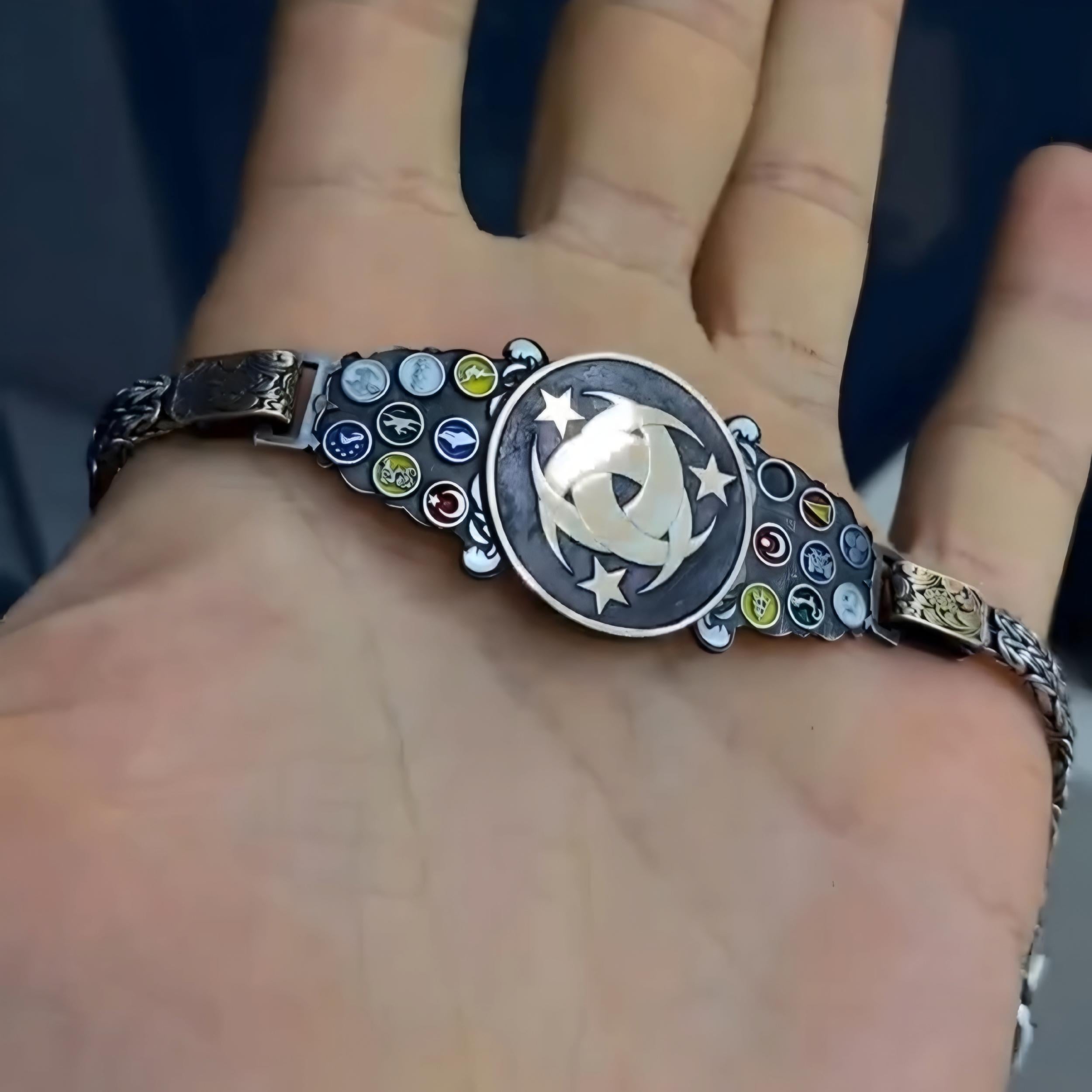 The flags of the 16 Great Turkish States, meticulously crafted on either side, carry thousands of years of civilizational heritage on your wrist.