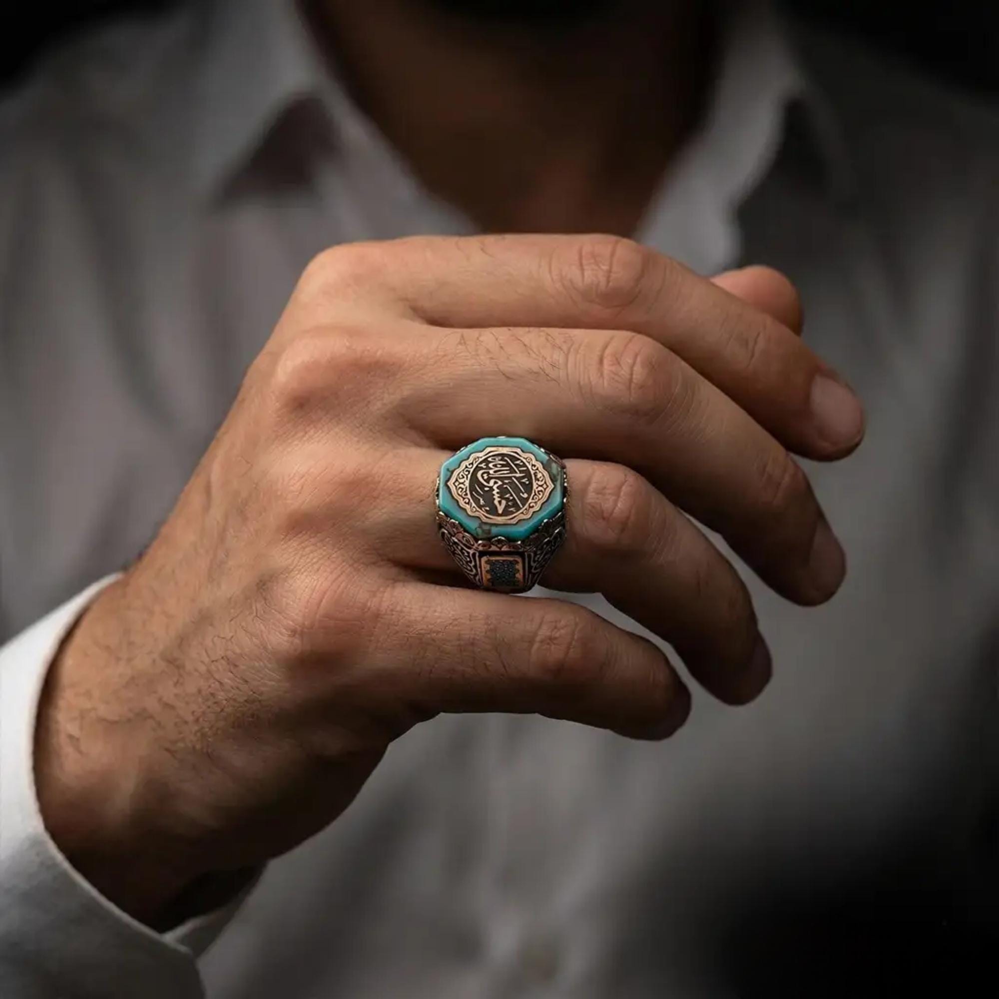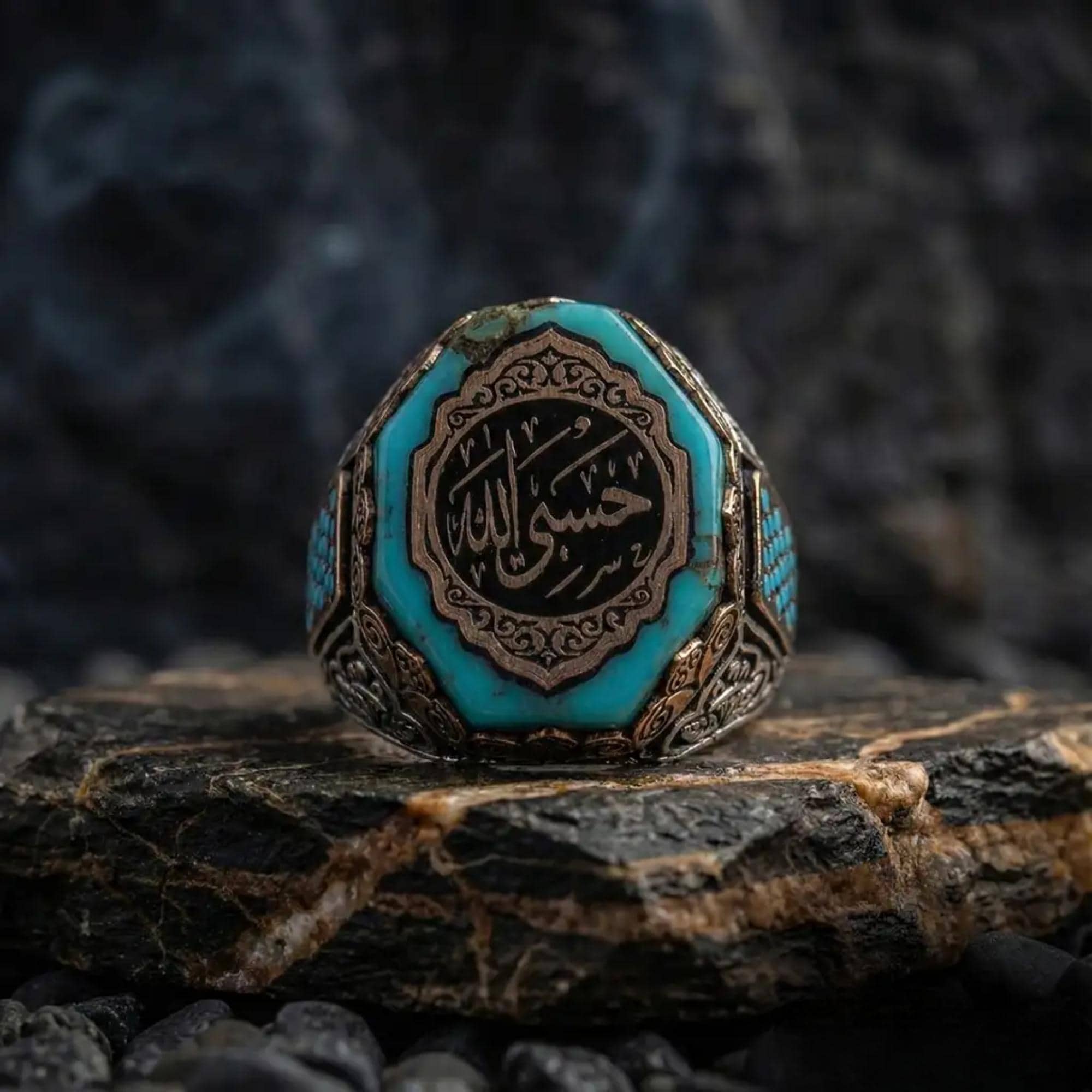 * Surat al-Zumer 36. A legendary ring in which turquoise stone and silver I wrote the verse, the courage-boosting jewellery of Islam and Muslims, the psychological support of Palestine "Is Allah not enough for His servant" is embroidered
