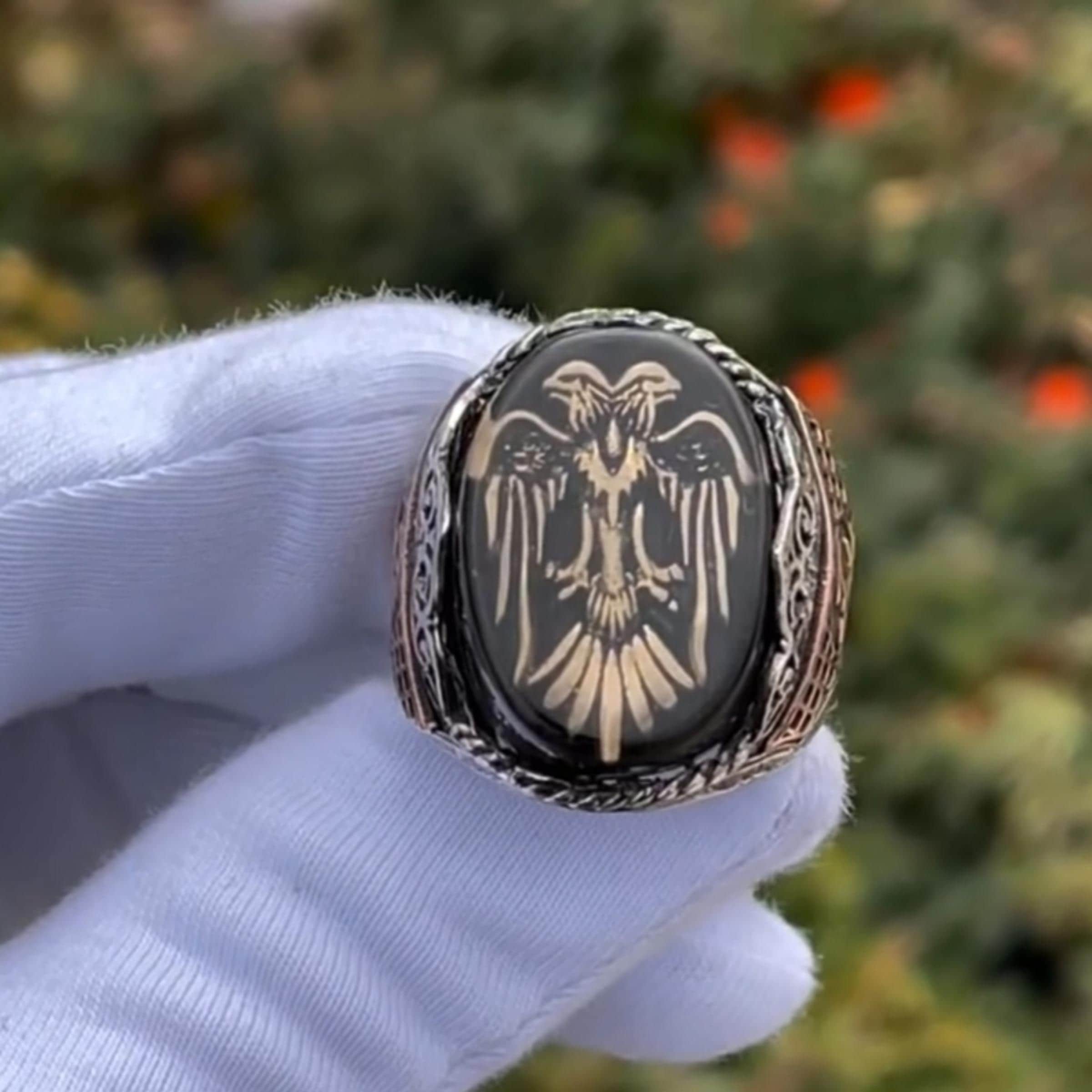 This special ring combines the mystical presence of black amber with the power of the double-headed eagle symbol, a timeless emblem of strength and protection.