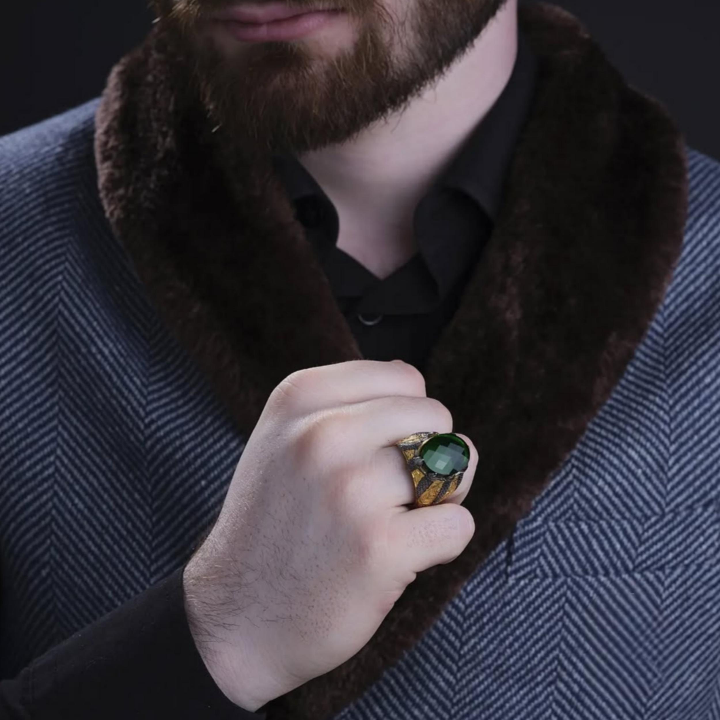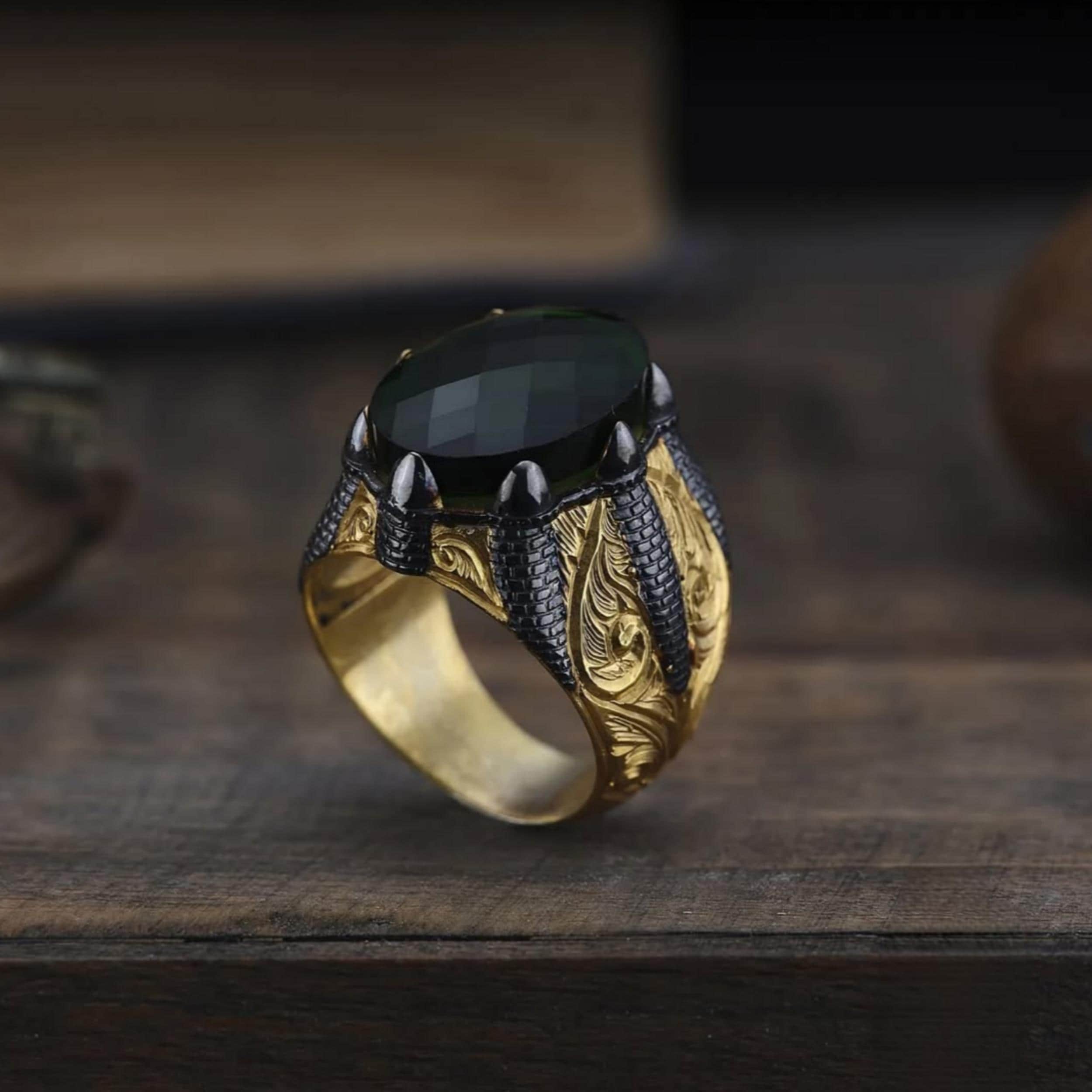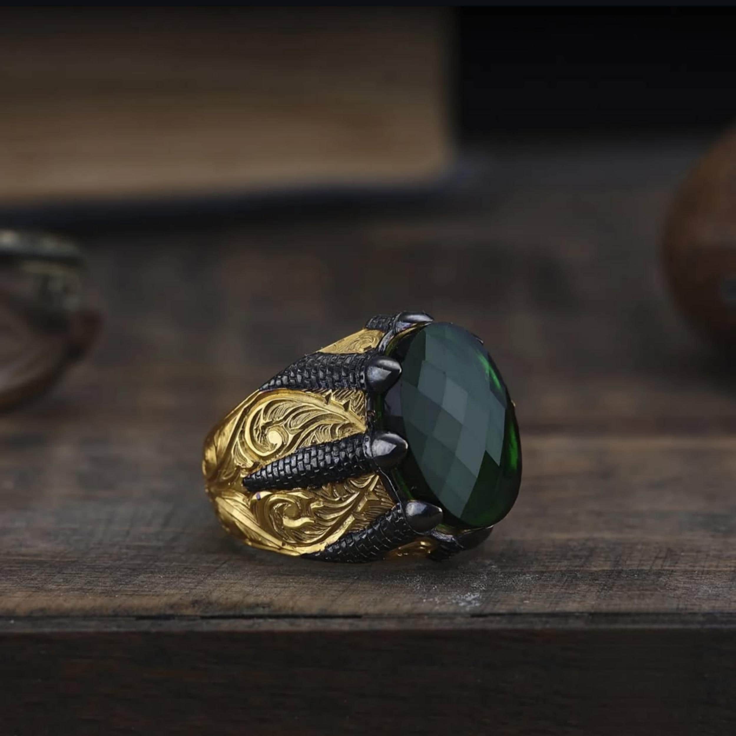 This bold men’s ring features a deep green zircon stone set in a powerful claw (talon) design, symbolizing strength, protection, and dominance.