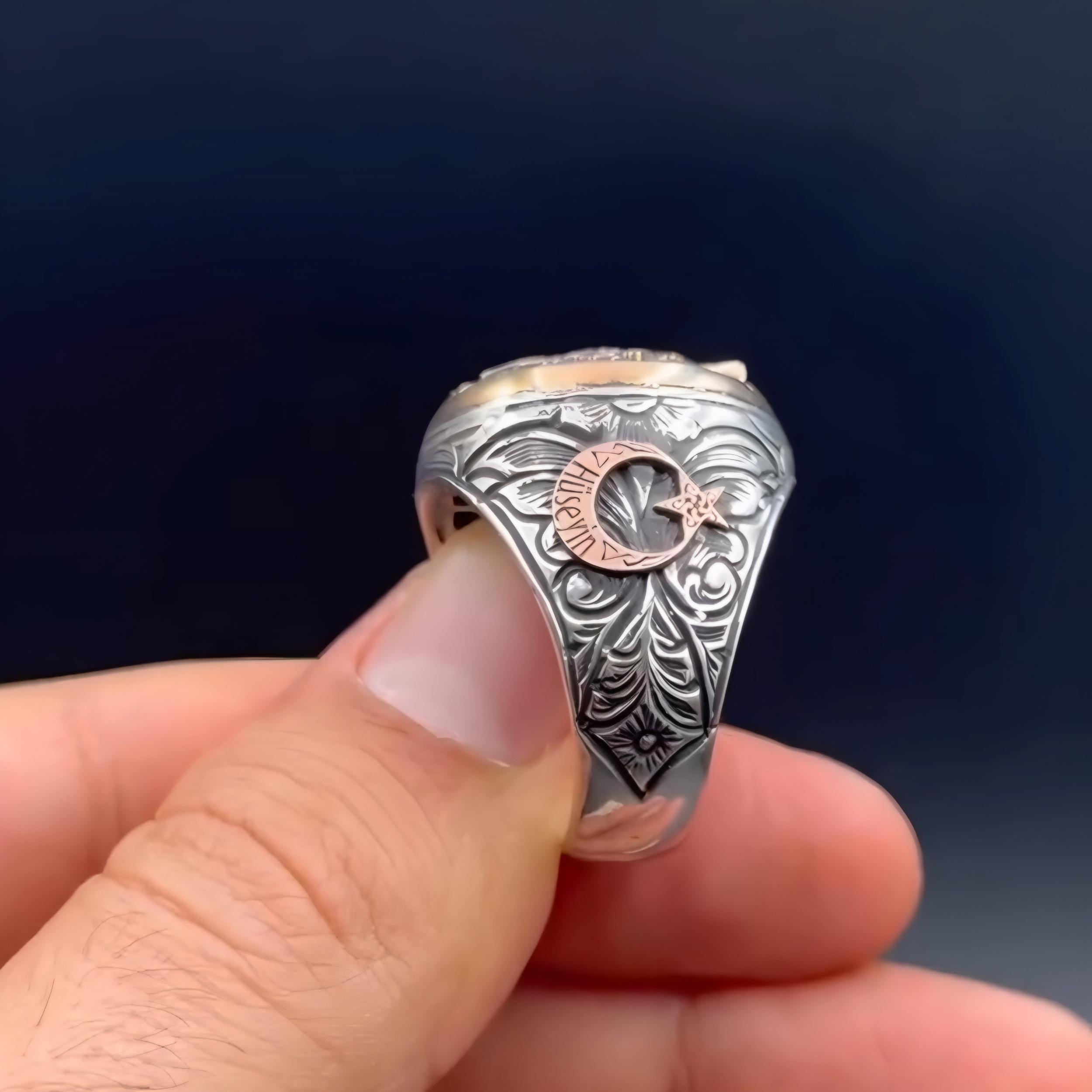 One side of the ring is engraved with the Oghuz Khan Seal, representing ancestry and sovereignty, while the other side features the Turkish Crescent and Star.