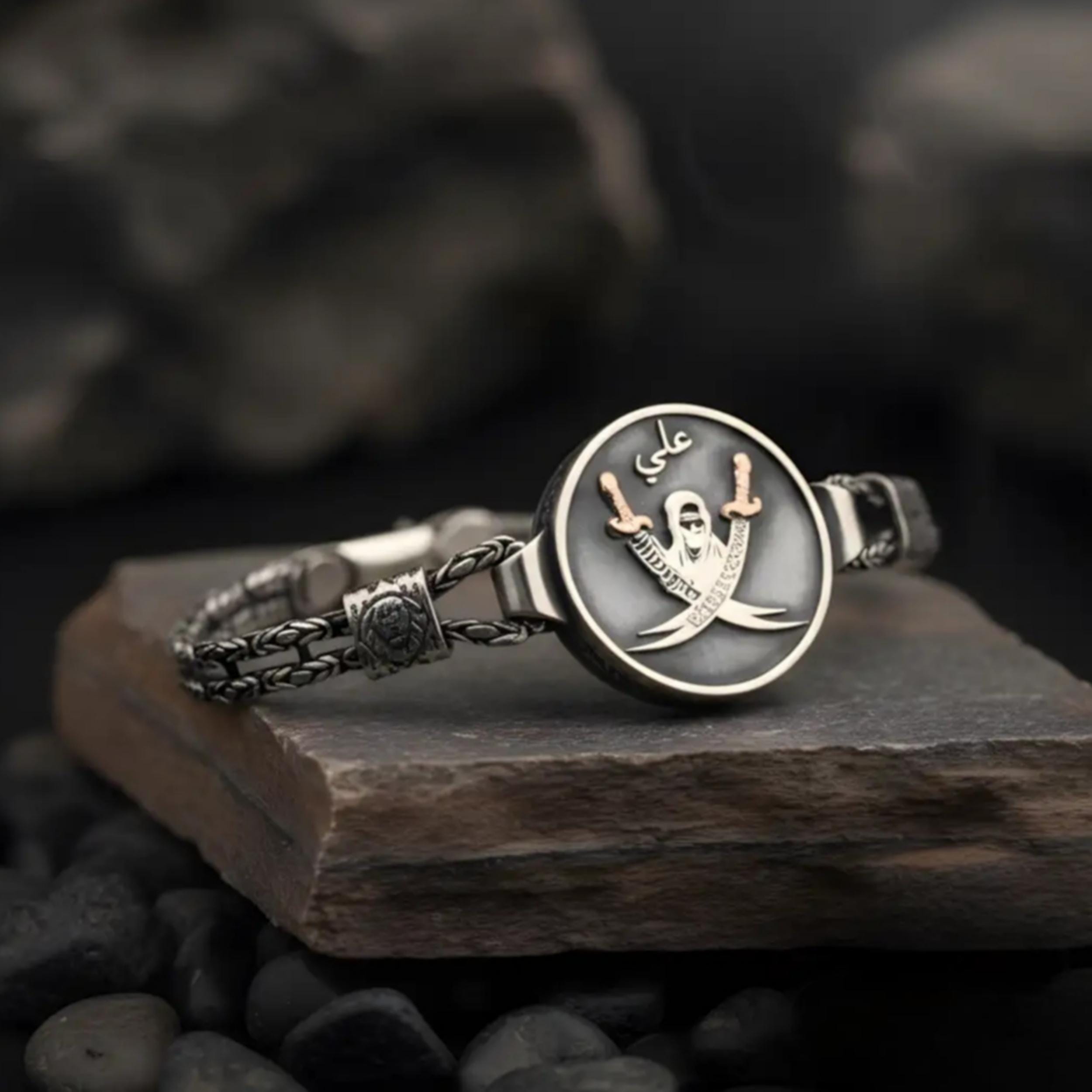 Elevate your style with this unique, handcrafted 925 Sterling Silver Double-Sided Bracelet featuring the iconic Zulfiqar Sword and the Lion of Allah symbol.