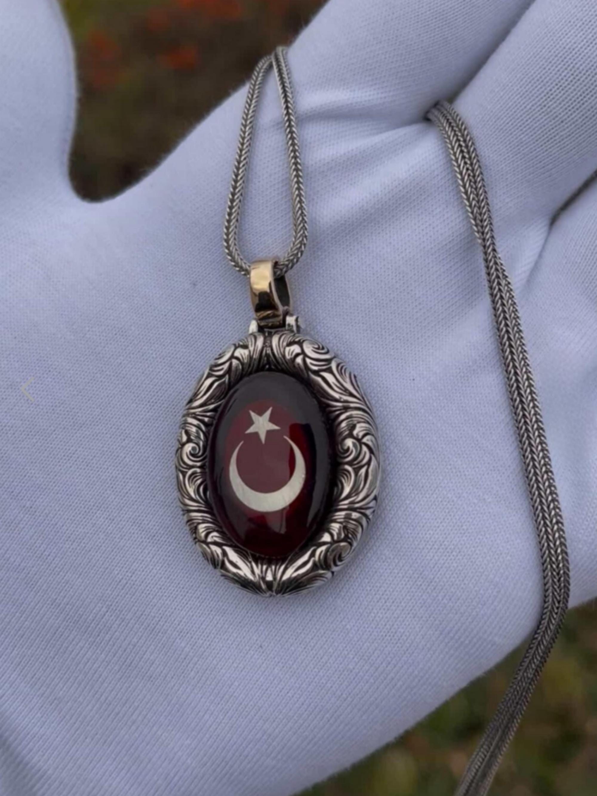 Front Side: A deep, vibrant Red Amber stone featuring a precision-inlaid Silver Crescent and Star, symbolizing the noble Turkish heritage.