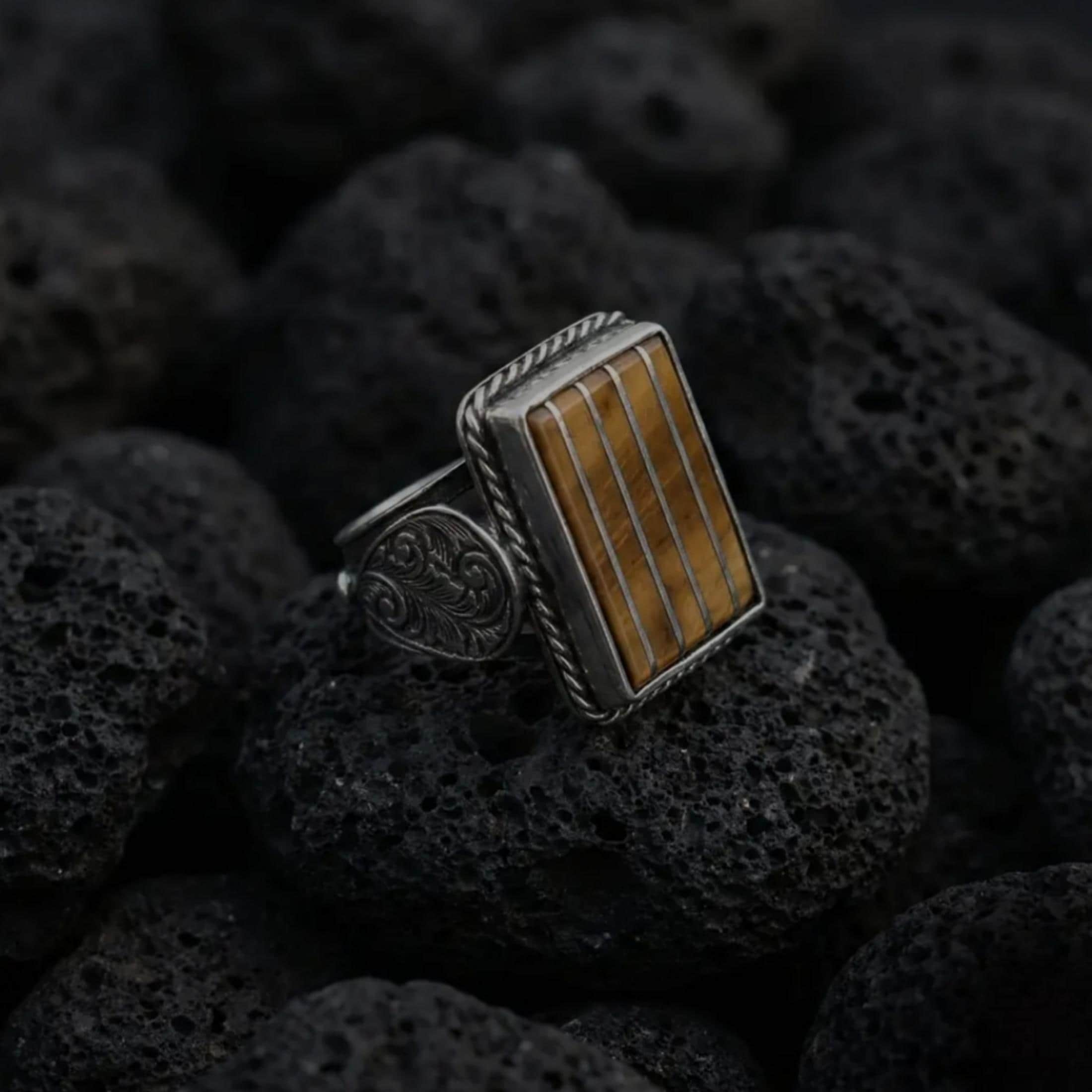 The natural grain of the amber radiates a golden glow when it catches the light, lending the ring both nobility and mystical power.