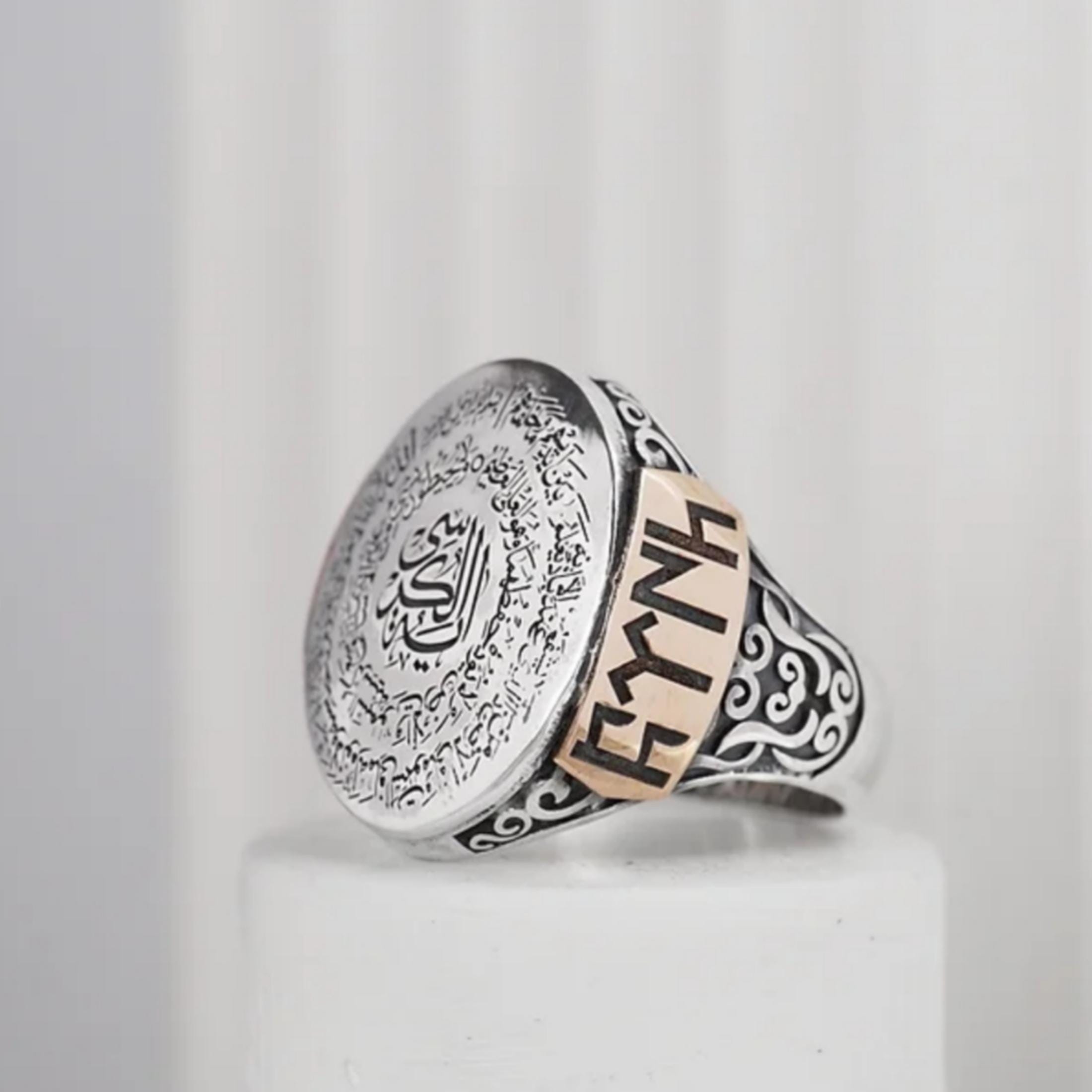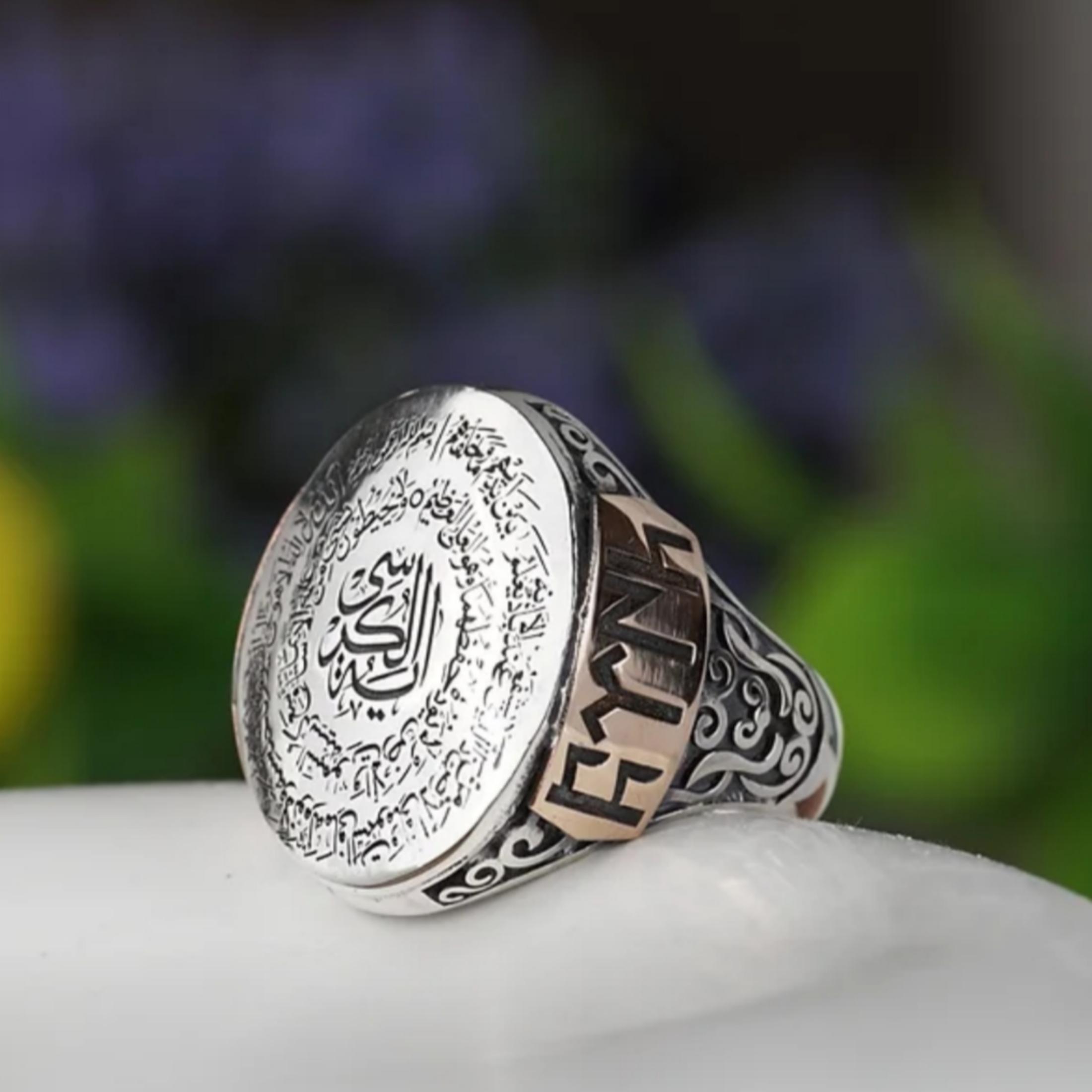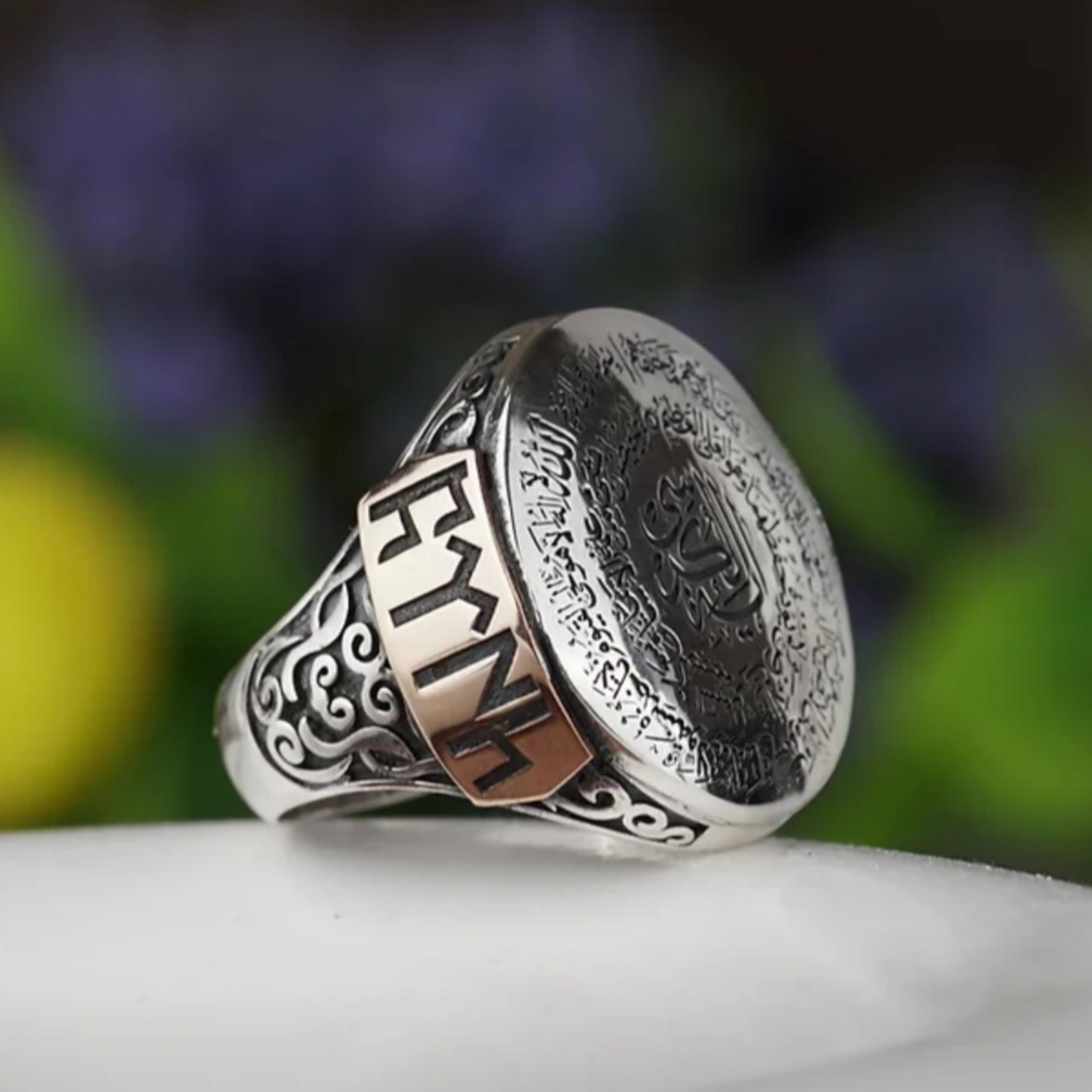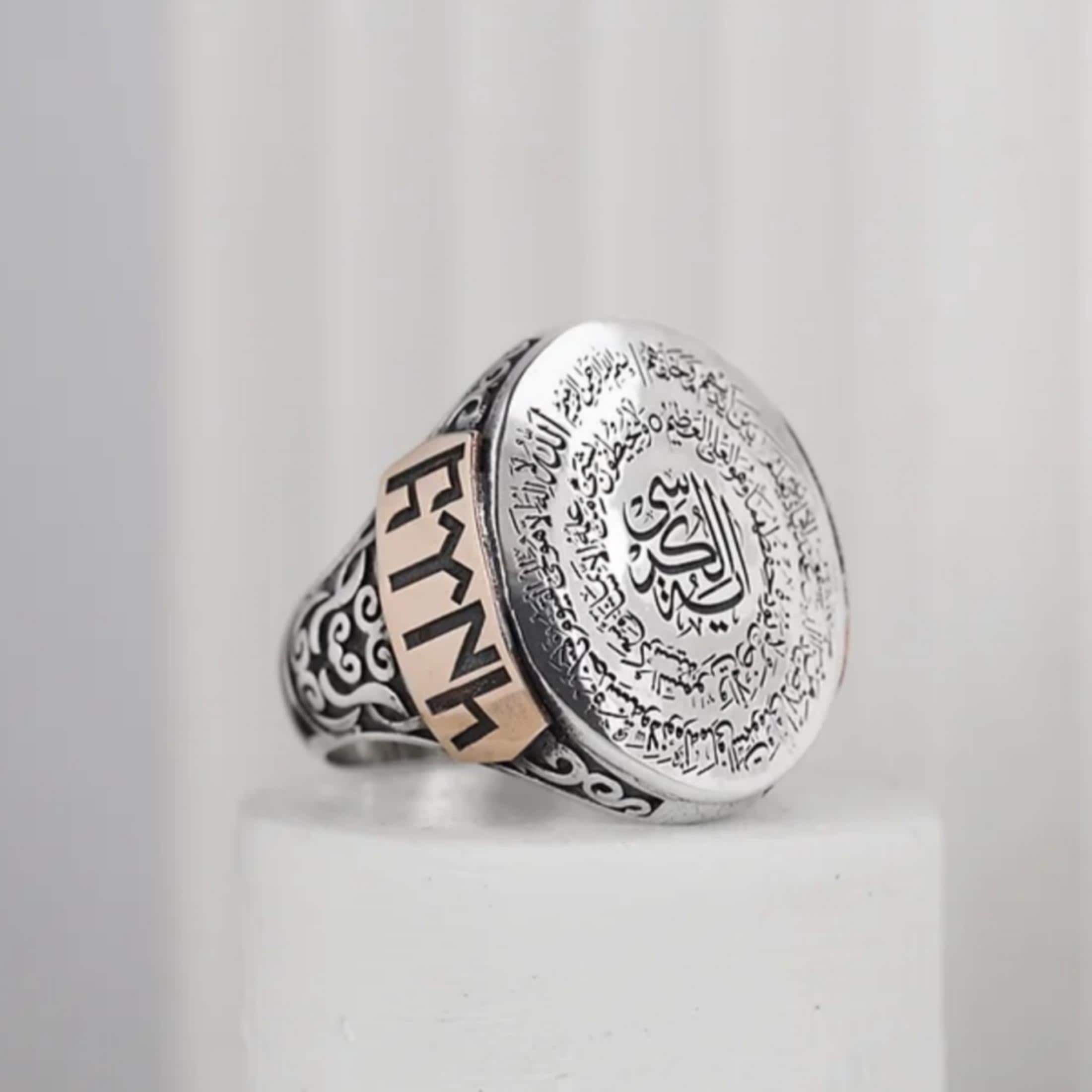 The center area can be personalized with a custom Arabic or Turkish name, making this ring a meaningful and powerful symbol of faith, protection, and identity.