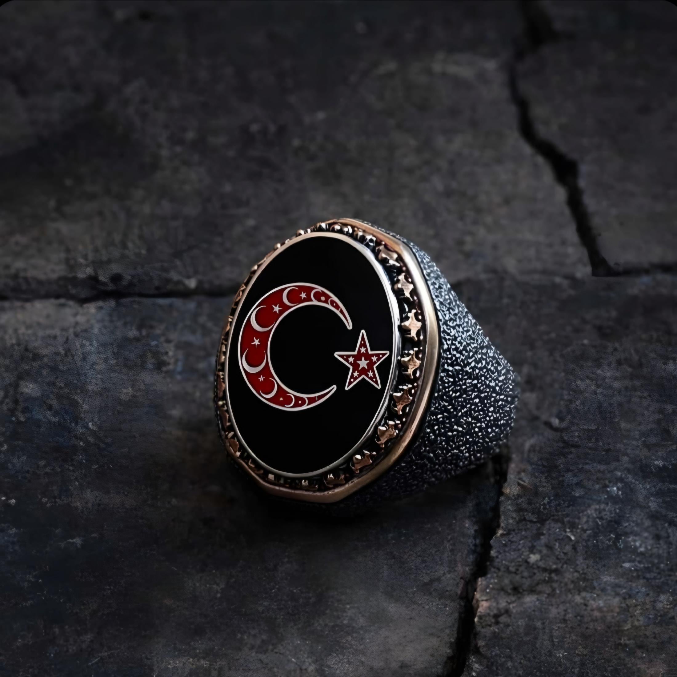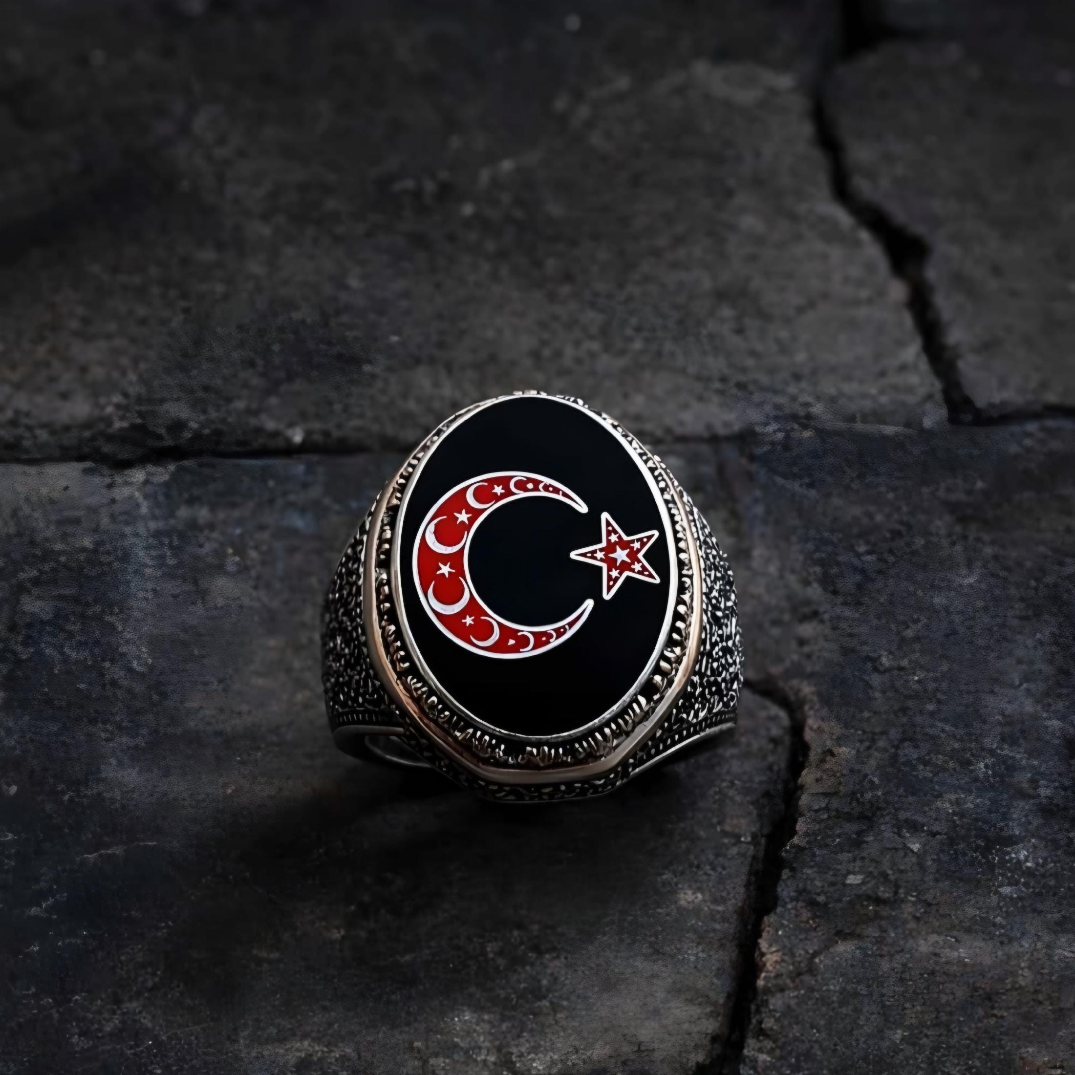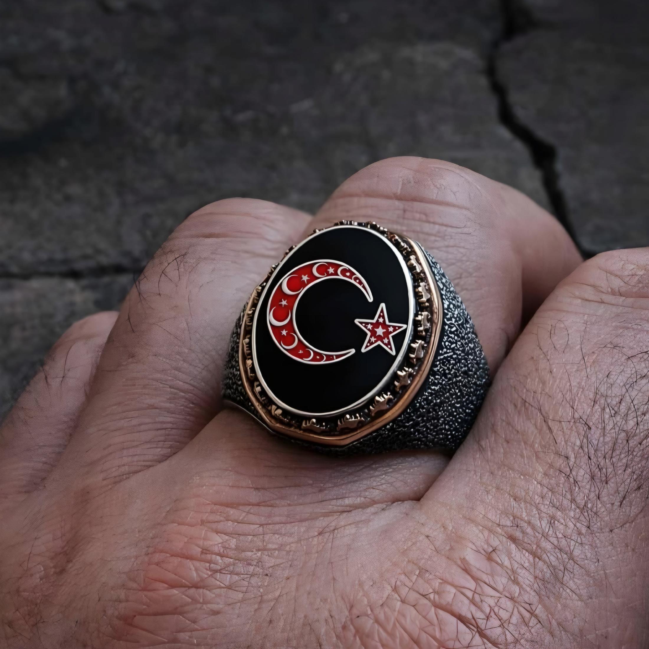 The bold Moon and Star (Ay Yıldız) emblem is carefully engraved on the top, symbolizing honor, spirituality, and timeless masculinity. Designed for men who prefer meaningful jewelry with a powerful presence, this ring combines traditional symbolism with a modern statement look.
