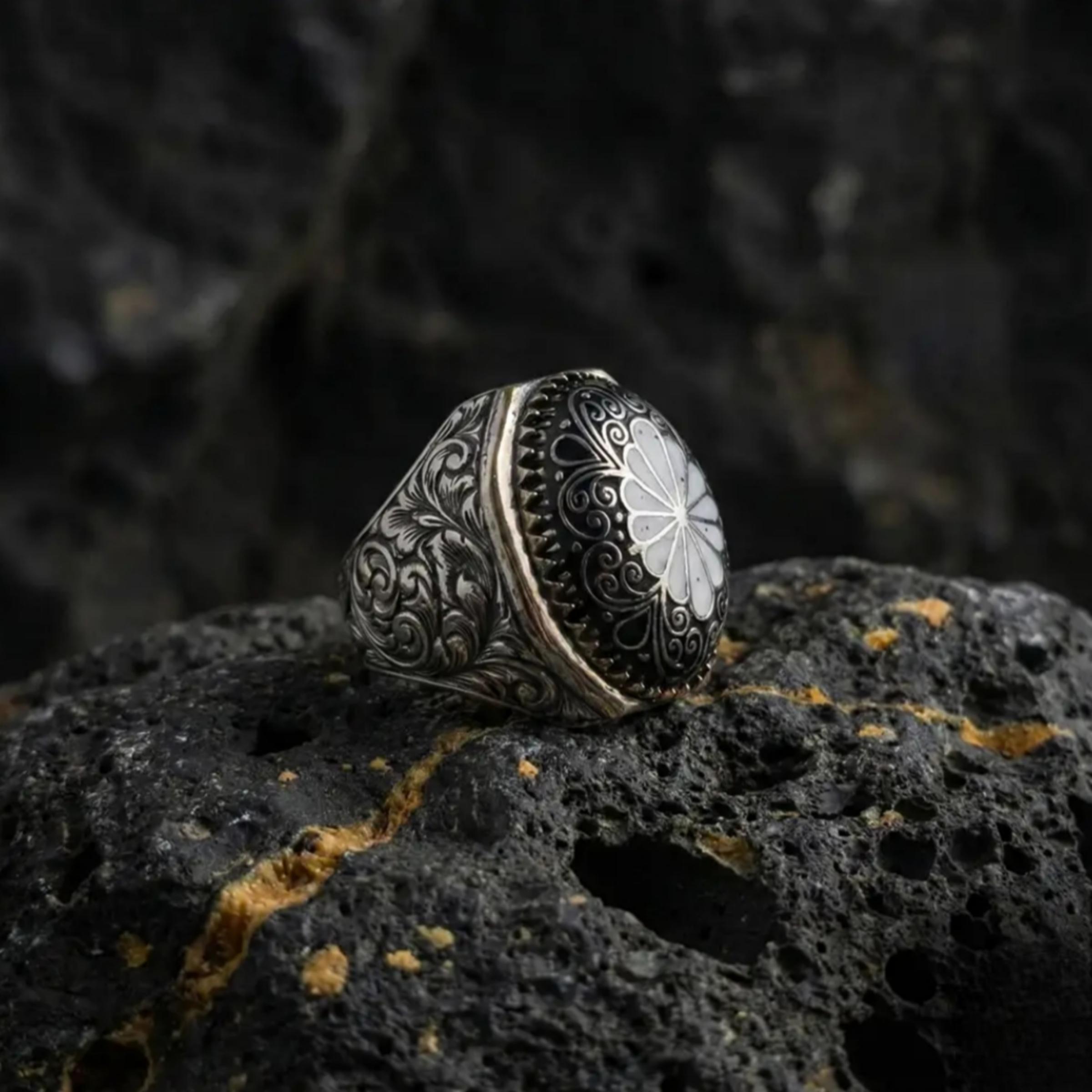 This isn't just a ring; it's a blend of nature’s purity and master craftsmanship. Featuring a radiant Mother of Pearl centerpiece, this ring captures light from every angle, offering a unique play of colors that changes with your movement.