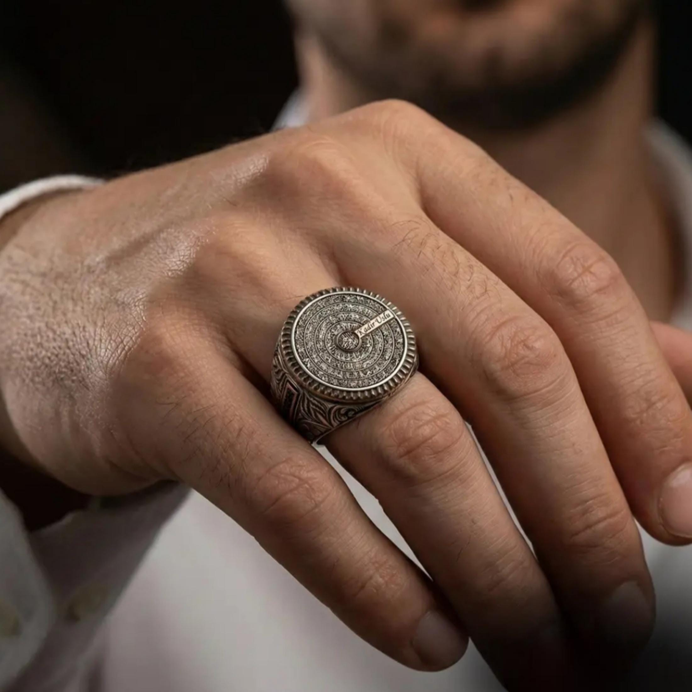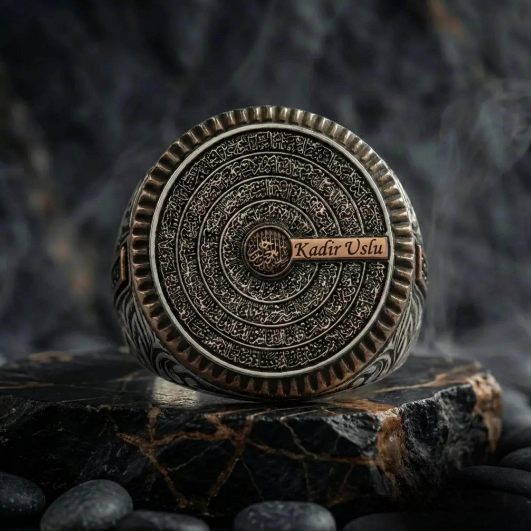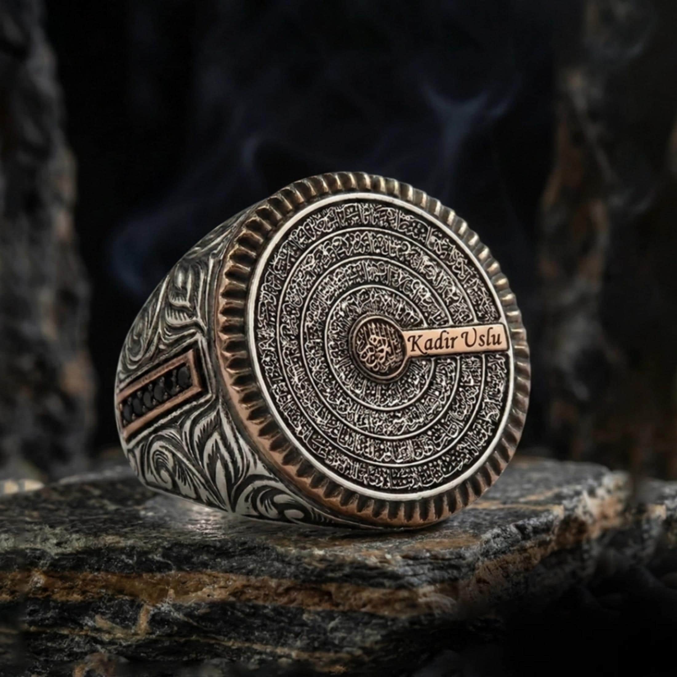 This handcrafted 925 sterling silver men’s ring features the powerful Ayatul Kursi (Ayetel Kürsi) engraved in a detailed circular design symbolizing eternity, unity, and divine protection.