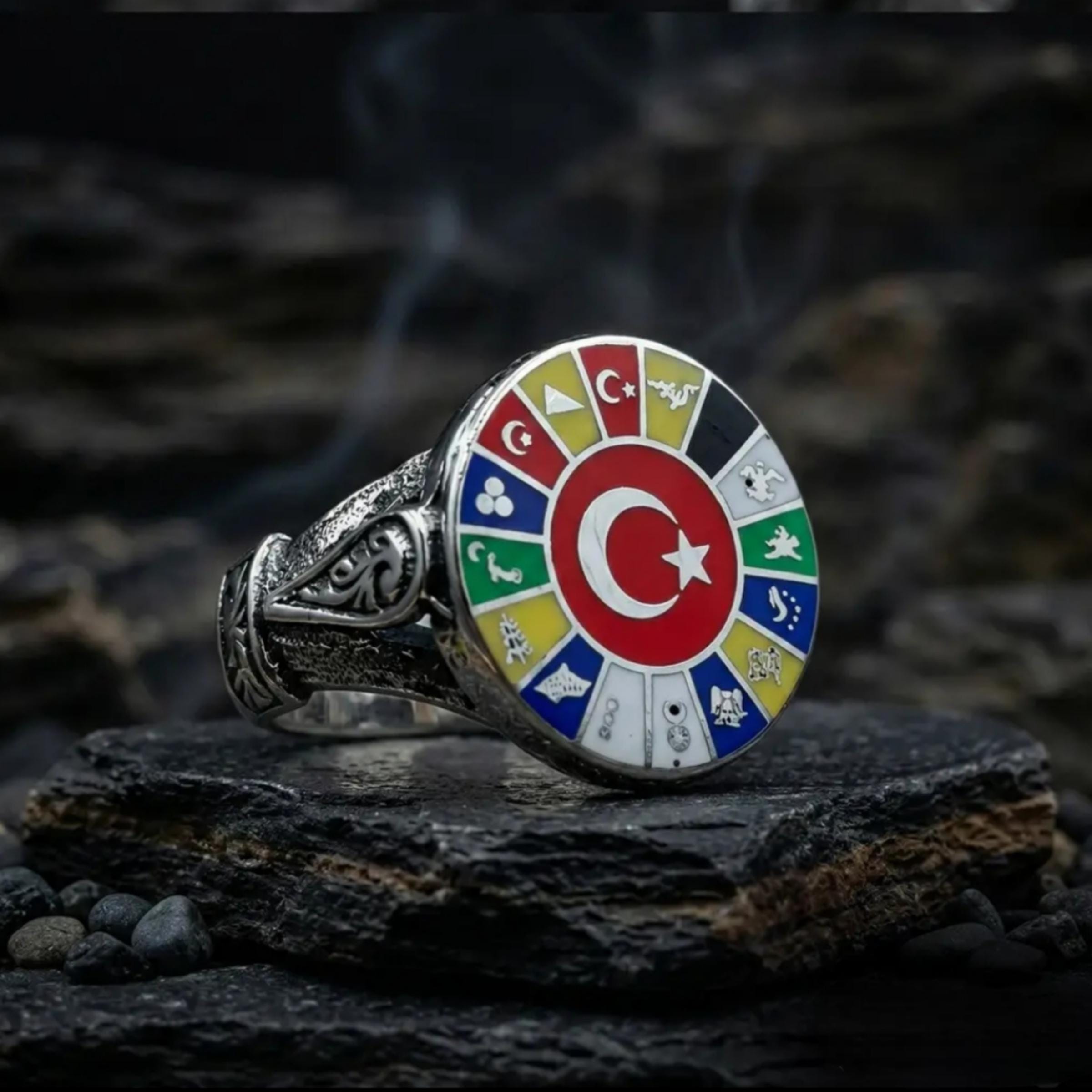 This powerful 925 sterling silver ring features the iconic crescent and star at its center, surrounded by the symbols of the 16 Great Turkish States, representing centuries of strength, leadership, and heritage.